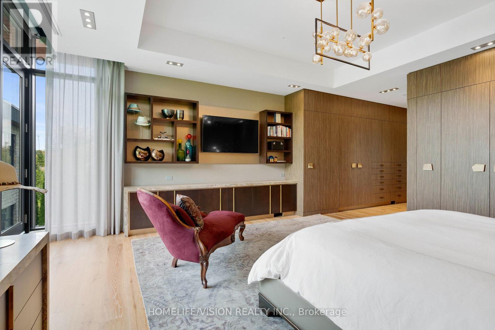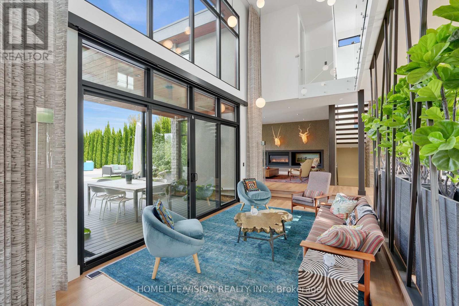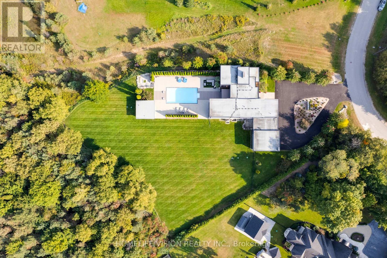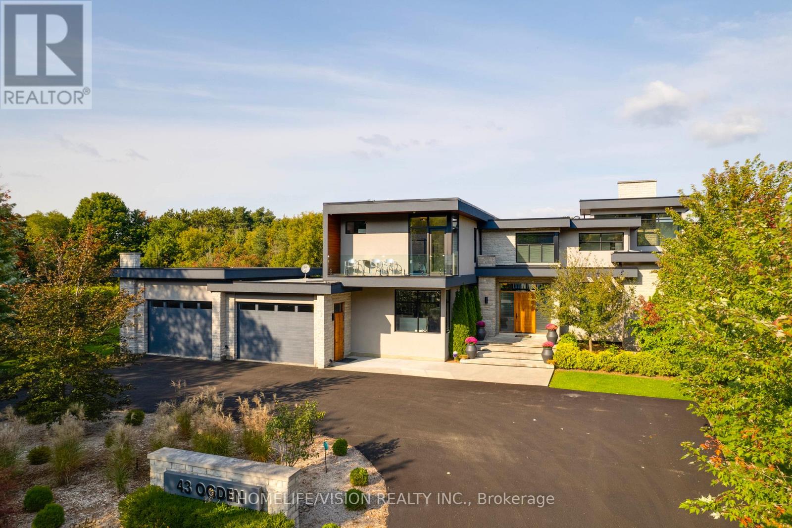 Experience luxury living at this breathtaking modern estate on 2 acres! Portions of interior masterfully designed by award winning interior designer Eric McClelland of Fleur-de-lis Interior Design Inc. The main floor boasts a contemporary kitchen with with custom cabinetry and eat in kitchen, sunken dining room with walkout to backyard, living room with floor to ceiling windows and walkout to patio, family room overlooking the garden with gas fireplace and a sun filled office with built in shelving. Master bedroom oasis with a balcony overlooking the backyard, custom built-in cabinetry and custom 6 piece ensuite with steam shower. All bedrooms have an ensuite and large windows. Meticulous maintained stone, stucco and cedar exterior with professionally landscaped gardens, outdoor saltwater pool, fire pit and cabana. Perfect for entertaining indoors and out. Spectacular basement with home theatre with full projection system, wine fridge, workout room, kitchenette and bar space. 5th bedroom in basement with custom cabinetry and ensuite as well. Elevator gives access to all floors. Dog wash station in mudroom with sink and built in cabinetry. Radiant floor heating through much of home. Automated shades in most rooms, custom lighting system with pot lights, Sonos sound system throughout! Exterior repainted and stained (2023), Outdoor decking (2023), Roof (2016), Windows (2016), A/C (2016), Furnace (2016), Sump pump (2017). (id:64974)