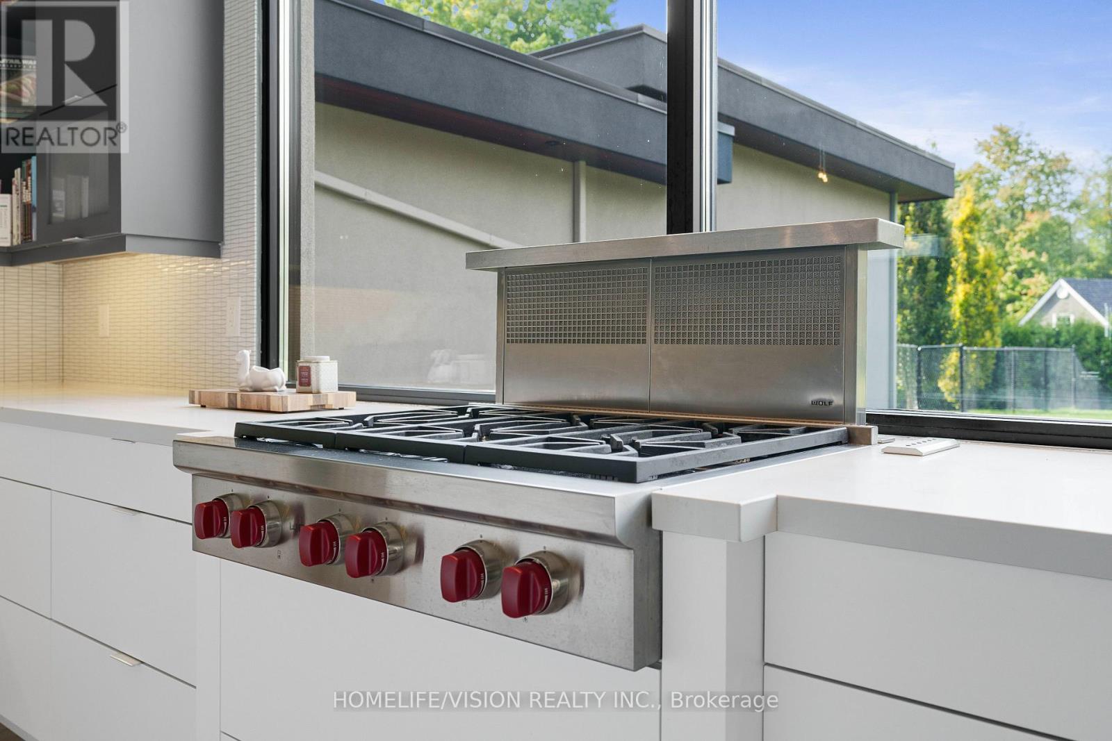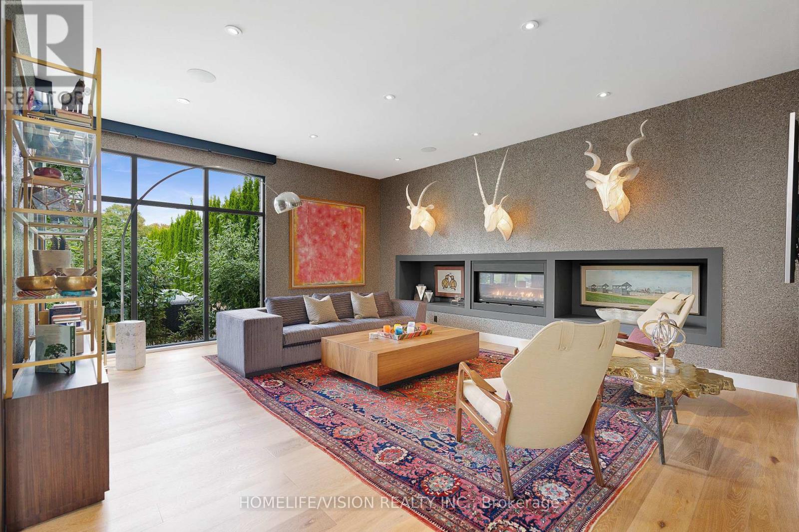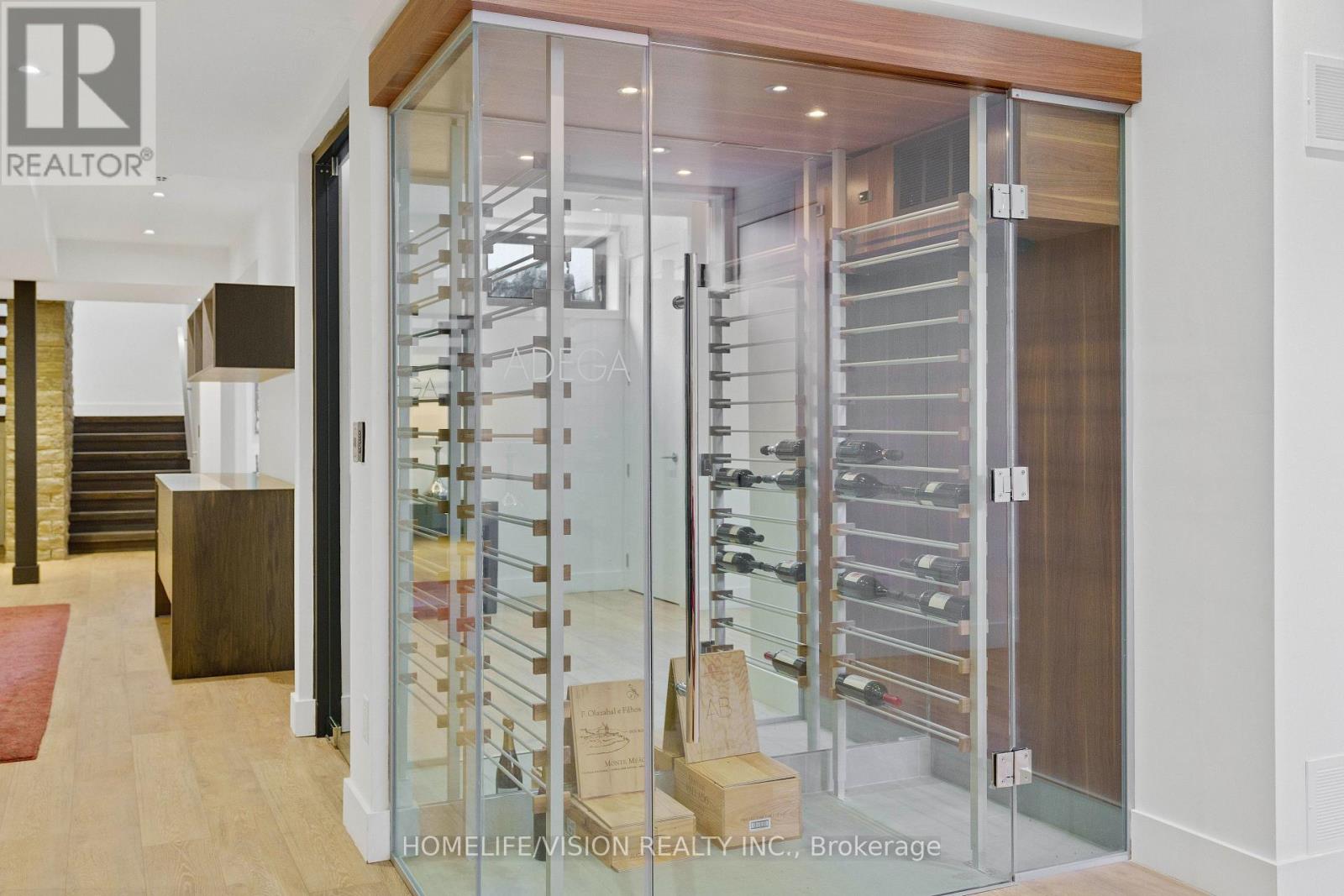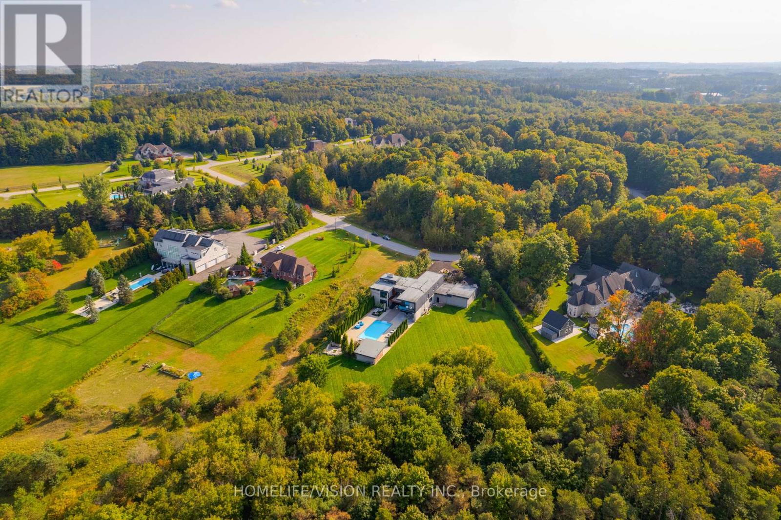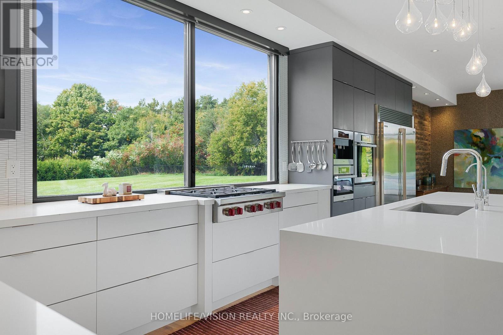Experience luxury living at this breathtaking modern estate on 2 acres! Portions of interior masterfully designed by award winning interior designer Eric McClelland of Fleur-de-lis Interior Design Inc. The main floor boasts a contemporary kitchen with with custom cabinetry and eat in kitchen, sunken dining room with walkout to backyard, living room with floor to ceiling windows and walkout to patio, family room overlooking the garden with gas fireplace and a sun filled office with built in shelving. Master bedroom oasis with a balcony overlooking the backyard, custom built-in cabinetry and custom 6 piece ensuite with steam shower. All bedrooms have an ensuite and large windows. Meticulous maintained stone, stucco and cedar exterior with professionally landscaped gardens, outdoor saltwater pool, fire pit and cabana. Perfect for entertaining indoors and out. Spectacular basement with home theatre with full projection system, wine fridge, workout room, kitchenette and bar space. 5th bedroom in basement with custom cabinetry and ensuite as well. Elevator gives access to all floors. Dog wash station in mudroom with sink and built in cabinetry. Radiant floor heating through much of home. Automated shades in most rooms, custom lighting system with pot lights, Sonos sound system throughout! Exterior repainted and stained (2023), Outdoor decking (2023), Roof (2016), Windows (2016), A/C (2016), Furnace (2016), Sump pump (2017). (id:64974)