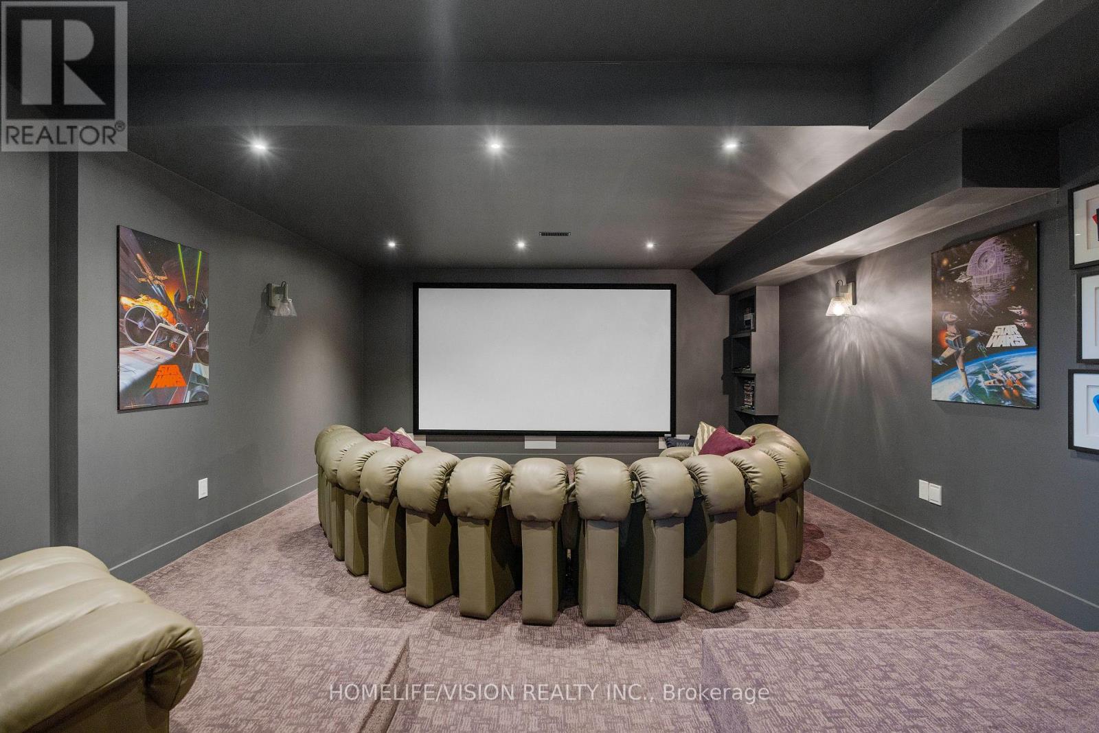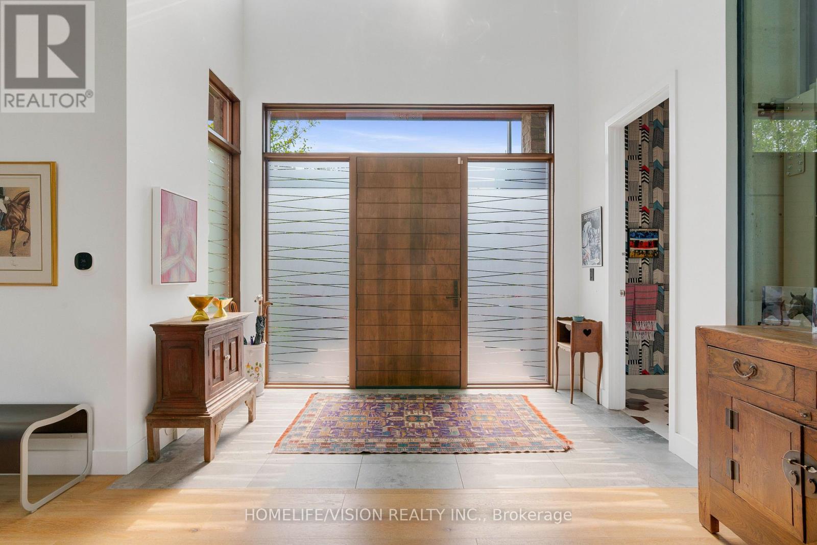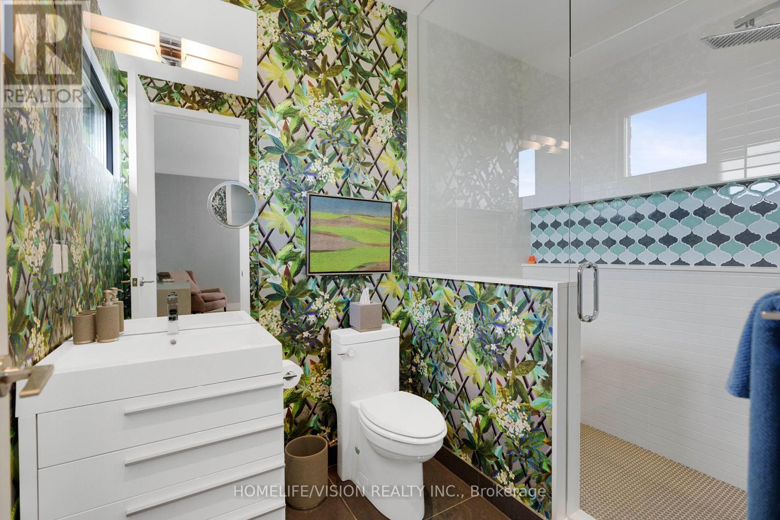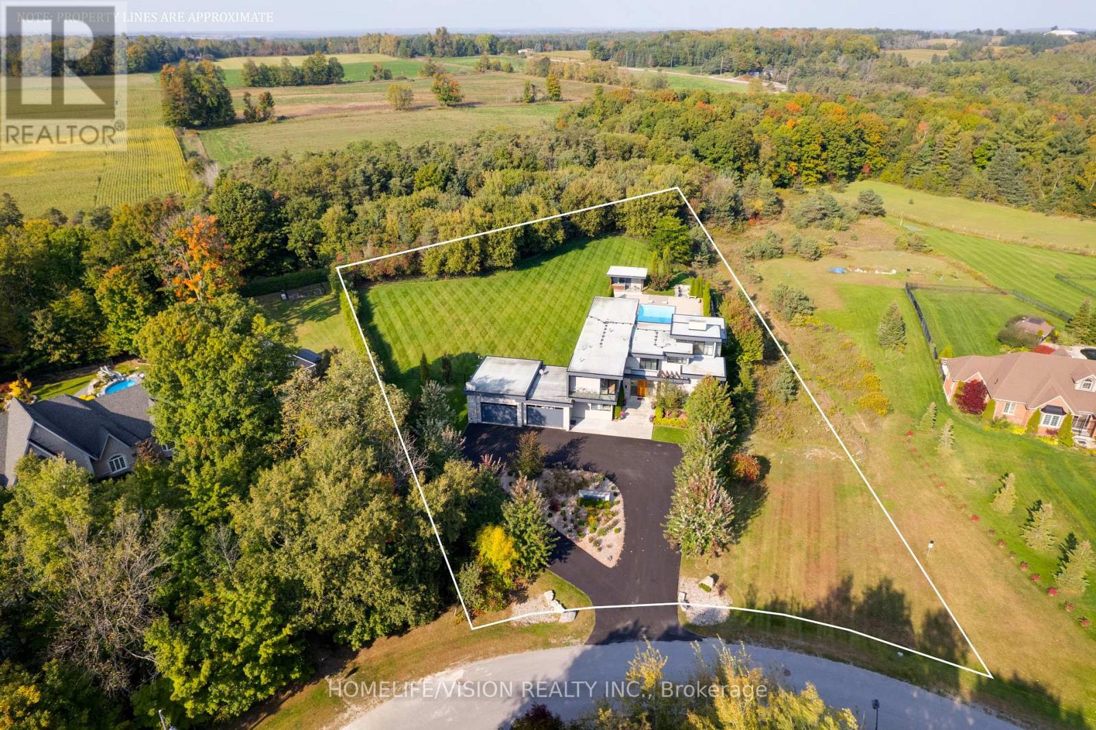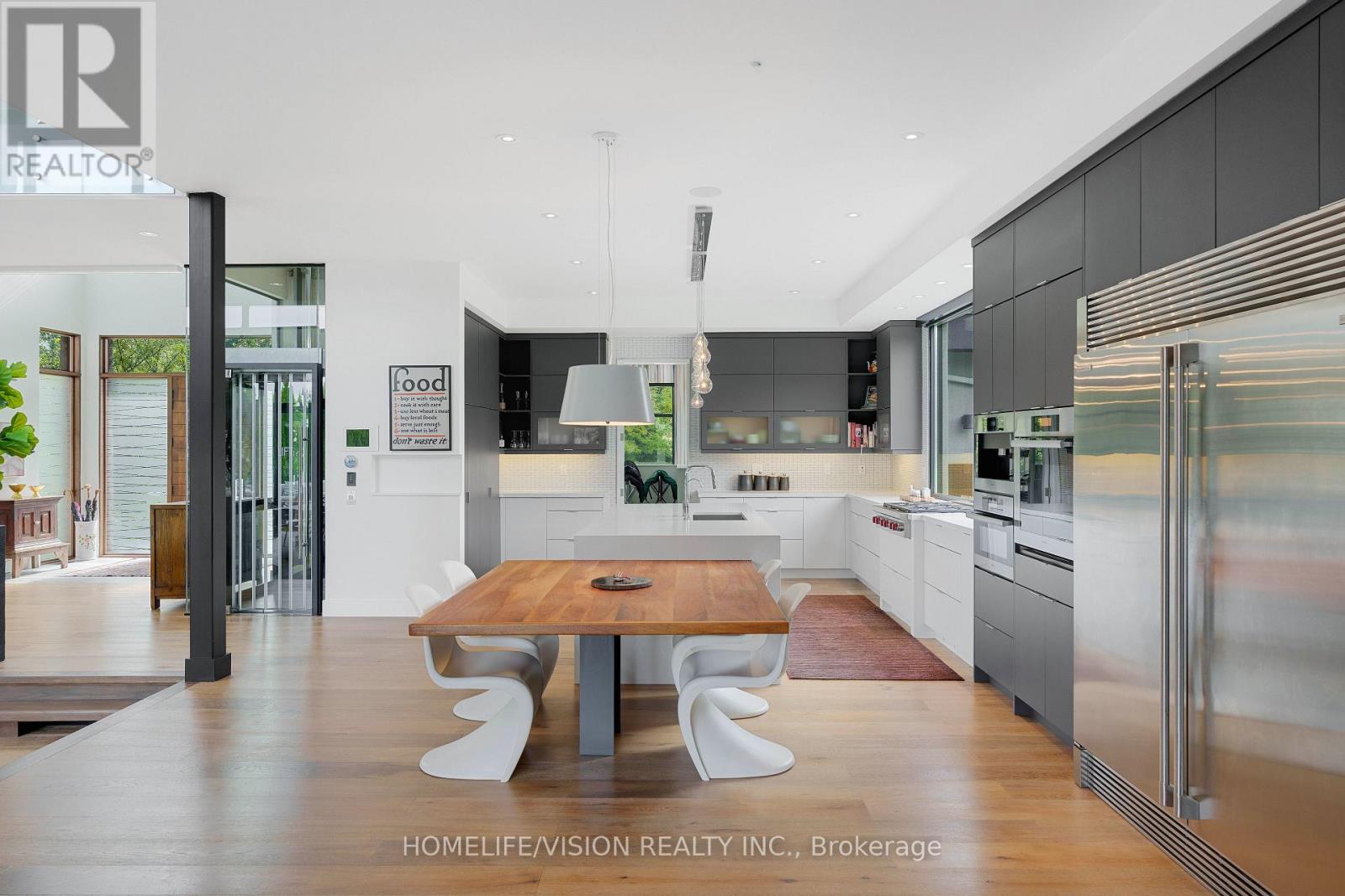 Experience luxury living at this breathtaking modern estate on 2 acres! Portions of interior masterfully designed by award winning interior designer Eric McClelland of Fleur-de-lis Interior Design Inc. The main floor boasts a contemporary kitchen with with custom cabinetry and eat in kitchen, sunken dining room with walkout to backyard, living room with floor to ceiling windows and walkout to patio, family room overlooking the garden with gas fireplace and a sun filled office with built in shelving. Master bedroom oasis with a balcony overlooking the backyard, custom built-in cabinetry and custom 6 piece ensuite with steam shower. All bedrooms have an ensuite and large windows. Meticulous maintained stone, stucco and cedar exterior with professionally landscaped gardens, outdoor saltwater pool, fire pit and cabana. Perfect for entertaining indoors and out. Spectacular basement with home theatre with full projection system, wine fridge, workout room, kitchenette and bar space. 5th bedroom in basement with custom cabinetry and ensuite as well. Elevator gives access to all floors. Dog wash station in mudroom with sink and built in cabinetry. Radiant floor heating through much of home. Automated shades in most rooms, custom lighting system with pot lights, Sonos sound system throughout! Exterior repainted and stained (2023), Outdoor decking (2023), Roof (2016), Windows (2016), A/C (2016), Furnace (2016), Sump pump (2017). (id:64974)