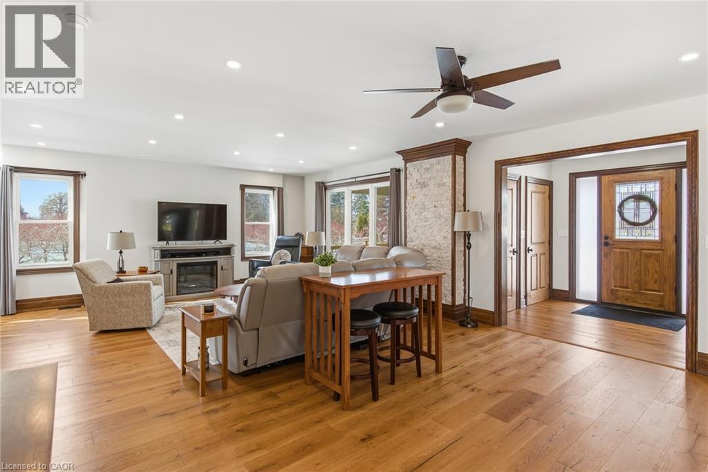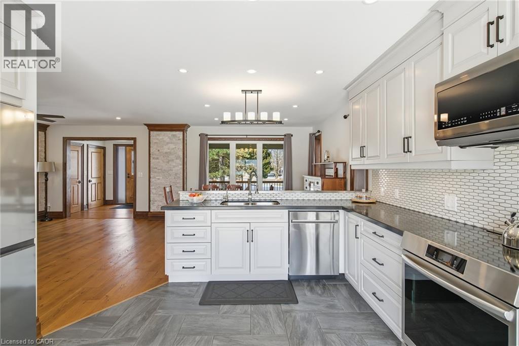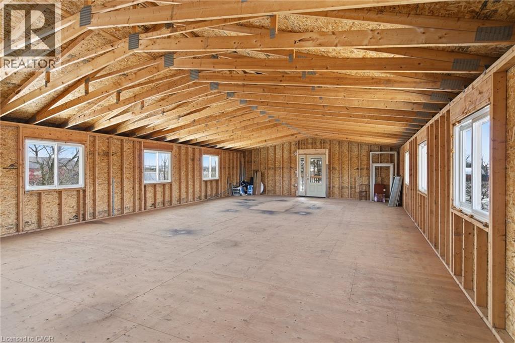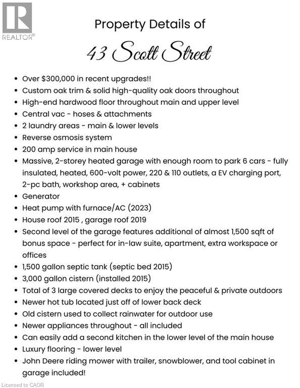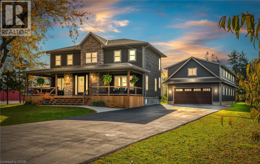 Experience the pinnacle of craftsmanship in this impeccably rebuilt Niagara-on-the-Lake estate. Nestled on close to 3/4 acre rural lot, this 5 bedroom, 4 bathroom custom home with over 3,000 finished sqft is for the discerning buyer who values true solid and quality construction. PLEASE SEE PHOTO #3 FOR MORE PROPERTY DETAILS & INCLUSIONS. In the main residence, you will find warm deep wood trims, gleaming hardwood floors, large open living + dining spaces with many windows to bring in the light from all sides of the home. Chef’s kitchen is outfitted with stone countertops, under-mount sink, and top-tier cabinetry, open to the backyard, hot tub, and in the distance, mature trees + a fire pit to enjoy those family summer evenings. There are 3 outdoor covered porch spaces to enjoy. The upper level includes 4 bedrooms on one floor, perfect for families, & 2 bathrooms including an ensuite and walk-in closet with built-ins. There are 2 laundry areas conveniently located. The lower level is completely finished with hi-end luxury flooring and includes living room, bedroom + bathroom, and additional storage. BONUS PROPERTY FEATURES: IMMACULATE INSULATED 6 CAR HEATED GARAGE, EV charger, workshop including bathroom, 600 volt power for 220 & 110 outlets. Perfect for any home based business. Plus EXTRA BONUS (Rarely Offered): 2nd level space - almost 1500 sqft! Ready to be transformed to a luxury guest house, second residence, or home based offices. Unbeatable location in Niagara-on-the-Lake - close to world class theatre, wineries, + dining experiences. A peaceful retreat, yet very close to all modern amenities. Huge opportunity here - MUST SEE!! **INCLUDED: John Deere Riding Mower with Trailer, tool cabinet in garage, snowblower, all appliances as seen in photos**and so much more!!! (id:64974)