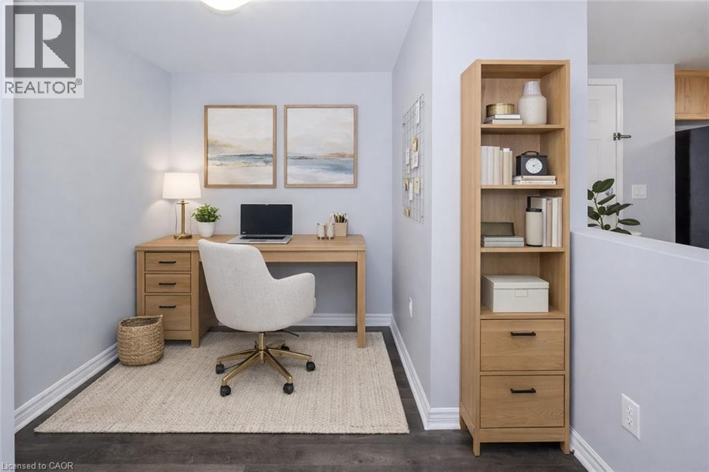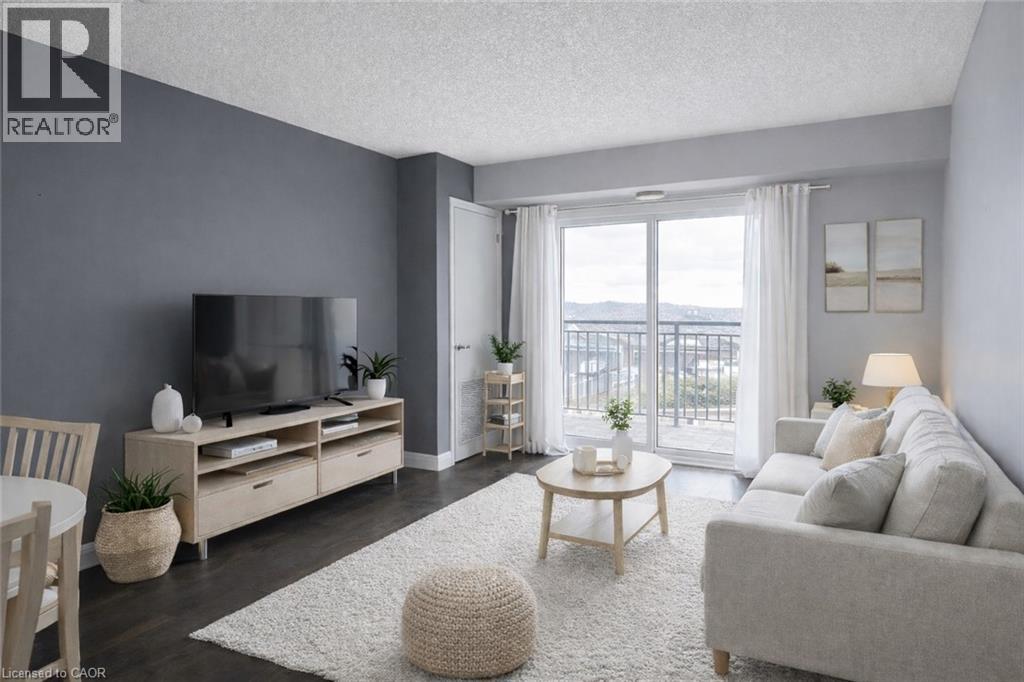 Welcome to 402-43 Waterford Drive. This bright and beautifully designed top floor 2 bedroom + den condo offers 852 square feet of thoughtfully laid-out living space. With an open-concept kitchen and living area, this unit is perfect for everyday living. The kitchen is equipped with brand new stainless steel appliances (2026), quartz countertops, and tile backsplash, offering a modern and practical space for everyday use. The den adds flexibility and can be used as a home office, study area, or additional storage space. A private balcony extends the living area providing a comfortable outdoor retreat and is the perfect spot for watching the sunset. Conveniently located with quick access to Highway 6 and the 401, this property is ideal for commuters seeking easy highway connectivity. This unit is a great opportunity for those looking for low-maintenance condo living in a well-connected location. (id:64974)