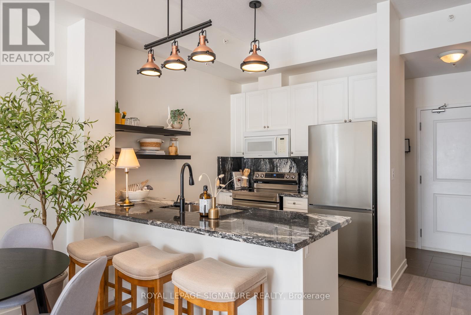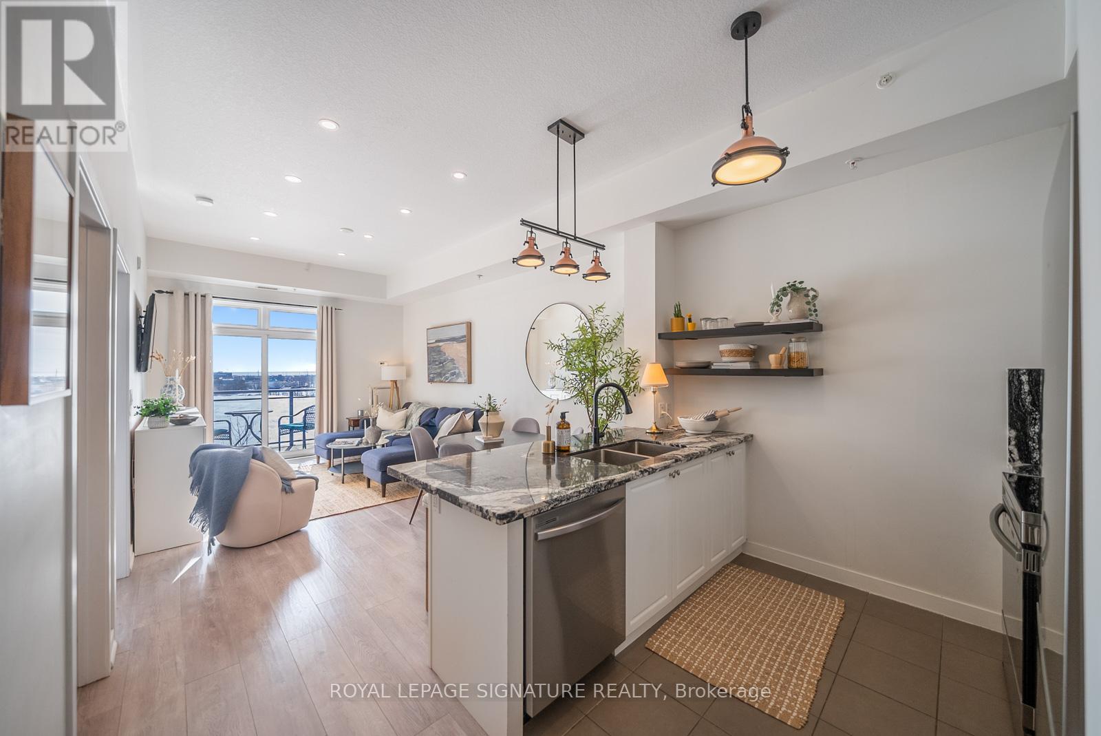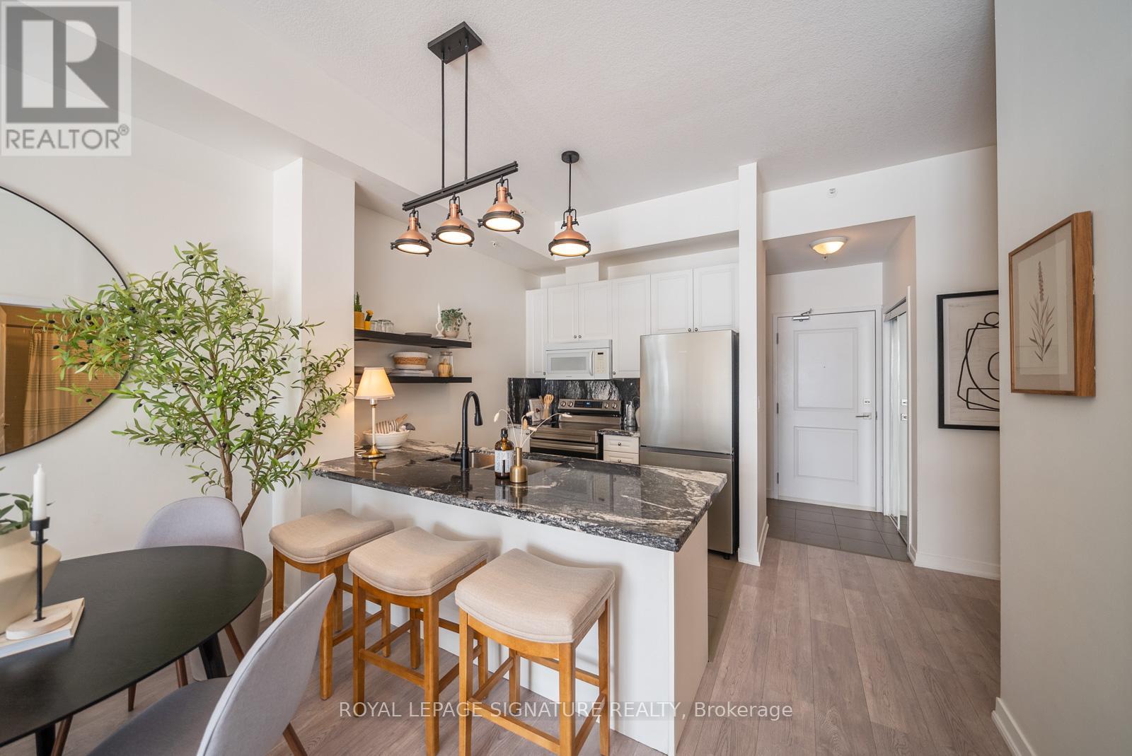 Welcome to this bright and stylish 1-bedroom + large den condo in one of Burlington's most convenient and sought-after communities. Enjoy unobstructed south-facing views that fill the space with natural light and create a warm, inviting atmosphere throughout. The open-concept layout features a modern kitchen complete with brand new stainless steel appliances, contemporary finishes and trendy light fixtures. The spacious den offers incredible versatility, perfect for a kids bedroom, work from home office, or bonus living space to suit your lifestyle. The building features a movie/games room, gym and beautiful rooftop patio, perfect for those sunny days. Conveniently located, allowing you to be just minutes from the QEW and Hwy 407, with shopping, restaurants, parks, schools, and the community centre all within walking distance, making everyday living effortless. (id:64974)