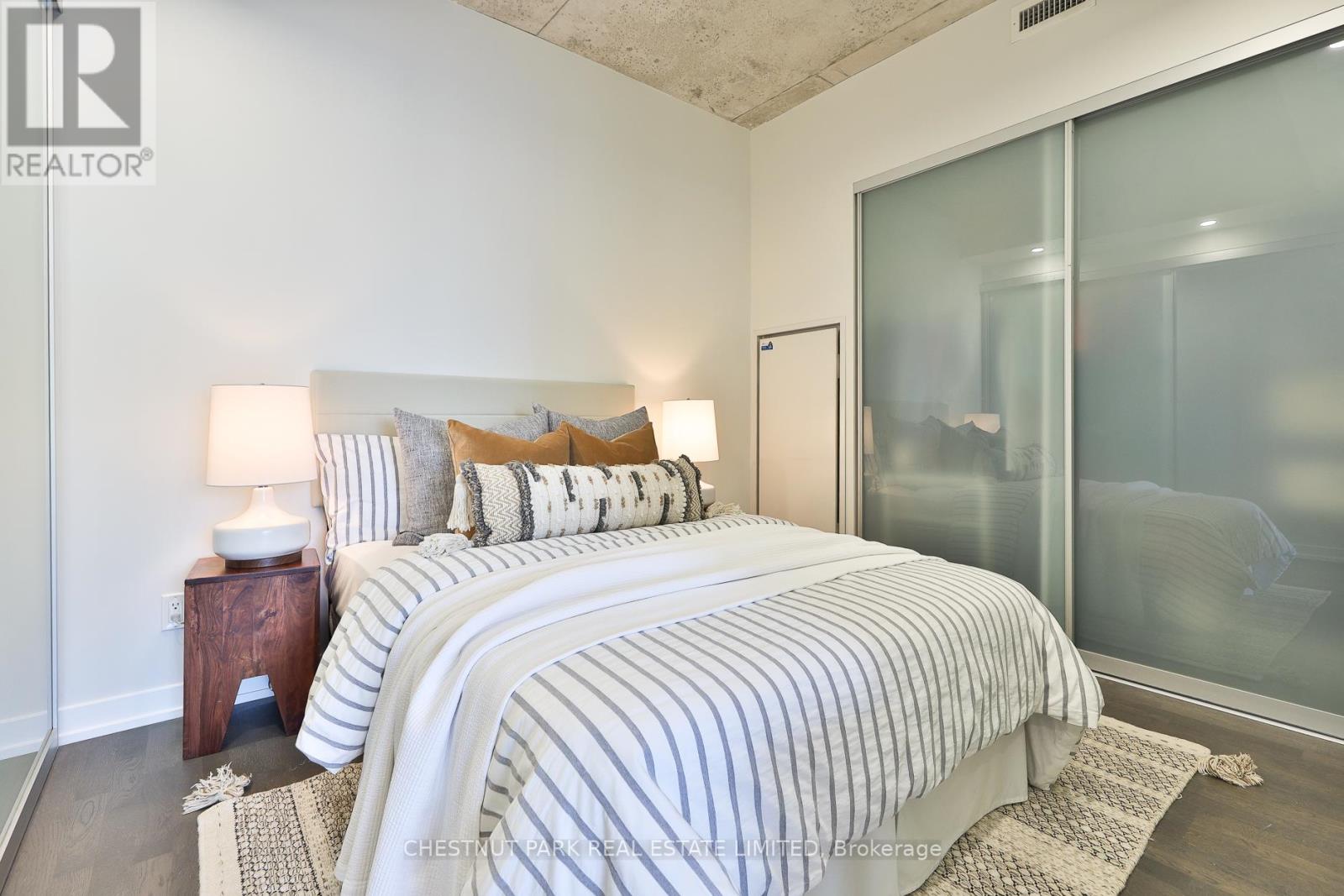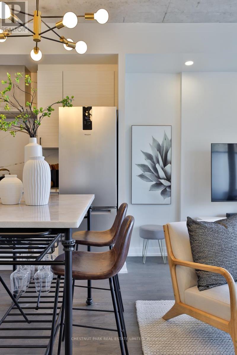 Stylish and functional two bedroom residence in the heart of King West, offering the perfect balance of comfort and convenience. This thoughtfully designed suite features a well laid out floor plan with open concept living and dining space, ideal for both everyday living and entertaining. The newly custom renovated kitchen is a true highlight, showcasing upgraded finishes, quality cabinetry, and enhanced functionality for modern living. It flows seamlessly into the main living area, creating a bright and inviting atmosphere. Exceptionally unique in design, this unit has only one shared wall and enjoys both south and north facing windows, allowing for excellent cross ventilation and an abundance of natural light throughout the day. Two well proportioned bedrooms provide flexibility for professionals, couples, or those seeking a dedicated home office. A beautifully finished full bathroom completes the space. Overlooking St. Andrew's park with off-leash dog area and playground. Parking and locker are included, a rare and valuable offering in this highly sought after downtown location. Residents enjoy access to impressive building amenities in a quiet building. Steps to acclaimed restaurants, cafés, boutique shopping, transit, and vibrant nightlife, this residence delivers an exceptional urban lifestyle in one of Toronto's most dynamic neighbourhoods. An outstanding opportunity for end users seeking something truly distinctive in the city core. (id:64974)