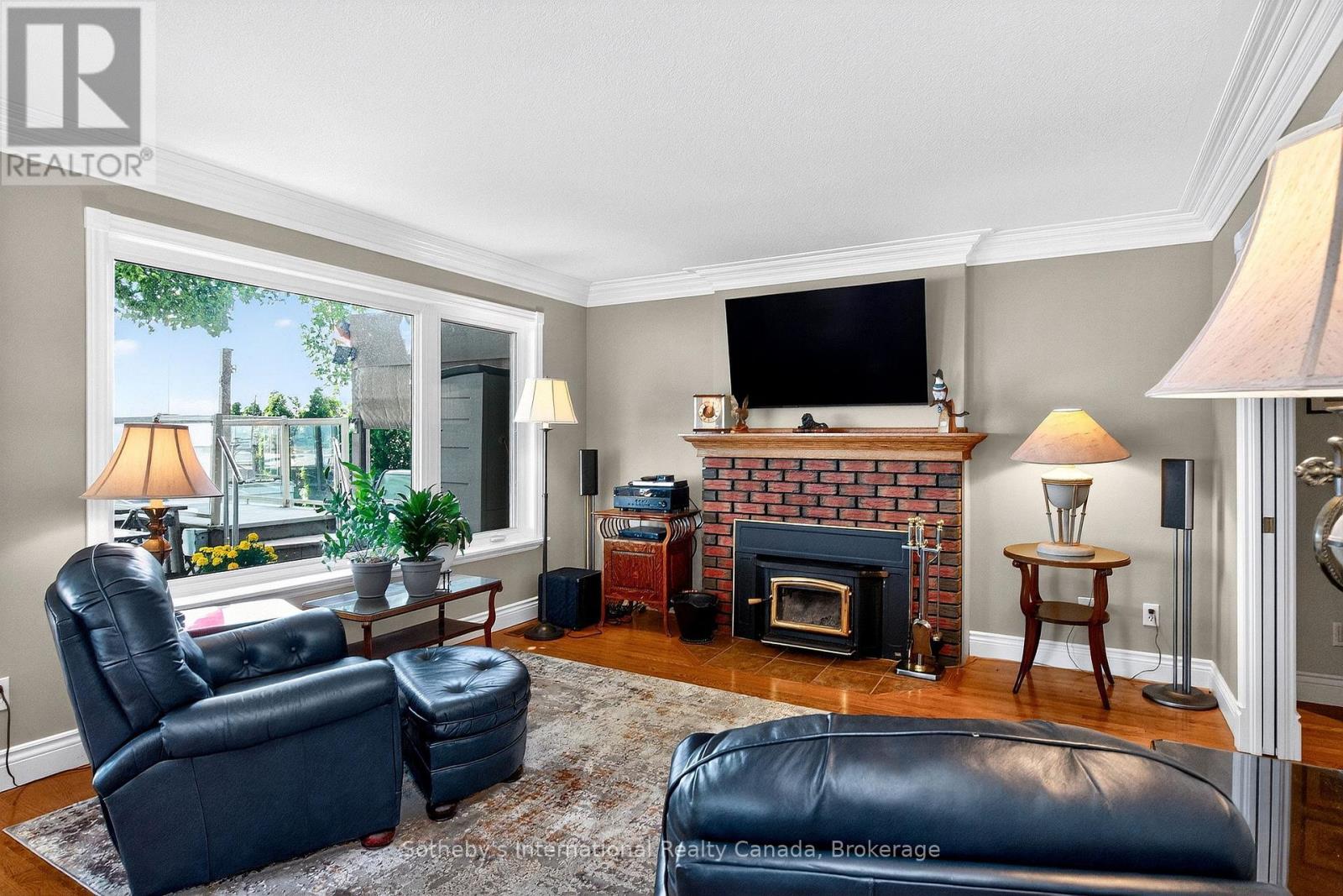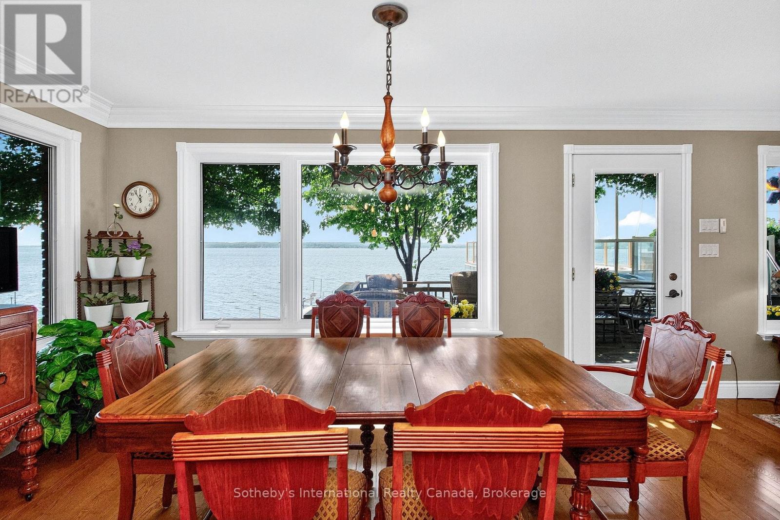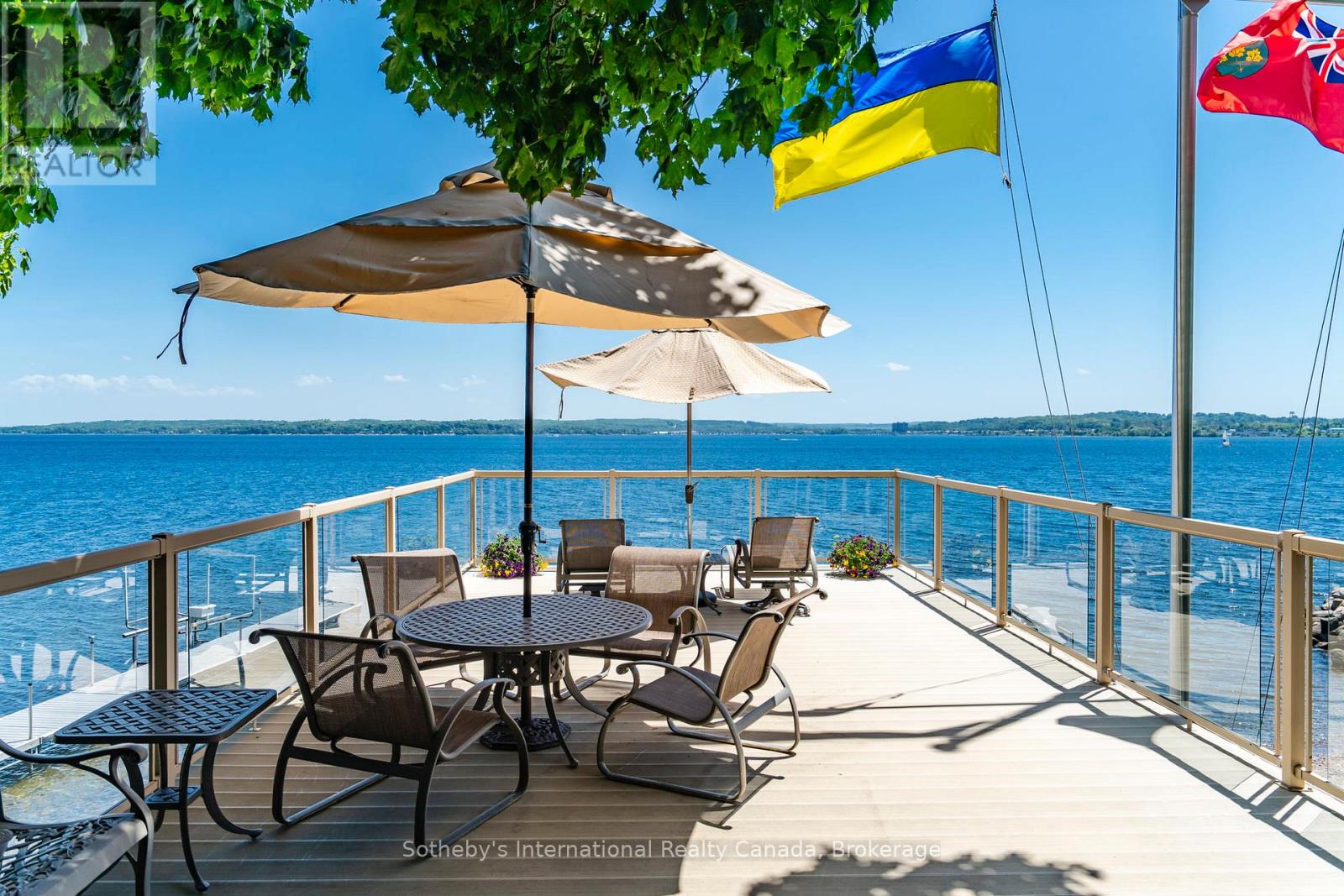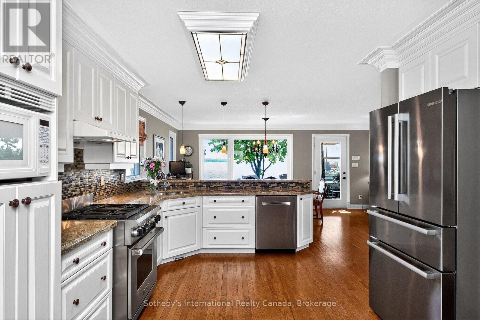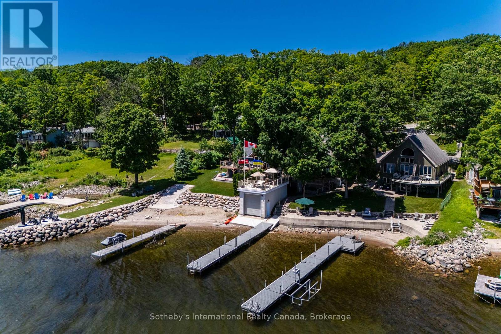 This beautifully maintained waterfront home showcases true pride of ownership. Originally redeveloped, expanded, and customized in 2004, it was thoughtfully designed with large families and entertaining in mind. Spanning three spacious levels - approx 3400 sqft, the home offers 4 bedrooms, 3 bathrooms, 2 full kitchens, 1 Dining Room, 2 family rooms, wine cellar and multiple entrances, along with a versatile office/guest space with a day bed ideal for hosting extended family or visitors. Enjoy panoramic big-water views from several outdoor living areas, including a rooftop sitting area above the large dry-dock boathouse. The waterfront features 48 feet of south-facing shoreline with a renovated concrete pier, a newer 50-foot post dock system, and generous seating zones some shaded with retractable awnings for effortless outdoor entertaining. Set on a deep 48' x 694' lot, this property also includes a serviced back lot with hydro and water perfect for parking an RV or trailer. Accessibility is a priority with wide hallways, handicap-friendly bathrooms and doors, and a high-capacity stair lift. The attached 1.5 garage plus carport, and garden shed offer ample storage and convenience. Modern utilities include natural gas, high-speed internet, a partial backup 20 KW generator. Situated on prestigious Midland Point Road, you're just 8 minutes from downtown Midland and close to shopping, dining, and local attractions. (id:64974)