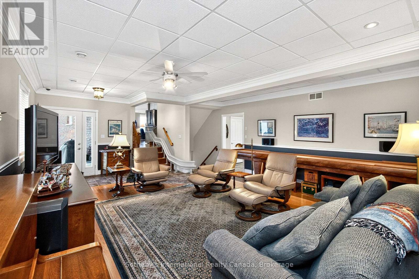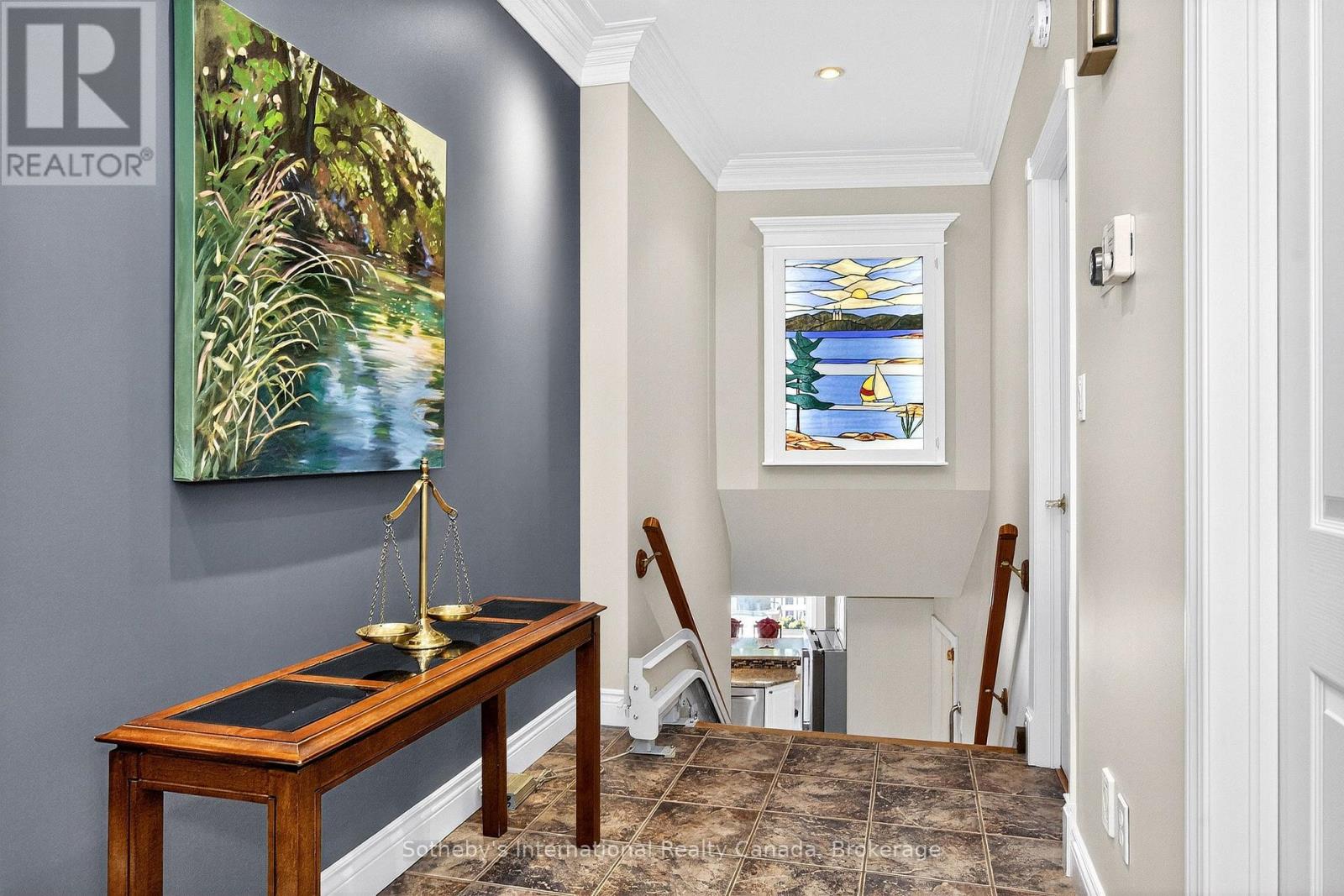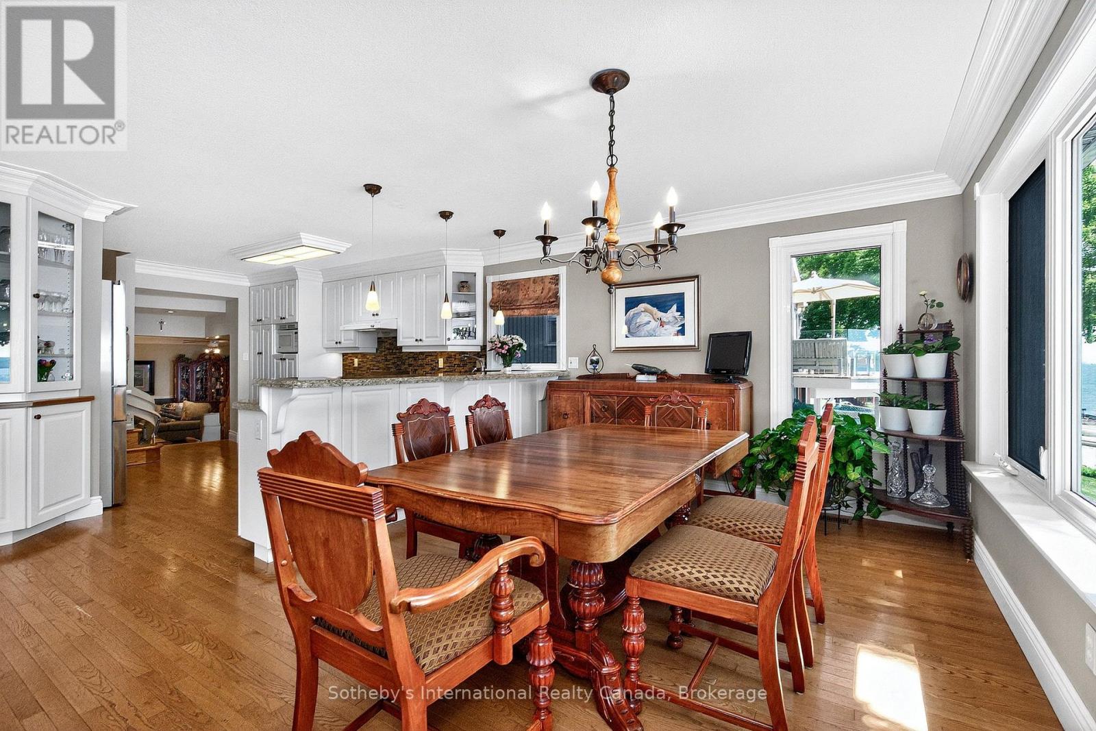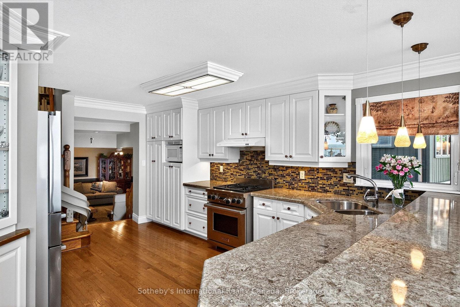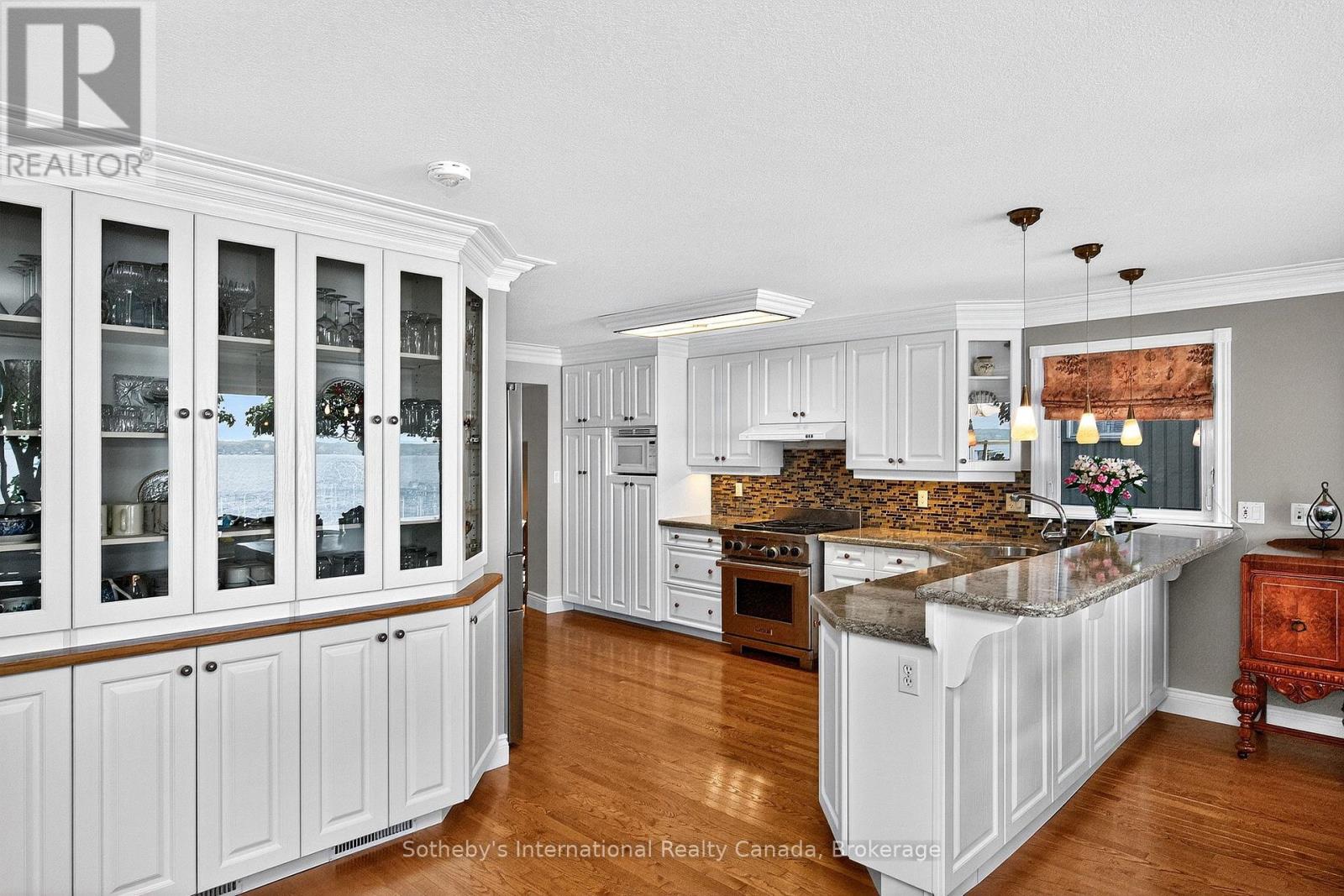 This beautifully maintained waterfront home showcases true pride of ownership. Originally redeveloped, expanded, and customized in 2004, it was thoughtfully designed with large families and entertaining in mind. Spanning three spacious levels - approx 3400 sqft, the home offers 4 bedrooms, 3 bathrooms, 2 full kitchens, 1 Dining Room, 2 family rooms, wine cellar and multiple entrances, along with a versatile office/guest space with a day bed ideal for hosting extended family or visitors. Enjoy panoramic big-water views from several outdoor living areas, including a rooftop sitting area above the large dry-dock boathouse. The waterfront features 48 feet of south-facing shoreline with a renovated concrete pier, a newer 50-foot post dock system, and generous seating zones some shaded with retractable awnings for effortless outdoor entertaining. Set on a deep 48' x 694' lot, this property also includes a serviced back lot with hydro and water perfect for parking an RV or trailer. Accessibility is a priority with wide hallways, handicap-friendly bathrooms and doors, and a high-capacity stair lift. The attached 1.5 garage plus carport, and garden shed offer ample storage and convenience. Modern utilities include natural gas, high-speed internet, a partial backup 20 KW generator. Situated on prestigious Midland Point Road, you're just 8 minutes from downtown Midland and close to shopping, dining, and local attractions. (id:64974)