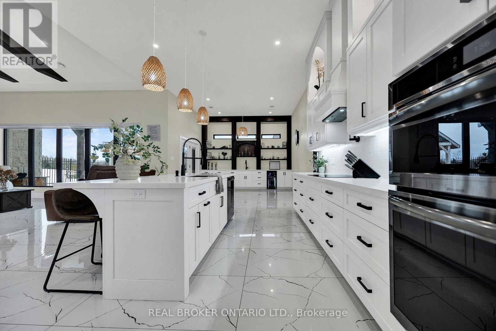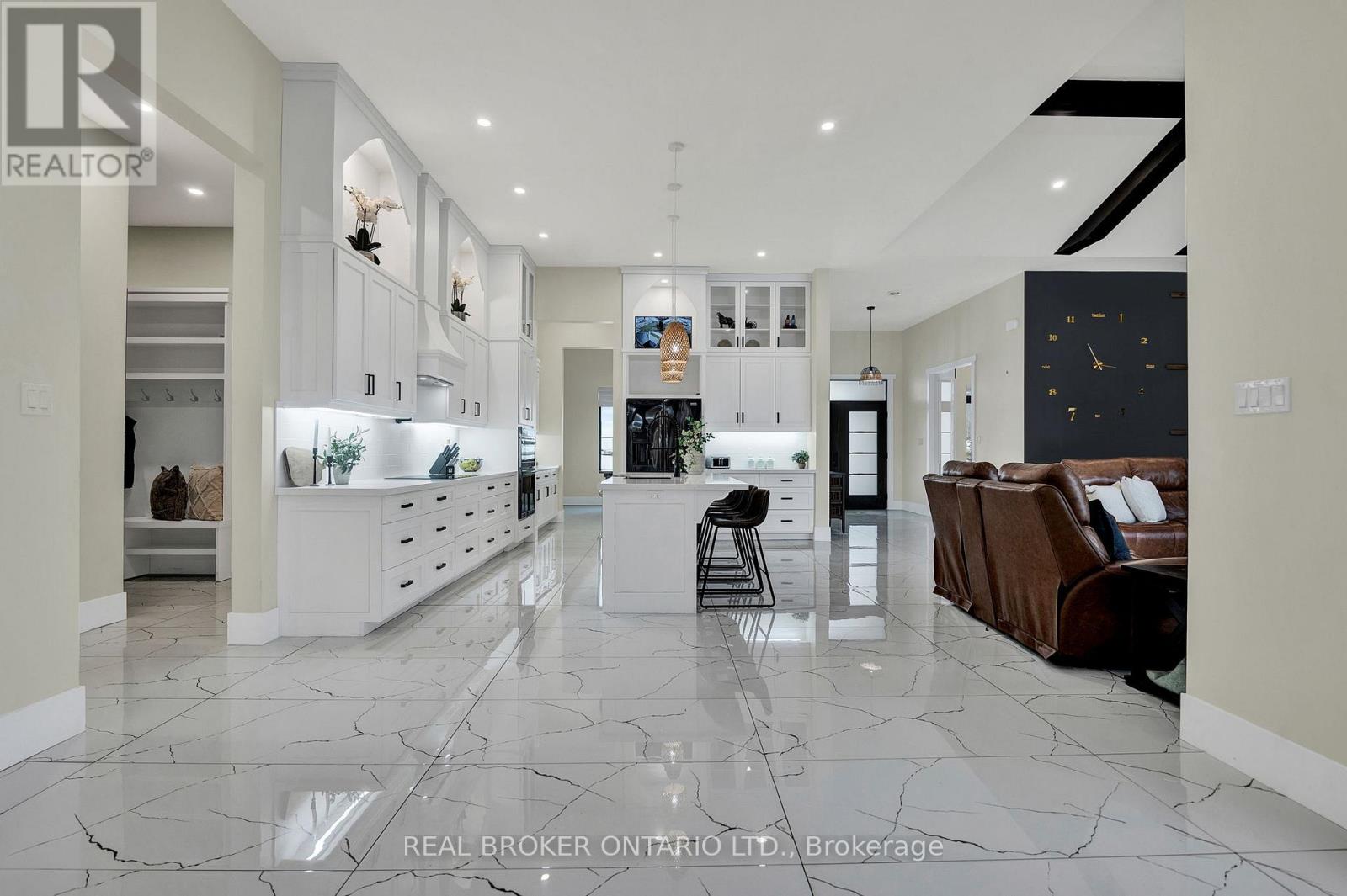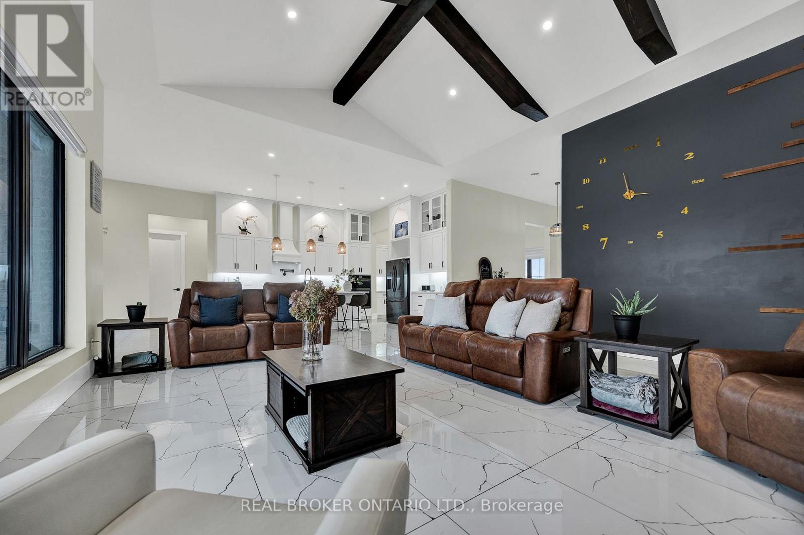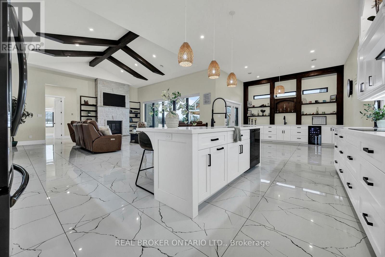 This custom built bungalow, completed in 2023, sits on just under 10 acres and offers a rare mix of modern comfort, quality finishes, and space to enjoy the land. Featuring 3 bedrooms and 3 bathrooms, the home is thoughtfully designed for both everyday living and long term comfort.The foyer welcomes you with marble flooring, in floor heating, and tall ceilings, setting the tone for the rest of the home. The open concept main living area flows naturally and is filled with natural light from large south facing windows. A floor to ceiling stone fireplace anchors the living room and creates a warm, inviting space year round.The kitchen is both functional and well designed, featuring floor to ceiling cabinetry, quartz countertops, stainless steel appliances, a farmhouse sink, and a large island for everyday use. A walk through pantry connects to the formal dining room, offering flexibility for hosting or quieter meals. Built in cabinetry with floating shelves and a bar fridge adds a practical accent and additional storage. Patio doors lead to a covered outdoor living area for easy indoor outdoor flow.The primary bedroom is spacious and bright, with a well appointed ensuite that includes double vanities, a large walk in shower, and a walk in closet. Two additional bedrooms, a dedicated office, mudroom, and generous laundry room complete the main level. Everything is located on one level for easy, efficient living.Two attached garages with in floor heating provide plenty of space for vehicles, storage, or workspace.A standout feature of the property is the approximately 40 x 70 heated shop, complete with in floor heat, large overhead doors, a washroom, and office space.Set on just under 10 acres, this property offers privacy, open space, and room for projects, hobbies, or simply enjoying the outdoors. A newer build that combines thoughtful design, luxury finishes, and practical country living. (id:64974)