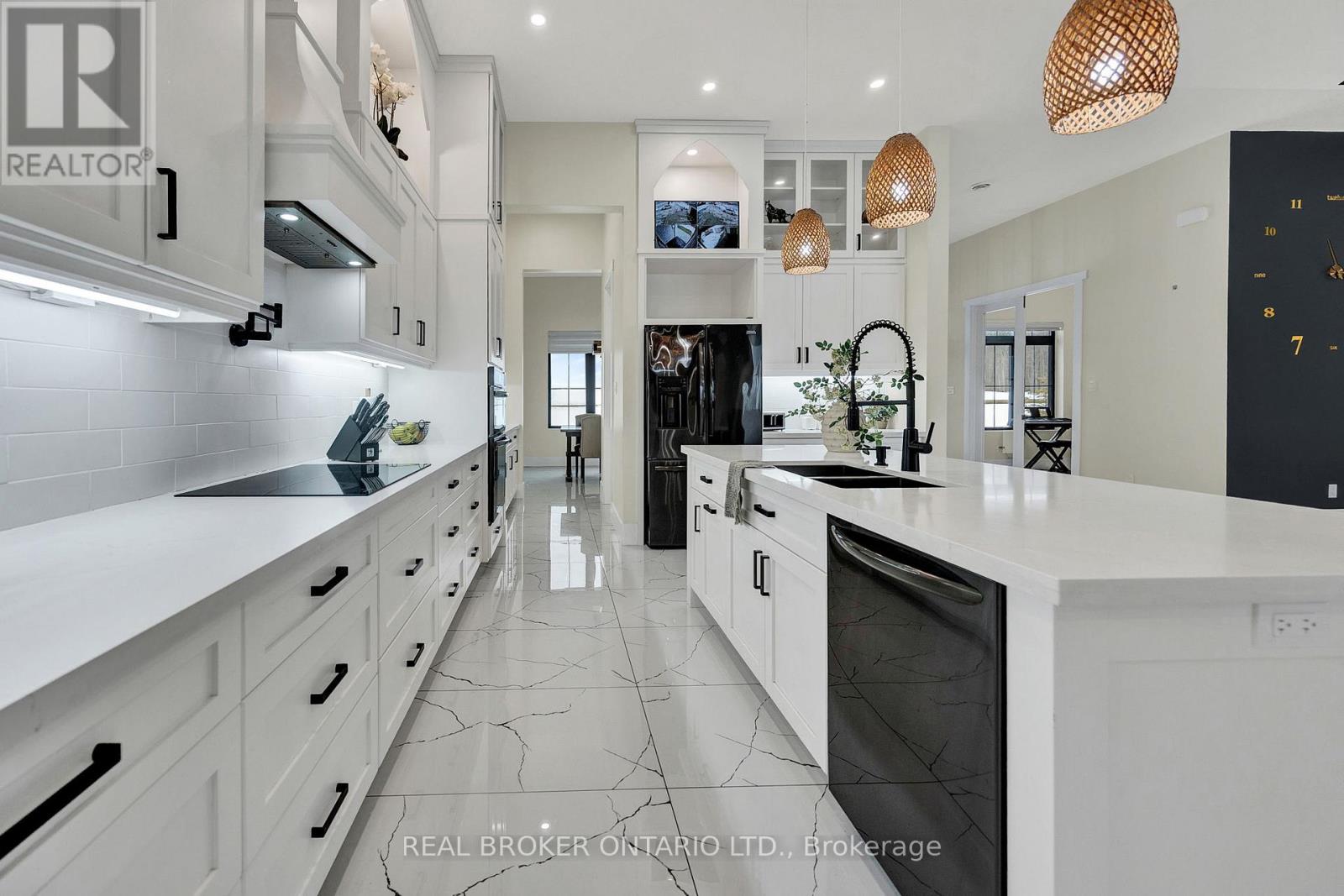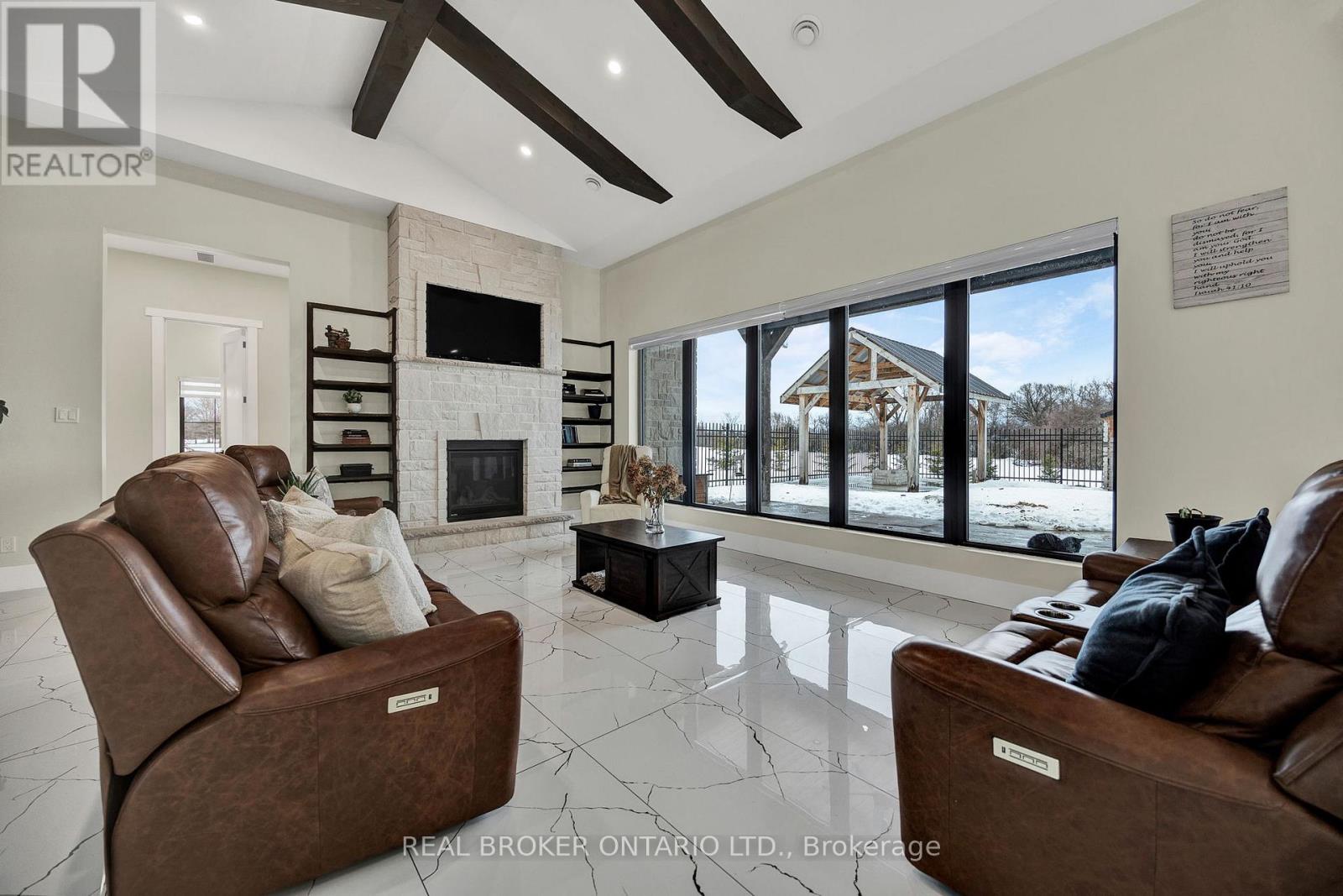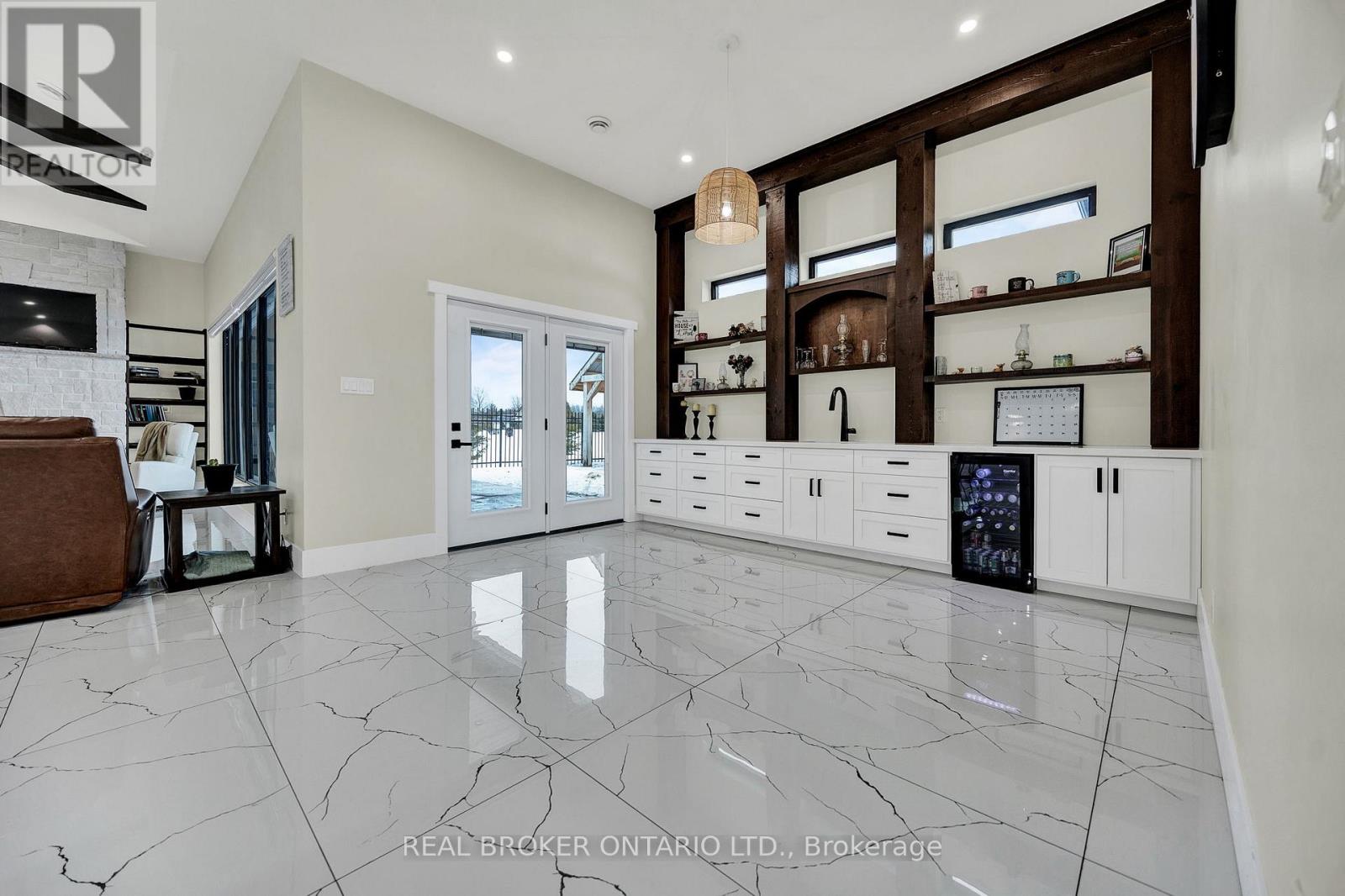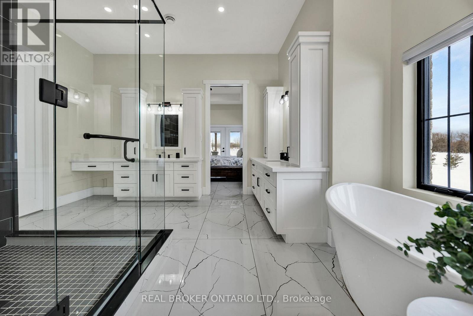This custom built bungalow, completed in 2023, sits on just under 10 acres and offers a rare mix of modern comfort, quality finishes, and space to enjoy the land. Featuring 3 bedrooms and 3 bathrooms, the home is thoughtfully designed for both everyday living and long term comfort.The foyer welcomes you with marble flooring, in floor heating, and tall ceilings, setting the tone for the rest of the home. The open concept main living area flows naturally and is filled with natural light from large south facing windows. A floor to ceiling stone fireplace anchors the living room and creates a warm, inviting space year round.The kitchen is both functional and well designed, featuring floor to ceiling cabinetry, quartz countertops, stainless steel appliances, a farmhouse sink, and a large island for everyday use. A walk through pantry connects to the formal dining room, offering flexibility for hosting or quieter meals. Built in cabinetry with floating shelves and a bar fridge adds a practical accent and additional storage. Patio doors lead to a covered outdoor living area for easy indoor outdoor flow.The primary bedroom is spacious and bright, with a well appointed ensuite that includes double vanities, a large walk in shower, and a walk in closet. Two additional bedrooms, a dedicated office, mudroom, and generous laundry room complete the main level. Everything is located on one level for easy, efficient living.Two attached garages with in floor heating provide plenty of space for vehicles, storage, or workspace.A standout feature of the property is the approximately 40 x 70 heated shop, complete with in floor heat, large overhead doors, a washroom, and office space.Set on just under 10 acres, this property offers privacy, open space, and room for projects, hobbies, or simply enjoying the outdoors. A newer build that combines thoughtful design, luxury finishes, and practical country living. (id:64974)