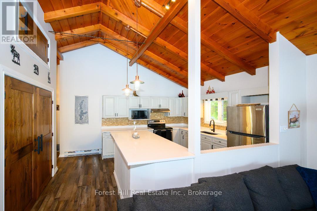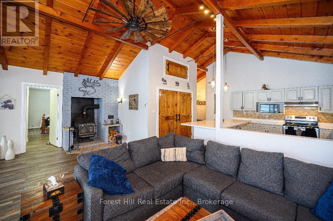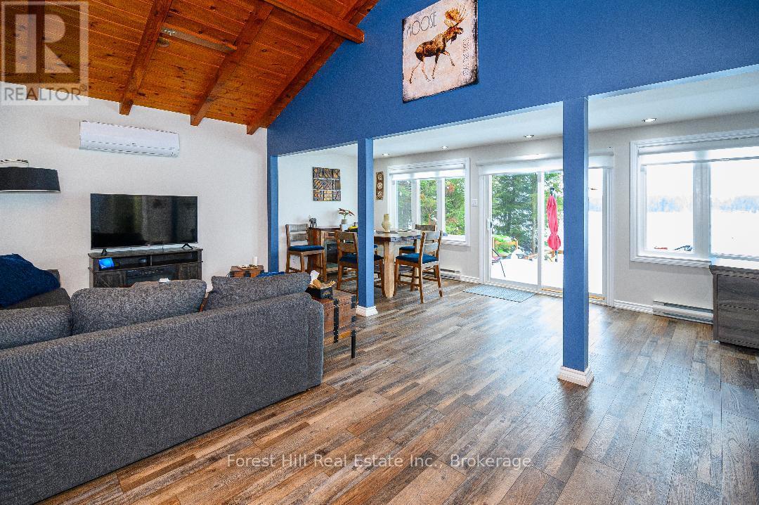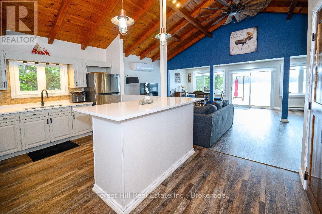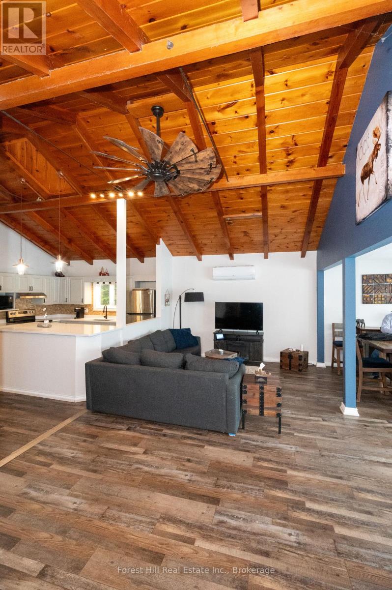 An amazing waterfront three bedroom home on Eagle Lake, facing west with that large open big view!! All this with a level easy entry sand beach just steps from the front deck. Eagle Lake has clean clear water , being spring fed with great fishing! You'll love the open concept kitchen family room with cathedral Pine beam ceilings, and modernized professionally designed kitchen, you can actually be in the kitchen and see your children playing on the beach! All the bedrooms, bathrooms, laundry room, kitchen and family gives you all main floor living with no stairs. the attached garage is easily accessed through the laundry room, with your main bedroom on the lakeside with a large closet and ensuite private bathroom. The Tiki Bar on the beach is included. A golf course is also close by, with South River and Highway 11 being just 12km away, Huntsville or North Bay are just 40 minutes away. you'll love this Low maintenance brick home with a steel roof. Check it out!! (id:64974)