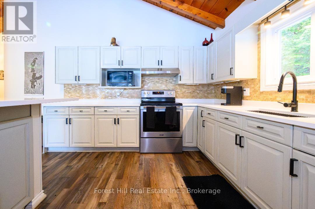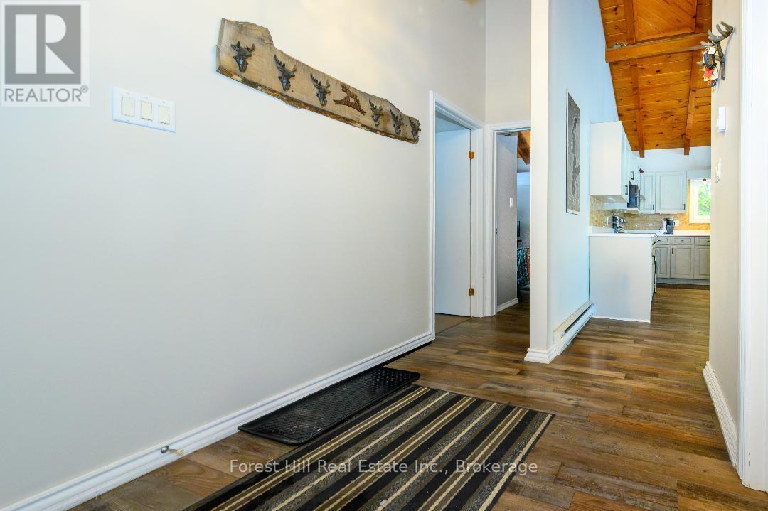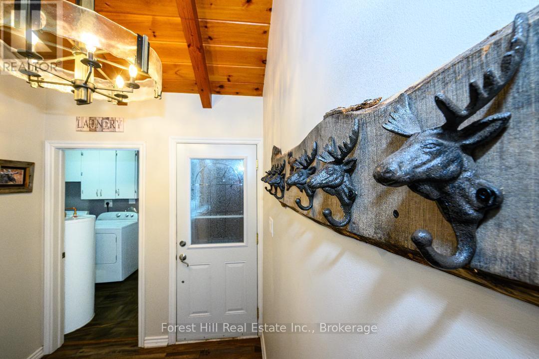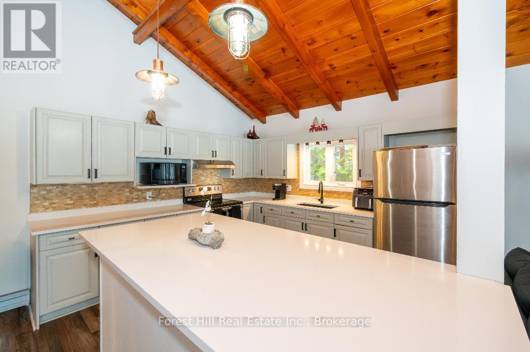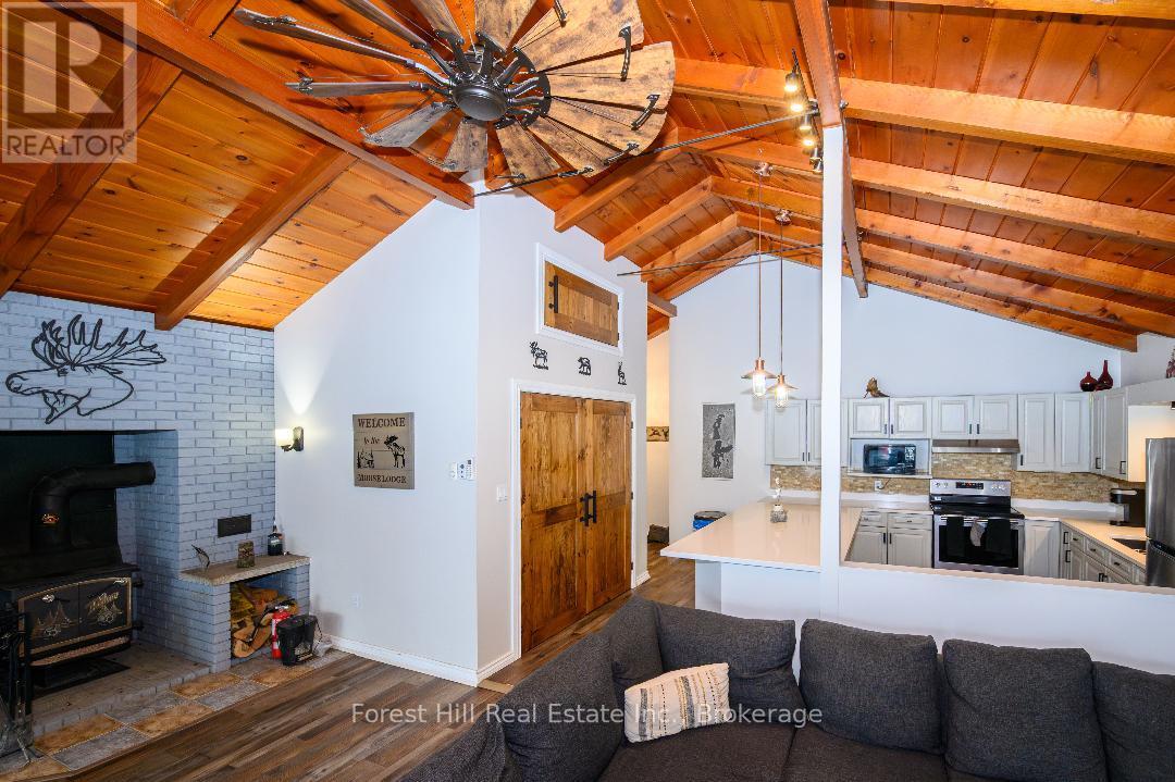 An amazing waterfront three bedroom home on Eagle Lake, facing west with that large open big view!! All this with a level easy entry sand beach just steps from the front deck. Eagle Lake has clean clear water , being spring fed with great fishing! You'll love the open concept kitchen family room with cathedral Pine beam ceilings, and modernized professionally designed kitchen, you can actually be in the kitchen and see your children playing on the beach! All the bedrooms, bathrooms, laundry room, kitchen and family gives you all main floor living with no stairs. the attached garage is easily accessed through the laundry room, with your main bedroom on the lakeside with a large closet and ensuite private bathroom. The Tiki Bar on the beach is included. A golf course is also close by, with South River and Highway 11 being just 12km away, Huntsville or North Bay are just 40 minutes away. you'll love this Low maintenance brick home with a steel roof. Check it out!! (id:64974)