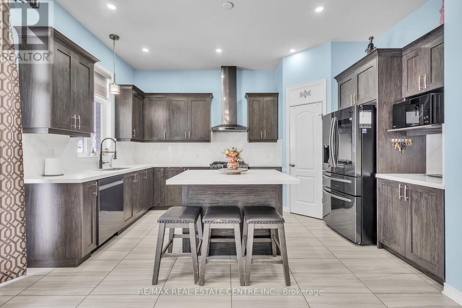 Welcome to 438 Blair Creek Drive, Doon South - an extensively upgraded home offering approx. 3,148 sq. ft. of finished living space. The main level features 10-ft ceilings, new luxury vinyl flooring, and a striking two-sided gas fireplace serving the living and dining areas, creating a warm focal point within the open-concept layout. The chef's kitchen showcases quartz countertops, gas range, pantry, designer backsplash, and modern finishes. A rare main-floor bedroom with a full bath provides excellent flexibility for guests or multi-generational living.The upper level offers 9-ft ceilings, spacious bedrooms, and two primary suites-one with a walk-in closet and spa-inspired ensuite, and the second with his-and-her closets and private bath. The approx. 1,459 sq. ft. unfinished basement with 9-ft ceilings and bathroom rough-in presents excellent future potential. 200-amp electrical service supports modern living needs.Additional highlights include a double-wide extended driveway, epoxy-finished double-car garage, and a 35' x 15' aluminum-covered patio with concrete base, ideal for year-round entertaining. The private backyard backs onto the Doon South walking trail with mature cedar trees for added privacy. Conveniently located minutes to Hwy 401, major shopping, parks, and schools. (id:64974)