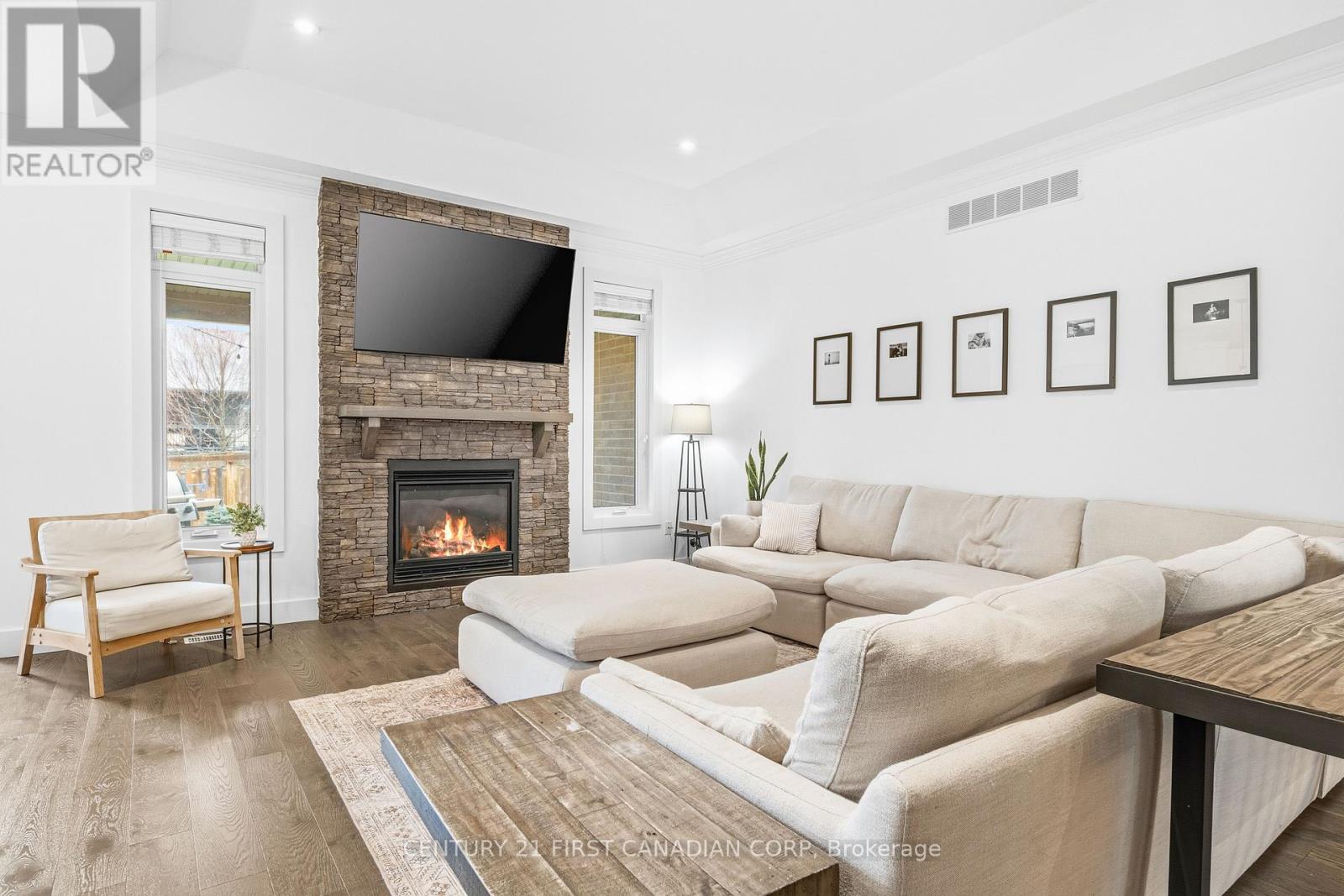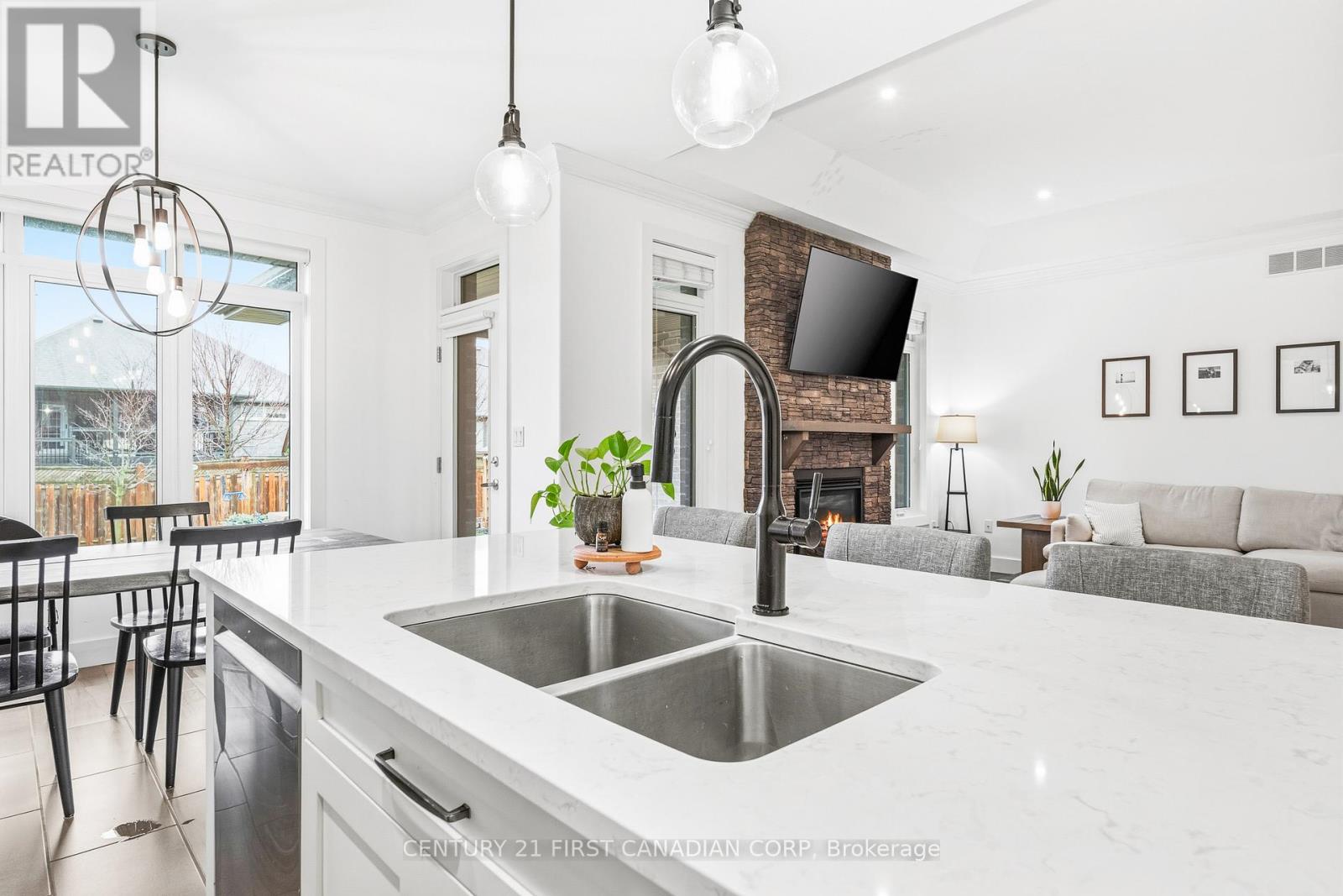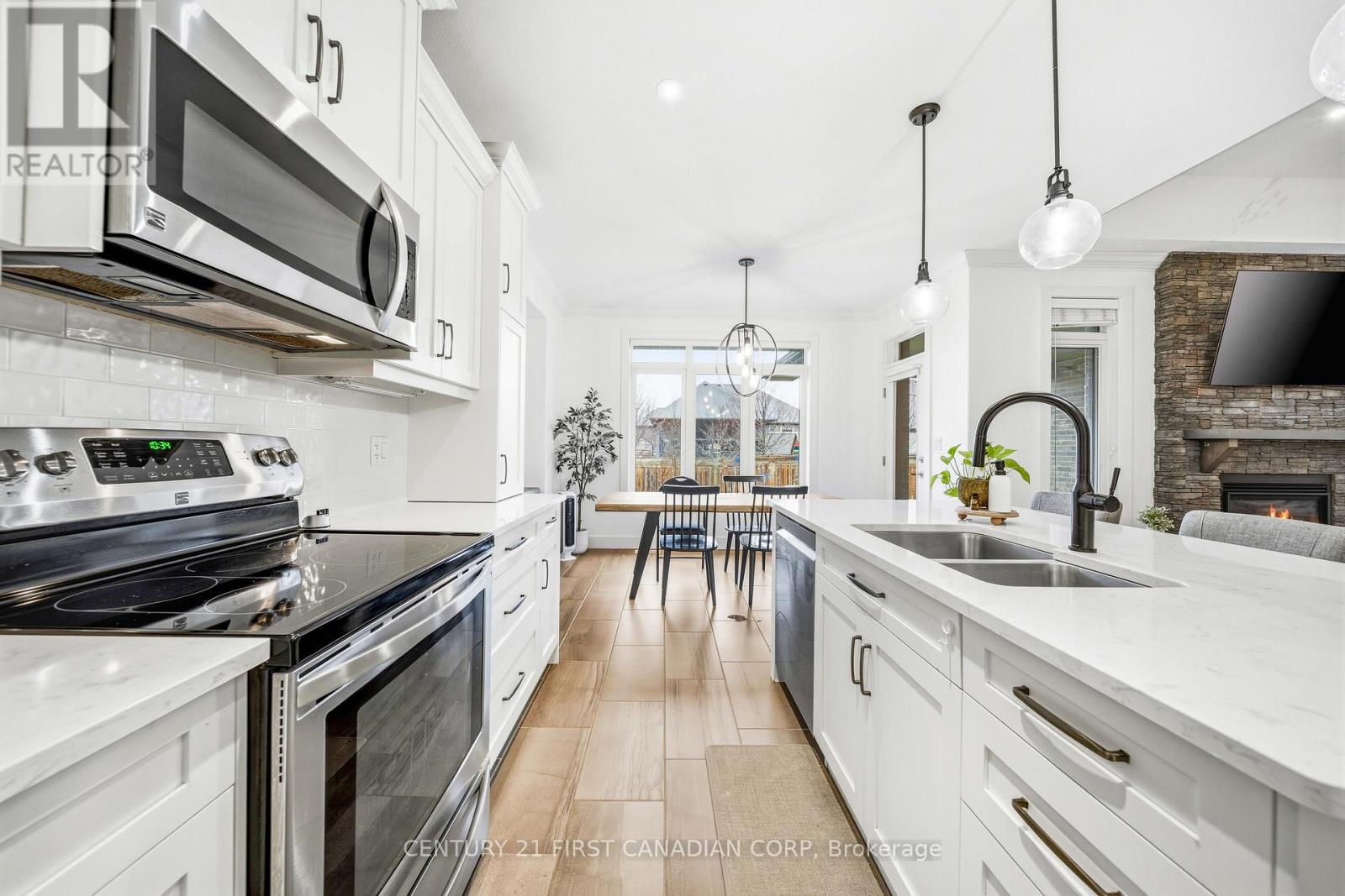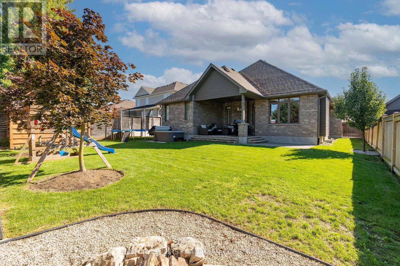 A perfectly sized bungalow for family living, set in a welcoming, family-friendly neighbourhood in Strathroy's sought-after north end. This immaculate all-brick 3+1 bedroom home offers high-end finishes, thoughtful design, and exceptional living space both inside and out. The main floor features a bright, open-concept layout centred around a stunning white kitchen with quartz countertops, seamlessly flowing into the living and dining areas-perfect for everyday living and entertaining. A cozy gas fireplace adds warmth and character to the space.The fully finished basement expands your living space with a large family room, additional bedroom, and plenty of room for family, guests, or a home office setup. Enjoy year-round comfort with covered front and back porches, ideal for relaxing outdoors in any season. The property also includes a full two-car garage, sprinkler system, and a hot tub for added enjoyment. Don't miss your opportunity to secure a move-in ready home in a prime location, close to schools, parks, and everyday amenities. (id:64974)