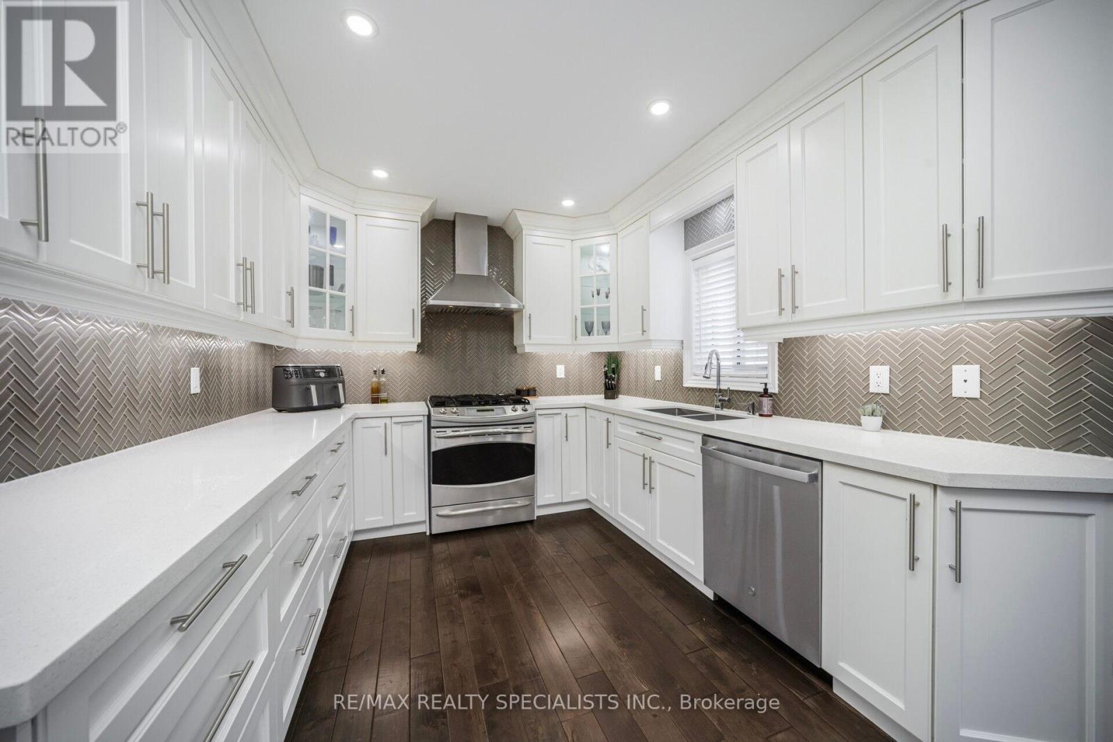Welcome to this beautifully upgraded, all-brick detached home situated on a premium 55-foot lot, offering a double-car garage and an extended four-car driveway. From the moment you arrive, you'll appreciate the curb appeal, exterior pot lights, and fully fenced backyard with no neighbours behind-creating a private outdoor retreat complete with a spacious patio, perfect for BBQs and entertaining. Step inside and feel instantly at home with gleaming hardwood floors, abundant pot lights, and a bright, sun-filled layout throughout. The main floor features formal living and dining areas, along with a cozy family room highlighted by a gas fireplace-ideal for relaxing evenings. The fully renovated kitchen is a true showstopper, showcasing luxurious finishes, stainless steel appliances, granite countertops, stylish backsplash, and a large centre island with built-in microwave and wine fridge. Ample counter and cupboard space make this kitchen as functional as it is elegant. An elegant oak staircase with iron pickets leads you to the upper level, where you'll find five generously sized bedrooms. The spacious primary retreat offers double closets and a spa-inspired 5-piece ensuite complete with double sinks. The main bathroom on the second floor is fully renovated, and the thoughtfully upgraded laundry room with built-in counter adds everyday convenience. Filled with natural light and meticulously maintained, this neat and tidy home offers exceptional space for growing families. Ideally located close to plazas, top-rated schools, parks, highways, and all essential amenities-this is a rare opportunity to own a truly move-in-ready home that combines comfort, style, and functionality (id:64974)