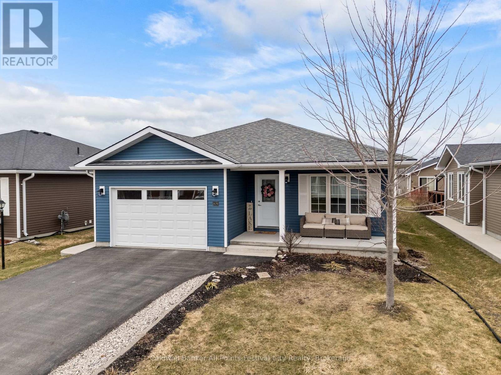 Welcome to 44 Huron Heights Dr. at the Bluffs at Huron. This model spec home built in 2018 was thoughtfully laid out for comfortable, modern living. Offering 2 bedrooms and 2 bathrooms, this home features a spacious open-concept design (1276 sq. ft). A generous front foyer creates a warm welcome, while the conveniently located laundry room just off the 1.5 oversized car garage adds to the home's practical layout. The kitchen is both stylish and functional, complete with quartz countertops, a large island, and a sleek tile backsplash. The living and dining room area is highlighted by a stunning tray ceiling. The primary suite is a true retreat, featuring a large walk-in closet and a private 3-piece ensuite. Step outside to enjoy both a covered front porch and an expansive back deck that spans the length of the home, complete with a private end section & pergola-ideal for relaxing or hosting. Set on a large lot and only a 5 minute walk to the bluff to catch a Lake Huron sunset, this home offers both space and comfort inside and out. Enjoy an active, social lifestyle at the Bluffs, where a vibrant community atmosphere meets top-notch amenities. With a stunning Clubhouse (only 5 min. walk away too), indoor pool, pickleball courts, dog park and golf nearby, there's truly something for everyone. (id:64974)