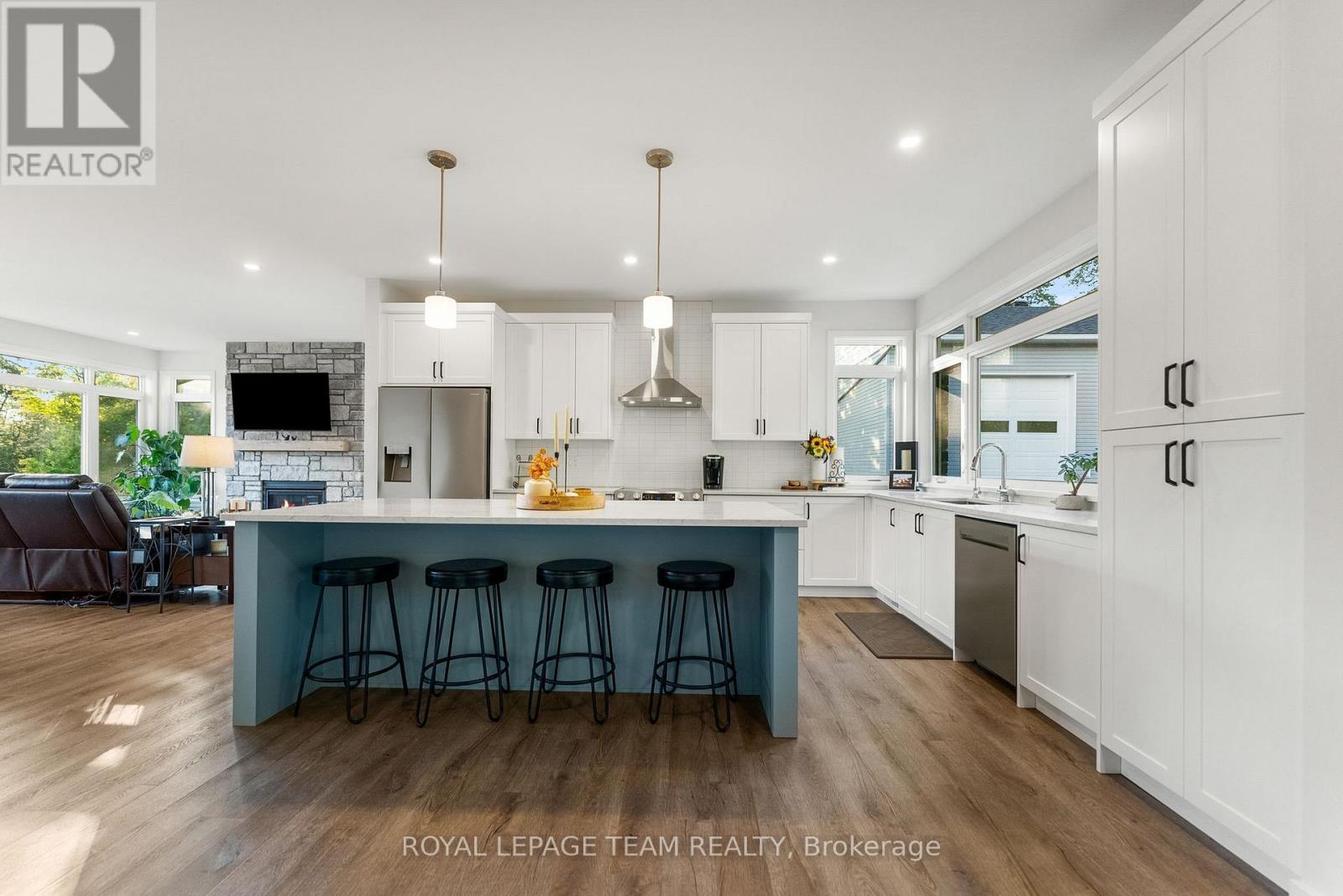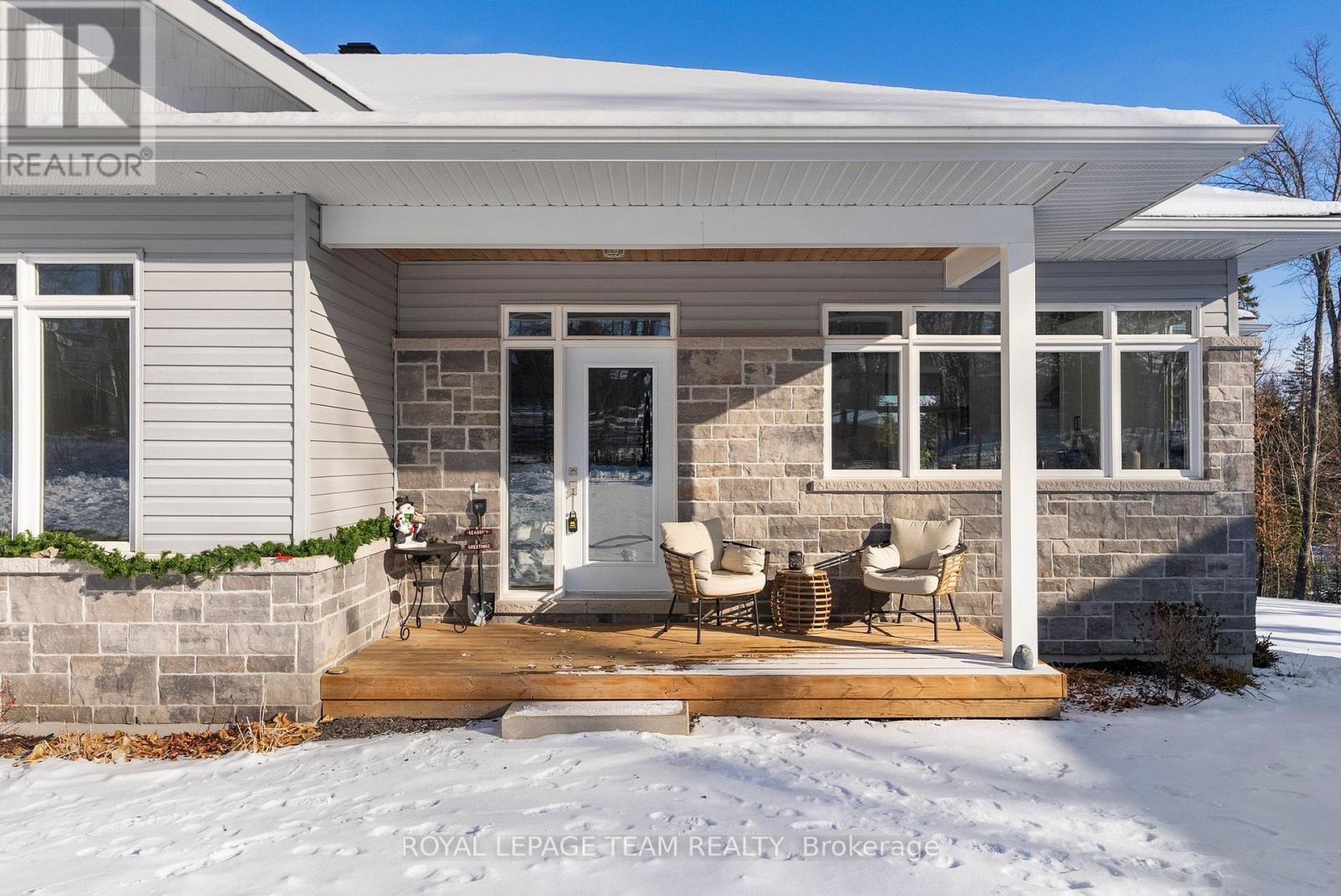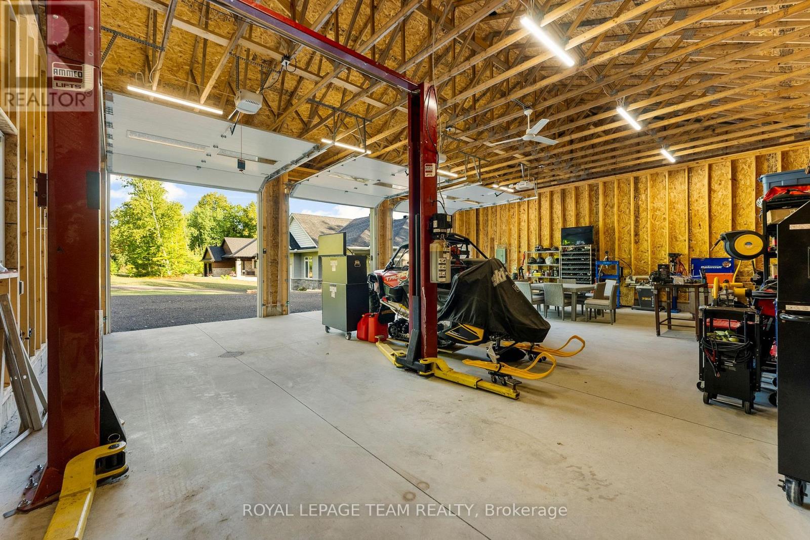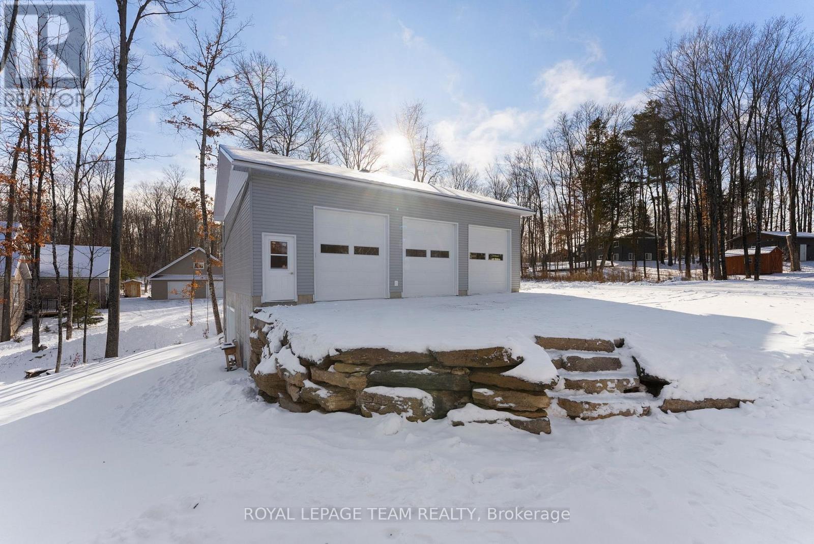 Located in the desirable community of Calabogie, just steps from the Calabogie Highlands Golf Course and a short drive to the Calabogie Motorsports Park, this home is a car enthusiast's dream! This immaculate 3 bed, 2 bath bungalow was built in 2023 by Mackie Homes and features high-end finishes throughout. The open-concept kitchen and dining area are highlighted by stunning quartz countertops and a floor-to-ceiling stone gas fireplace, creating a warm and inviting space to gather. The primary bedroom offers a luxurious ensuite and a walk in closet. 2 additional large bedrooms are offered on the main floor as well as main floor laundry station located centrally to the bedrooms. The fully finished basement offers additional living space complete with a wood-burning fireplace and a walk-out with access to the backyard( no rear neighbours) . In addition to the attached garage, this property boasts a newly built 3-car detached garage featuring 10 ft high doors and a 9000 lb hoist (included in the sale)perfect for working on vehicles or storing large equipment. Below the 3 car garage is access to a lower-level garage bay, ideal for storing recreational toys, tools, or lawn equipment. Enjoy the perfect balance of comfort, functionality, and lifestyle in one of Calabogie's most sought-after locations. Whether you are looking to spend more of your days at the golf course, the race track, the beaches, hiking the incredible trails, ATVing or skiing- Calabogie's 4 seasons of recreational fun provides opportunities for everyone! (id:64974)