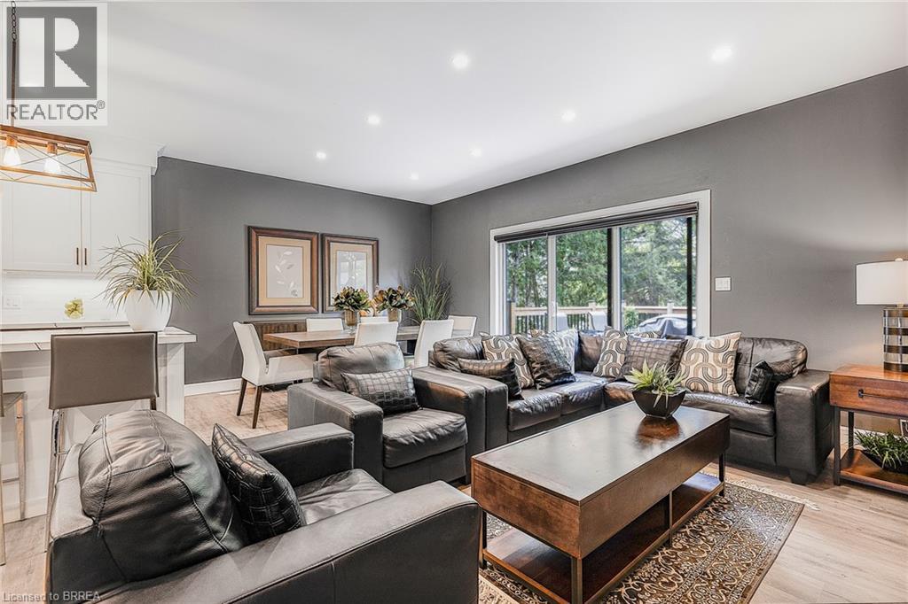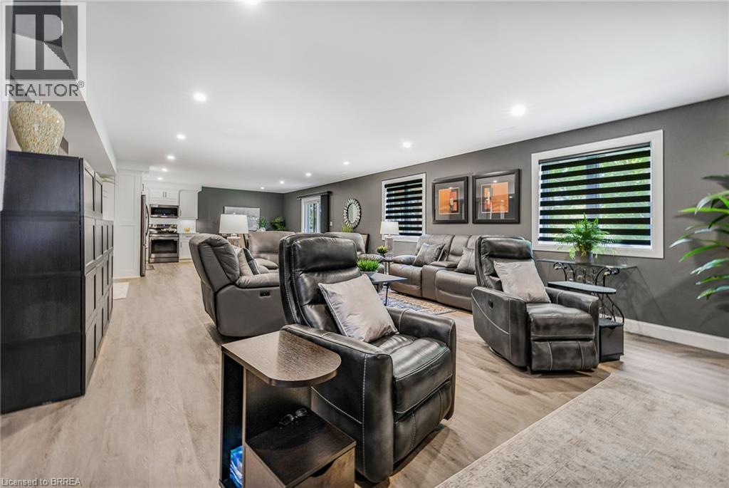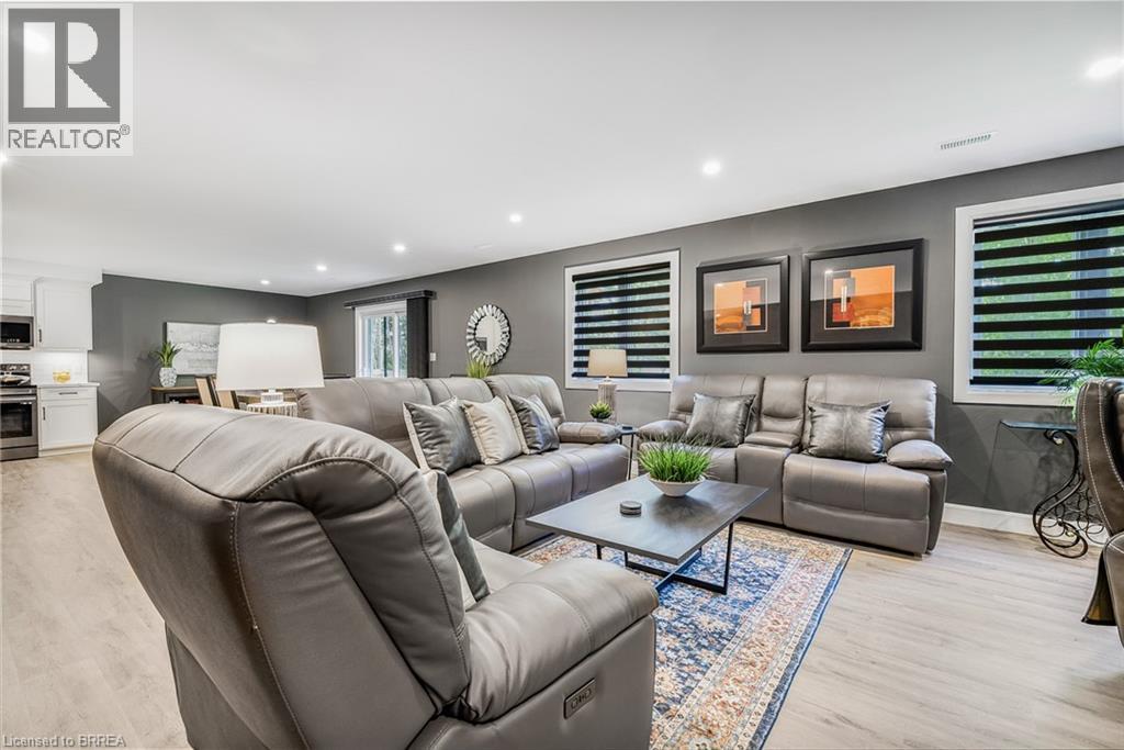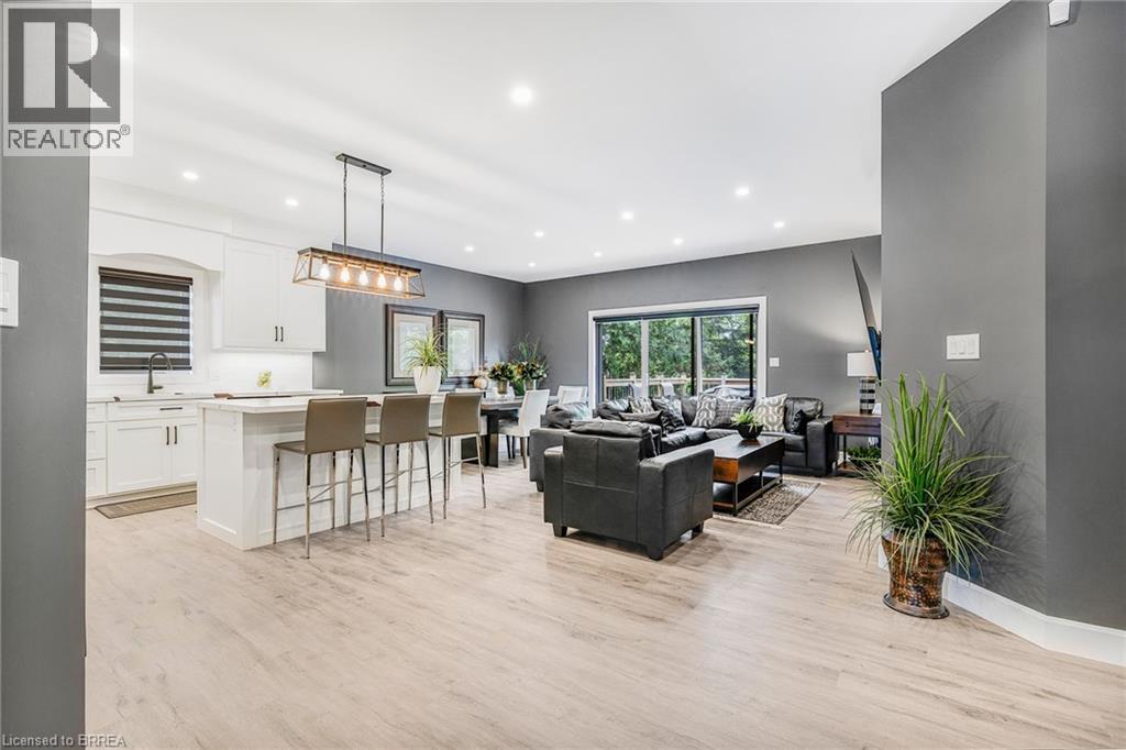 Welcome to 442 James Street, located in the picturesque town of Delhi. This exceptional bungalow effortlessly combines contemporary design with refined modern finishes, making it perfect for multi-generational living or a complete in-law suite setup. From the moment you arrive, the superior craftsmanship is clear—starting with the inviting double sidelight entry door and continuing into the spacious foyer that opens into a bright, open-concept living space. The expansive main area features a chef-inspired kitchen complete with soft-close cabinetry, under-mount lighting for ambiance, a generous pantry, eye-catching quartz countertops, a large island, and cutting-edge Smart appliances. Just off the kitchen, the dinging and living areas flow seamlessly and includes sliding doors that open onto a raised deck, offering peaceful views of the private backyard. The main floor also offers three generously sized bedrooms, including a luxurious primary suite featuring a walk-in closet and an elegant ensuite bathroom with a beautifully tiled glass-door standalone shower. A second 4-piece bathroom is conveniently located for guests and family members, along with a practical laundry room that provides direct access to the garage. Head downstairs to the fully finished lower level, where the same attention to quality and detail continues. This level includes two more bedrooms, a stylish 4-piece bathroom, a full kitchen, and a spacious dining area and family room that opens to a cozy covered porch overlooking the backyard. Step outside and enjoy your peaceful outdoor retreat, surrounded by mature trees that add natural beauty and privacy. This thoughtfully designed home offers the perfect combination of modern comfort, functional living, and timeless elegance. At 442 James Street, you’ll find a true haven—ideal for both entertaining and everyday relaxation in your dream home! (id:64974)