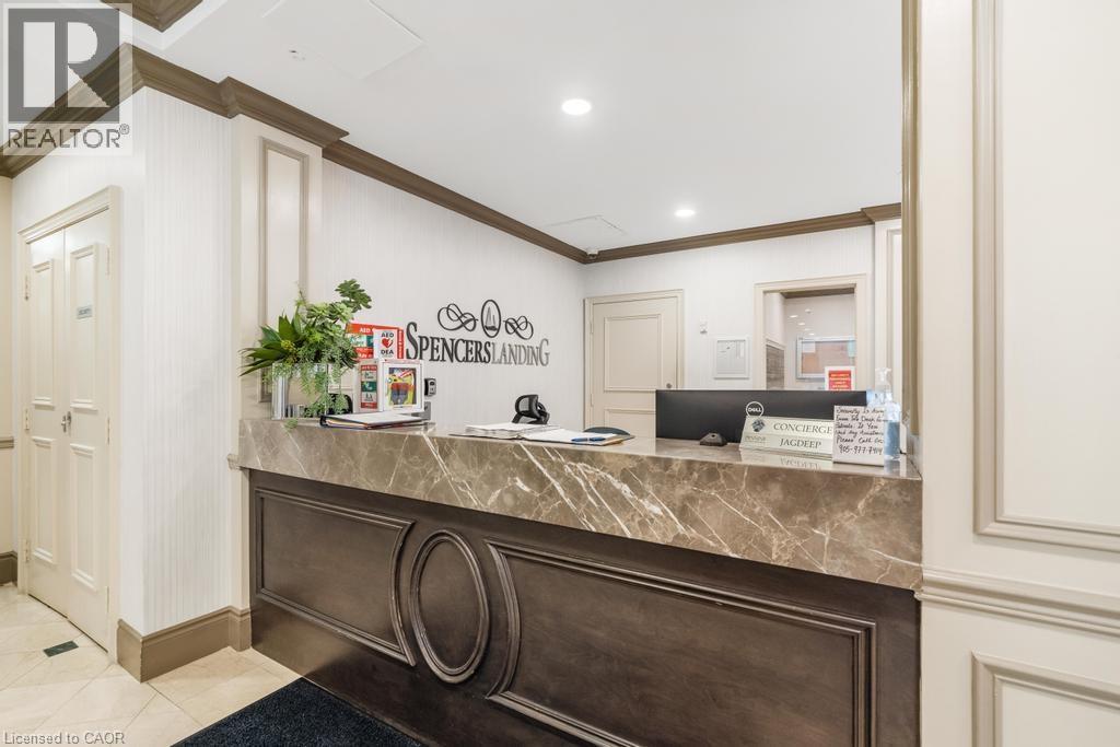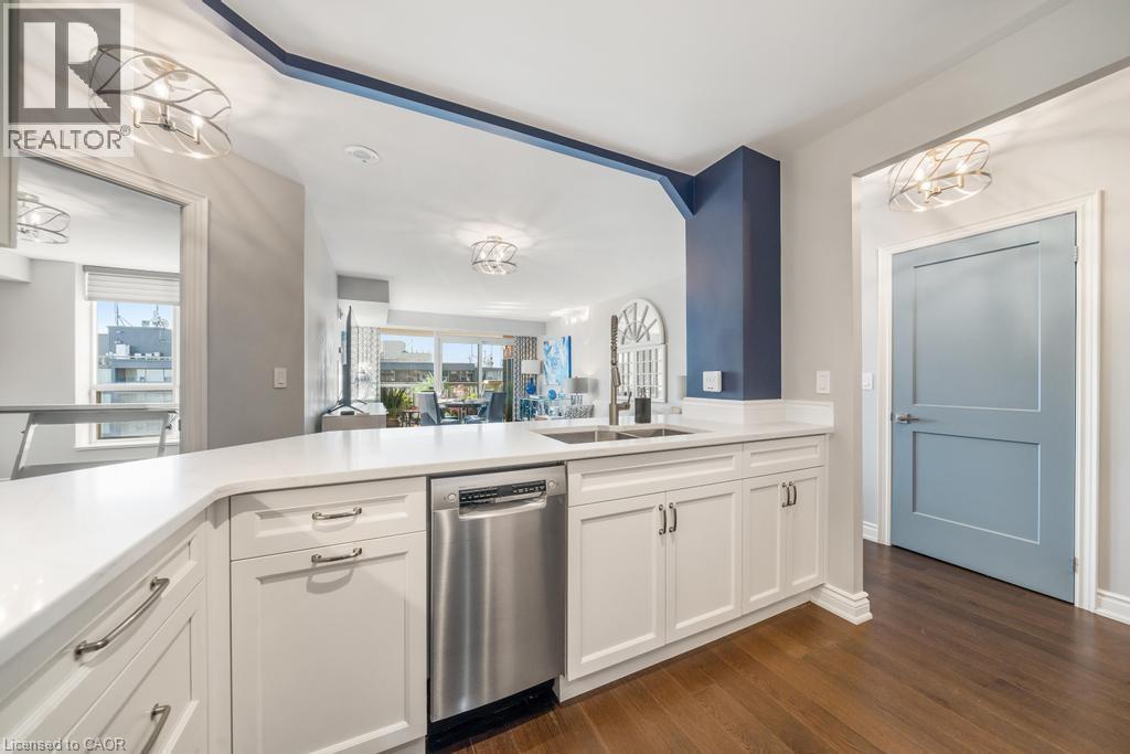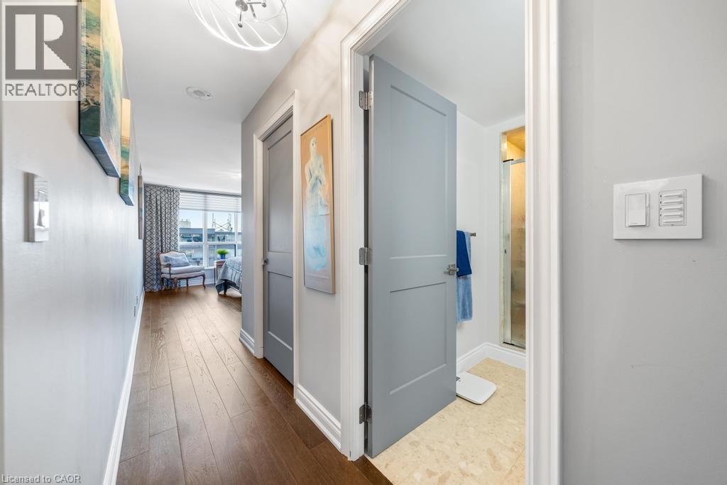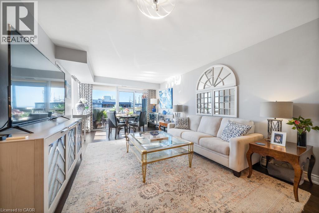 Stunning 2 bed, 2 bath condo in sought-after Spencer’s Landing, downtown Burlington. This spacious, beautifully updated unit features engineered brushed white oak flooring, new interior doors/hardware, and a custom kitchen with cabinets (2020) and newer appliances (2021/2022). Both bathrooms boast new vanities; the bright primary offers a walk-in closet and ensuite with soaker tub. Updated electrical outlets throughout. Enjoy lake views from the balcony and dining area. Walk to Spencer Smith Park, waterfront trails, restaurants, shops, and more. The many amenities include an indoor pool, sauna, outdoor gazebo and BBQ area, gym, party room and 24 hour front desk security. Exceptional location with modern upgrades, ready for you to move in! (id:64974)