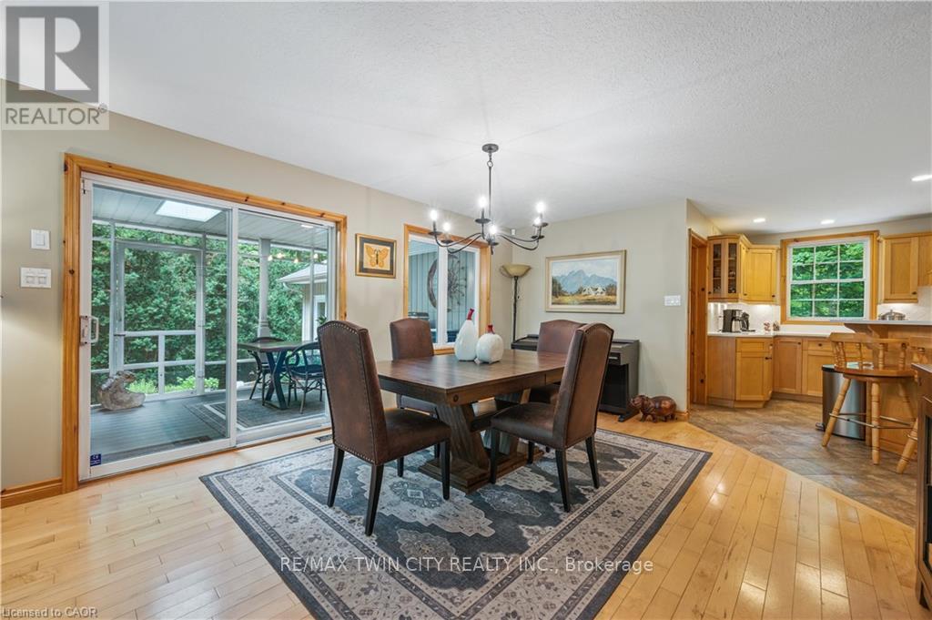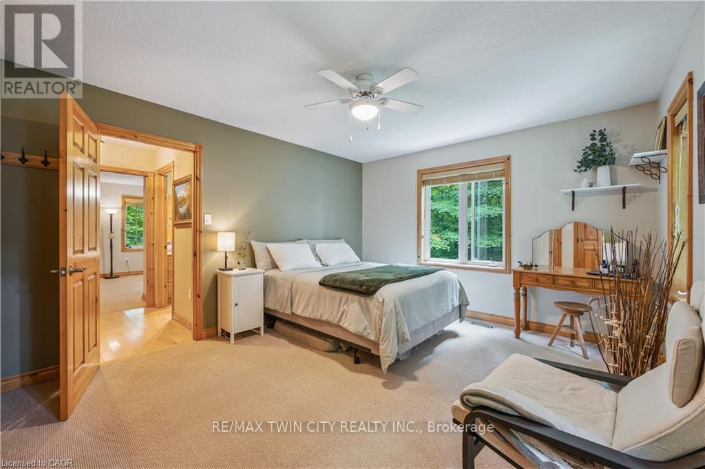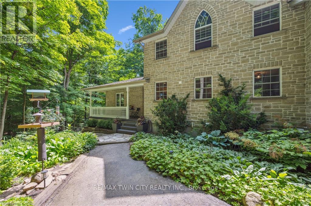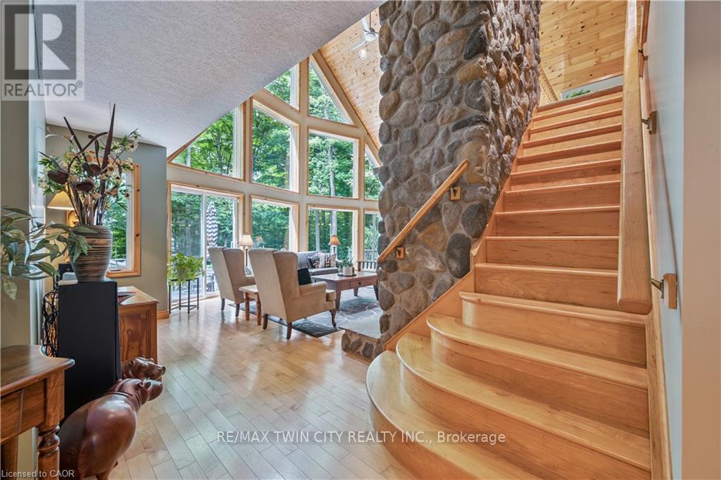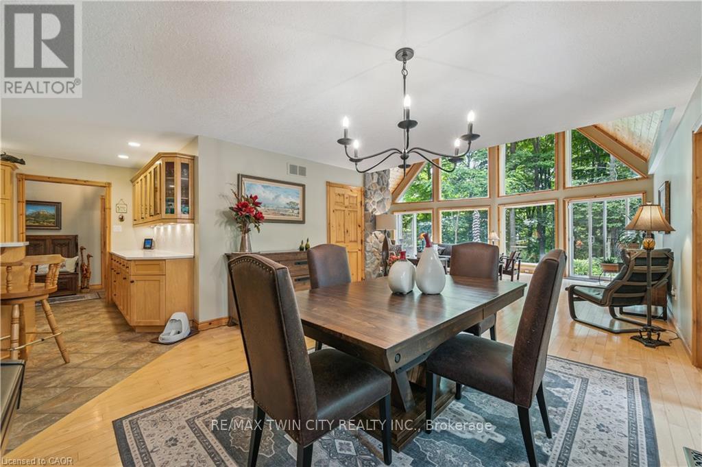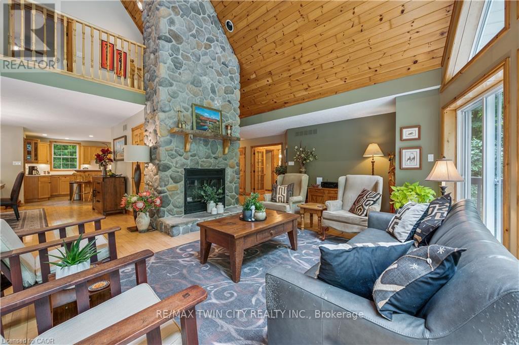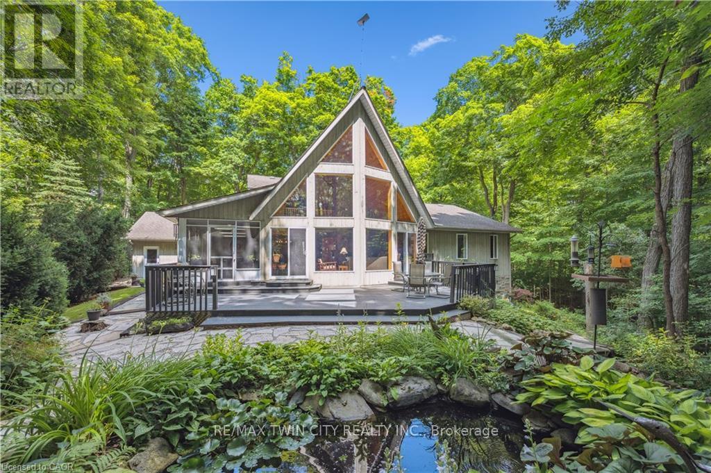 A Private Country Retreat ~ Welcome to your own piece of paradise-a stunning country estate set on nearly 1.4 acres of pristine land, where nature, luxury, and comfort converge. This exquisite home boasts a soaring 24-foot cathedral ceiling in the great room, framed by floor-to-ceiling windows that offer breathtaking views of the surrounding forest, manicured gardens, and a tranquil ornamental pond. Step outside to explore your private trails or relax in the peaceful sitting area - a nature lover's dream, right in your own backyard. Inside, timeless craftsmanship is on full display. Solid maple hardwood flooring, a dramatic floor-to-ceiling stone fireplace, and rich pine doors and trim create a warm and welcoming atmosphere throughout. The spacious kitchen is a chef's delight, featuring custom maple cabinetry, quartz countertops that seem to stretch endlessly, stainless steel appliances, and a propane stove. The open-concept layout flows beautifully from the kitchen into a formal dining room, which overlooks the great room and leads to a screened in California room with skylights - the perfect spot to enjoy morning coffee, meals or evening conversation, bug-free. Upstairs, the primary suite is a serene retreat with a generous walk-in closet, a four-piece ensuite, and a cozy loft with a sitting area and workspace. The main level includes two additional bedrooms and a full bathroom, plus a convenient laundry room and mudroom with access to an oversized two-car garage. A separate staircase leads to the fully finished walkout basement, featuring a massive recreation room with a wood-burning stove, a fourth bedroom, utility space, and a hobby room. Just a short drive to Guelph and with easy access to the 401 for commuters, this exceptional home offers the best of country living with the convenience of the city nearby. Experience the tranquility and fall in love with the lifestyle. (id:64974)