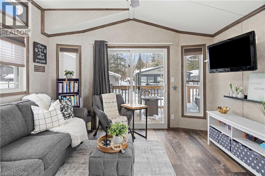 Welcome to this meticulously maintained, custom built modular home, nestled within the sought-after Lost Forest Park Gated Community. Immerse yourself in the conveniences of this year-round, unique lifestyle. This home features a charming wrap-around porch equipped with retractable screens, providing privacy and relaxation. The open-concept interior is adorned with driftwood laminate flooring and double-hung windows, ensuring effortless cleaning. The kitchen features ample grey cabinets, a spacious centre island with Corian top, perfect for entertaining family and friends. The great room exudes a bright and inviting ambiance with an additional access to the deck. Conveniently located in the hallway is your in-suite laundry, HVAC system, and double closet for storage. The primary bedroom boasts a double closet with custom-built-ins, while the den provides an ideal space for a home office or creative pursuits. The Lost Forest Community boasts a gated secure entry, outdoor, seasonal pool, walking trails and a community centre offering Dart Boards, Wifi, Ping Pong, Coffee maker, Games, Puzzles, member activities and a Book Exchange. This is the perfect space to engage in a vibrant, active lifestyle. Secure this exceptional opportunity and experience the unparalleled comfort and convenience of this custom built modular home. This opportunity is perfect for the first time buyer or those wanting to downsize. Minutes away from shopping, parks, golf, trails, highways and all that the quaint Village of Waterdown has to offer. (id:64974)