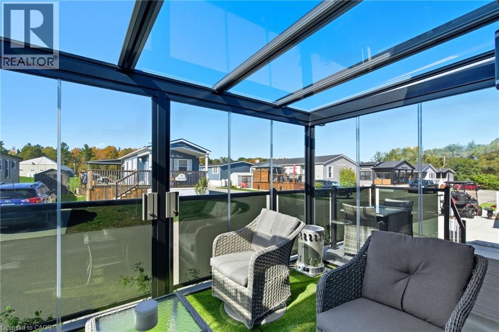 Welcome to 4449 Milburough Line, #28 Ash Street in Burlington — a beautifully maintained 2-bedroom, 2-bathroom home nestled in the quiet, welcoming community of Lost Forest Park. Less than five years old, this modern residence features an open-concept layout highlighted by an oversized two-tone custom kitchen island—perfect for entertaining. The spacious kitchen provides plenty of storage, while the separate dining area and built-in electric fireplace create a warm and inviting ambiance. A dedicated office space offers privacy for work or hobbies, and pot lights throughout add a bright, contemporary feel. Step outside to a stunning Lumon-enclosed 3-season sunroom—ideal for relaxing, hosting guests, or enjoying clear, starry nights. Lost Forest Park offers a peaceful setting with a strong sense of community, along with amenities such as an in-ground swimming pool, horseshoe pits, and beautifully landscaped grounds. Whether you’re looking to downsize or embrace a more tranquil lifestyle with modern comforts, this home is the perfect year-round retreat. (id:64974)