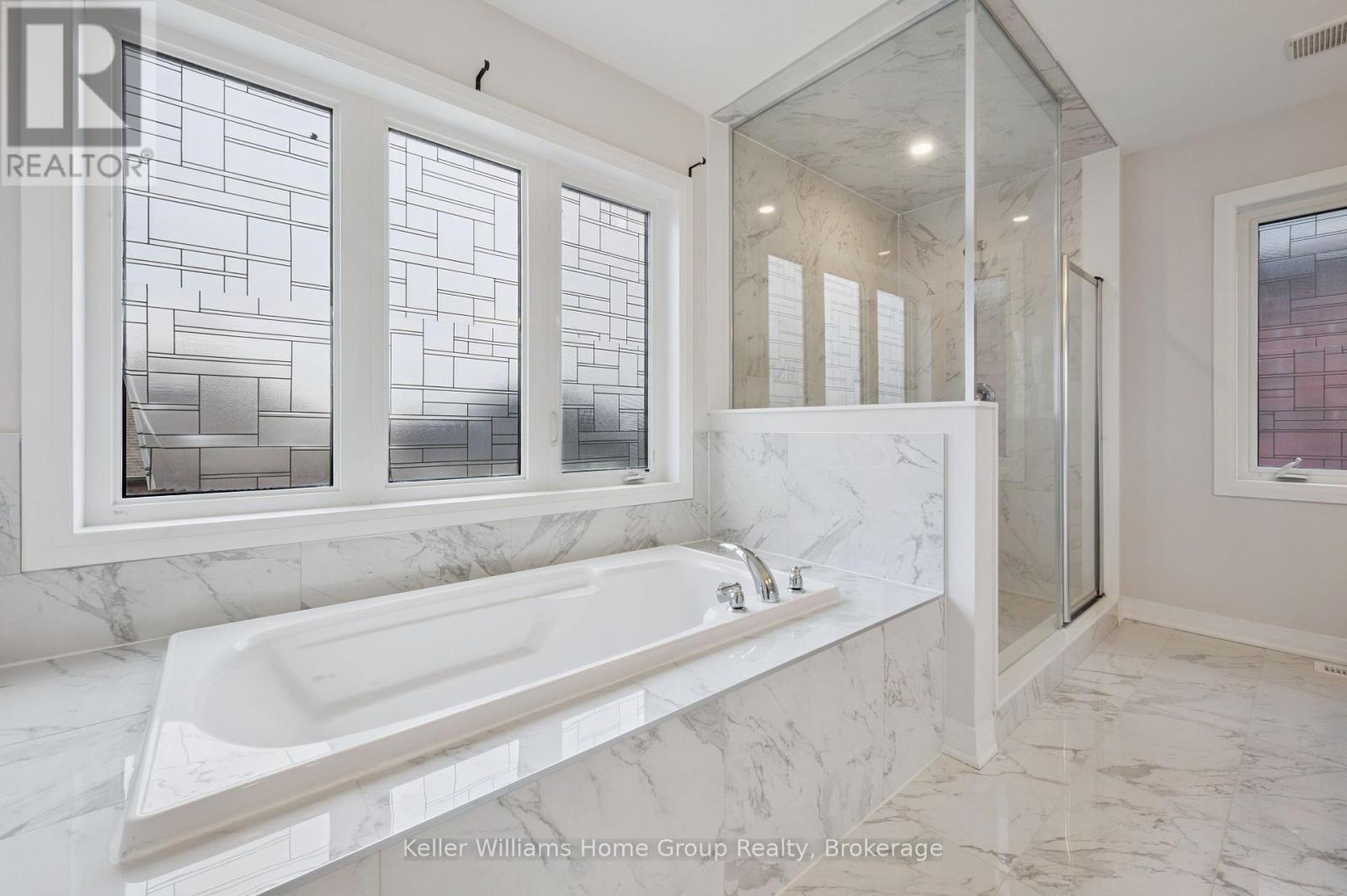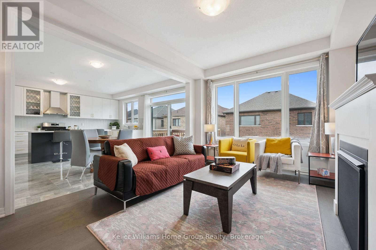 Situated on a highly sought-after premium WALK-OUT lot, this nearly new Cachet-built home is designed for multi-generational living, offering excellent in-law suite potential. With over $100k in upgrades including basement rough-ins for a kitchen, laundry, and 3 piece bathroom this home presents a rare opportunity in today's market. Boasting 4 bedrooms, 3.5 bathrooms, and a walk-out basement, it provides expansive space perfect for a future in-law suite, private guest quarters, or income generation. Enter through double glass doors into a refined interior where luxury meets modern design. The main floor showcases gleaming tile, custom hardwood stairs with sleek metal railings, engineered hardwood floors, and 9 foot ceilings that enhance the open, airy feel. The spacious living room, anchored by a gas fireplace, flows seamlessly into the formal dining area-perfect for entertaining. The chef's kitchen is a true showpiece, featuring extended-height white cabinetry with glass accents, custom stainless steel range hood over a professional gas stove, Caesar stone Quartz Calacatta Nuvo countertops, and a striking charcoal centre island. A chevron glass backsplash adds designer flair, while the dinette leads out to a private deck overlooking the backyard-ideal for outdoor gatherings. Practical luxury continues with powder room off the kitchen and mudroom connecting to the 2-car garage with EV charger rough-in. Upstairs you'll find the serene primary bedroom featuring coffered ceilings, a walk-in closet, and a spa-inspired ensuite featuring a raised double quartz vanity, soaker tub, and glass-enclosed shower. All with upgraded tiles, countertops, and tub. The 3 additional bedrooms offer flexibility for guests or children all with a Jack & Jill bathroom or a private ensuite. Located steps from a recently built park and minutes to major highways, this home combines a premium walk-out lot, future in-law potential, and high-end finishes throughout that you don't want to miss. (id:64974)