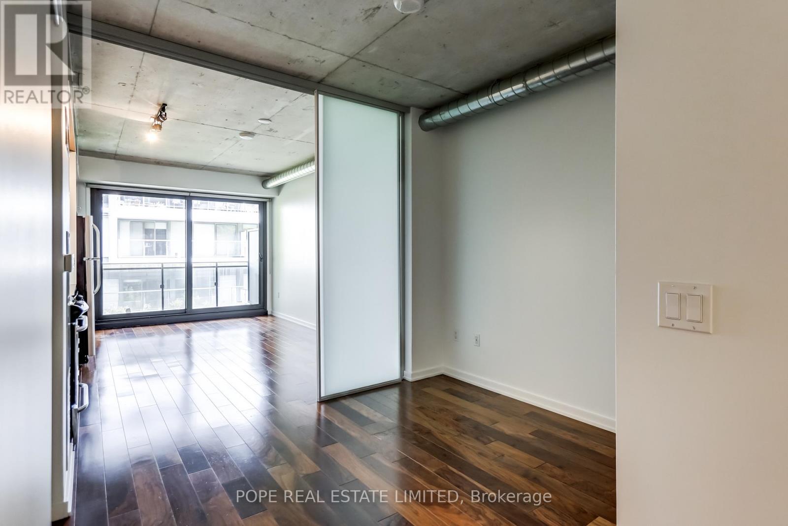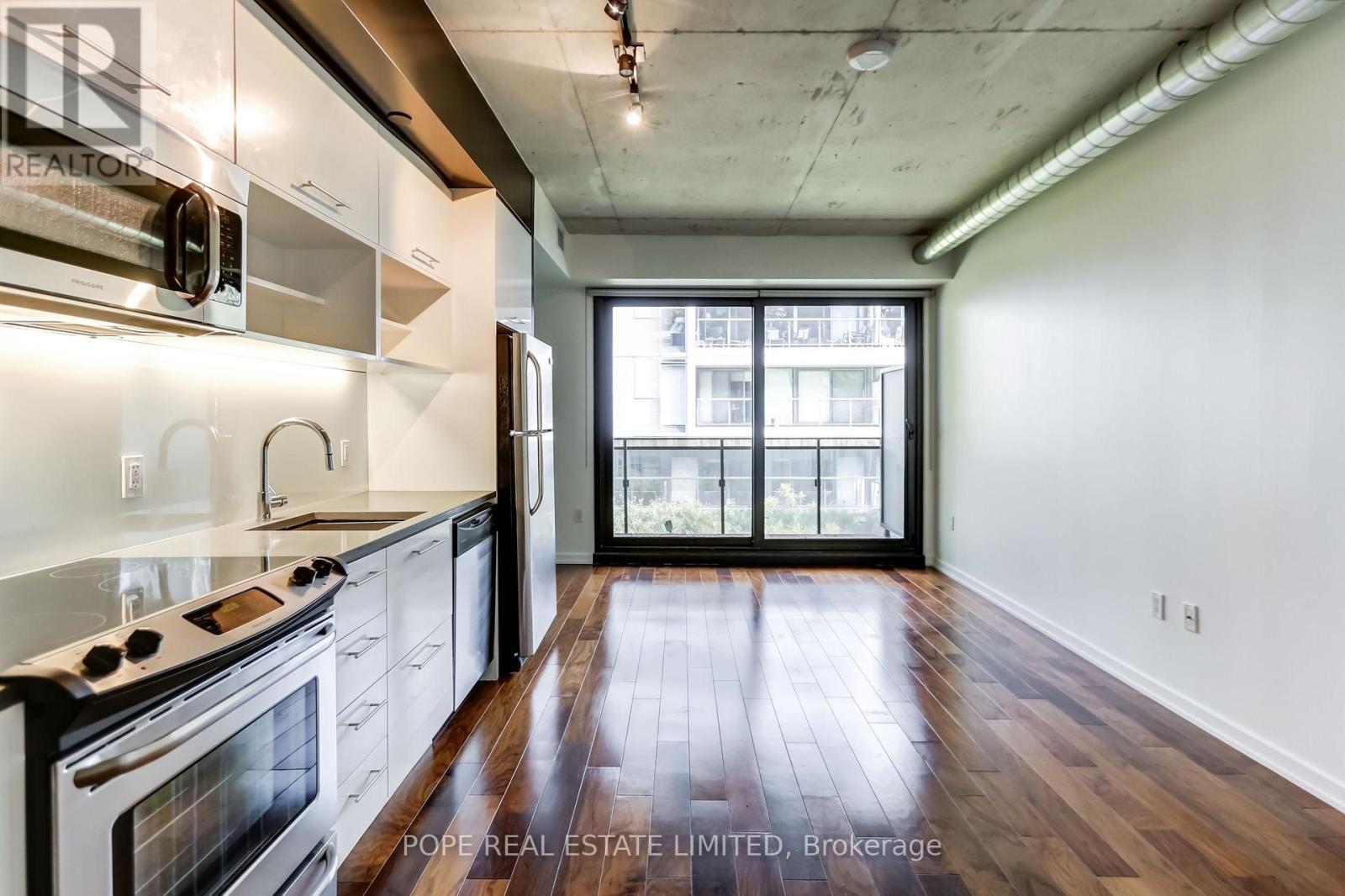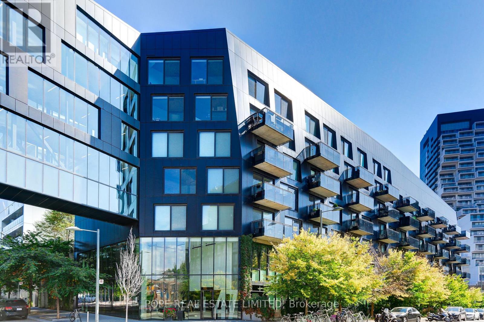 Architectural excellence by Saucier + Perrotte Architectes in collaboration with Urban Capital and Waterfront Toronto. Completed in 2013, River City Phase 1 is ideally located in the vibrant Corktown and West Don Lands communities on Toronto's east downtown waterfront. Steps to Riverside, Leslieville, the Distillery District, St. Lawrence Market, Corktown Commons, Don River Valley Park, the Waterfront Trail system, Ookwemin Minising - the new island created in the Port Lands, Biidaasige Park and the Toronto Islands. TTC 504 A & B, King streetcar at your doorstep with quick access to the DVP. Modern loft-style suite offering approximately 470 sq ft of thoughtfully designed interior space plus a 65 sq ft east facing balcony overlooking a lush landscaped courtyard. Features include 9' exposed concrete ceilings, exposed galvanized ductwork, and walnut flooring throughout. Contemporary white kitchen with stainless steel appliances and grey quartz countertops. Spa-inspired fully tiled bathroom with soaker tub, large vanity, mirrored cabinet, and ensuite laundry. Outstanding amenities include 24-hour concierge, fitness centre, two spacious party rooms with lounge, bar, kitchen and billiards, guest suite, outdoor pool, sun deck and BBQ area. Includes 1 storage locker and two bike racks. (id:64974)