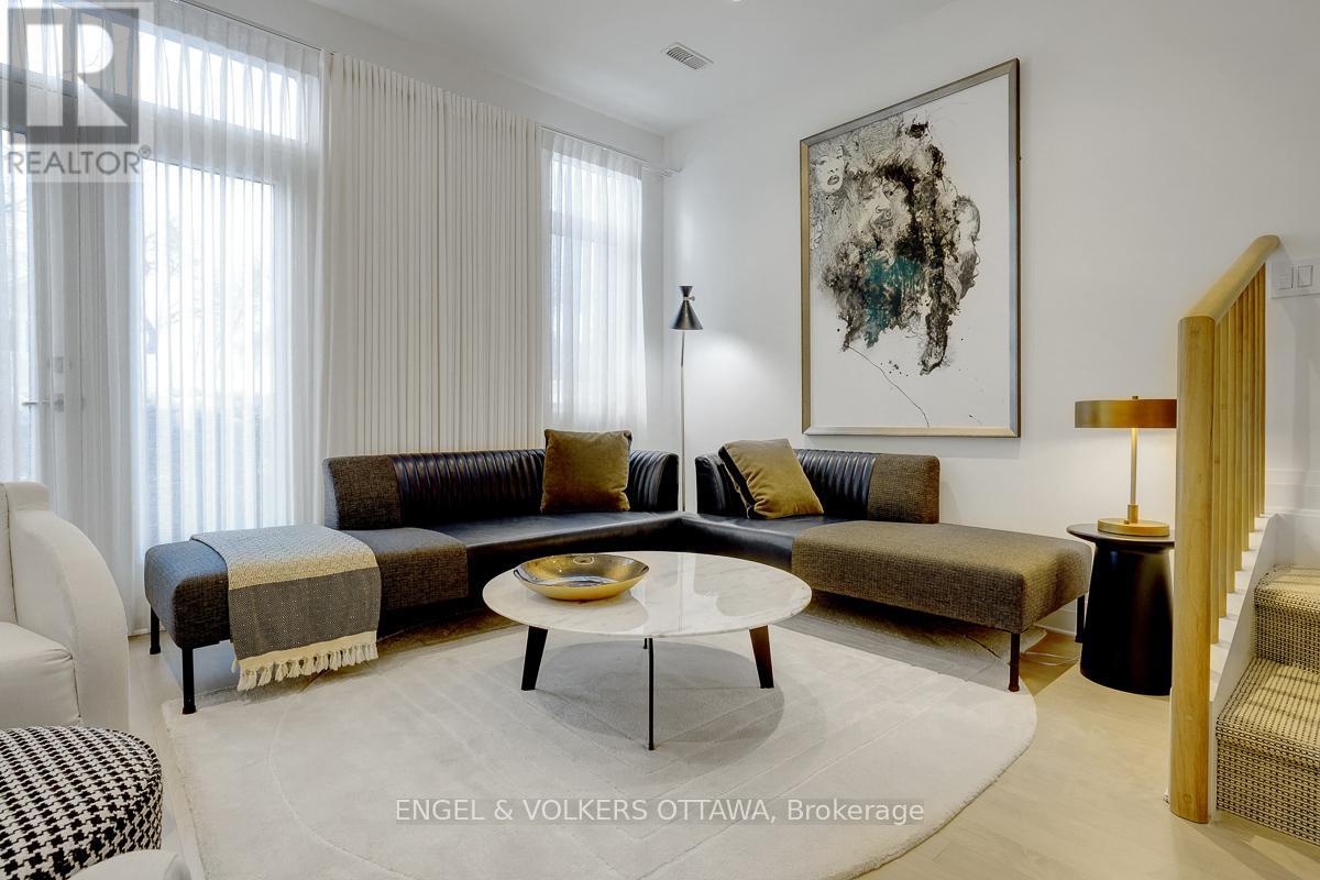 Welcome to Ravenhill Common-an exclusive enclave of contemporary, brownstone-inspired townhomes designed by architect Barry Hobin, ideally located in the heart of sought-after Westboro.The current owners of 449 Edison Avenue have transformed this already sophisticated residence into a truly exceptional luxury home, completing a comprehensive, top-to-bottom renovation in December 2024. Every detail was meticulously curated, with only premium materials and expert craftsmanship selected throughout.The main entry level opens to a spacious foyer offering abundant mudroom-style storage, a convenient two-piece powder room, and a versatile flex space ideal for a home office or fitness area. Direct interior access leads to a secure heated parking space, complete with additional storage and a water line for vehicle washing.The sun-filled main living level features 9-foot high ceilings and transom windows, creating a bright and airy atmosphere ideal for both everyday living and entertaining. This level includes a welcoming living room with access to a deck overlooking the quiet neighbourhood, an open dining area perfect for family gatherings, and a stunning custom kitchen. The kitchen is equipped with Fisher & Paykel appliances, a breakfast island ideal for morning coffee, and access to the rear terrace-perfect for alfresco dining.The second level offers a generous second bedroom, a full laundry room, and a family room that can be used as a third bedroom if desired. The third level with 9-foot high ceilings is devoted entirely to the primary retreat, featuring a custom walk-in closet, access to a private terrace, and a beautifully appointed five-piece ensuite-a true spa-like sanctuary.With no grass to cut and no snow to shovel, as maintenance is covered under common area fees, this home offers the ultimate lock-and-leave, maintenance-free lifestyle. For full details, see attached feature sheet. 24-hour irrevocable on all offers as per form 244. (id:64974)
