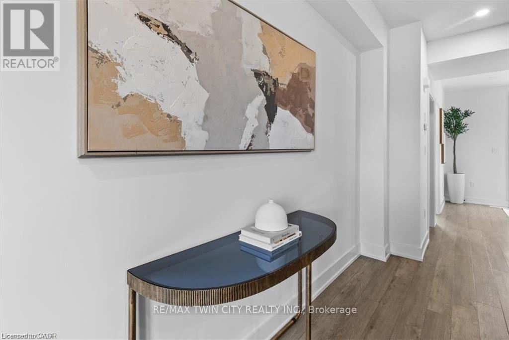The purchase price set out above is net of HST. How HST will be addressed will be determined at the time the Purchaser enters the agreement of purchase and sale, based on the status of the existing and proposed HST Rebates announced by the provincial and federal governments. - Welcome to this stunning 2-bedroom, 2-bathroom condo-townhouse, perfectly situated in the heart of Uptown Waterloo - where style, convenience, and location come together effortlessly. Just minutes from the University of Waterloo, Wilfrid Laurier University, LRT transit, restaurants, downtown Kitchener, Grand River Hospital, and the popular Spur Line Trail, this home places you in the center of it all. Inside, you'll find a thoughtfully designed space featuring beautiful vinyl plank flooring throughout and oversized windows that fill the home with natural light. The modern kitchen shines with elegant quartz countertops, stylish backsplash tile, and quality finishes that make it both functional and eye-catching. The layout offers excellent flexibility and privacy, with a spacious lower-level bedroom featuring a walk-in closet, and ensuite bathroom ideal for guests, roommates, or a home office. Step out onto your private balcony, perfect for enjoying your morning coffee or relaxing in the evenings. Whether you're a first-time buyer, professional, or investor, this property is a rare find in one of Waterloo Region's most walkable and desirable neighborhoods. (id:64974)