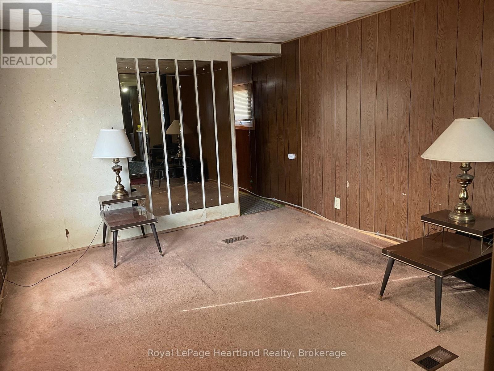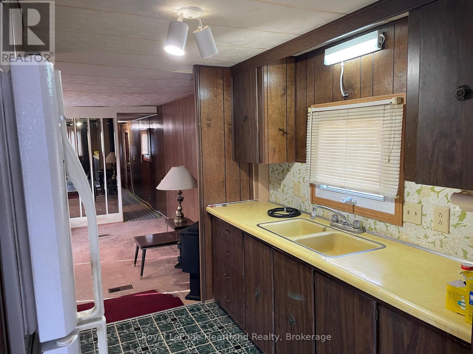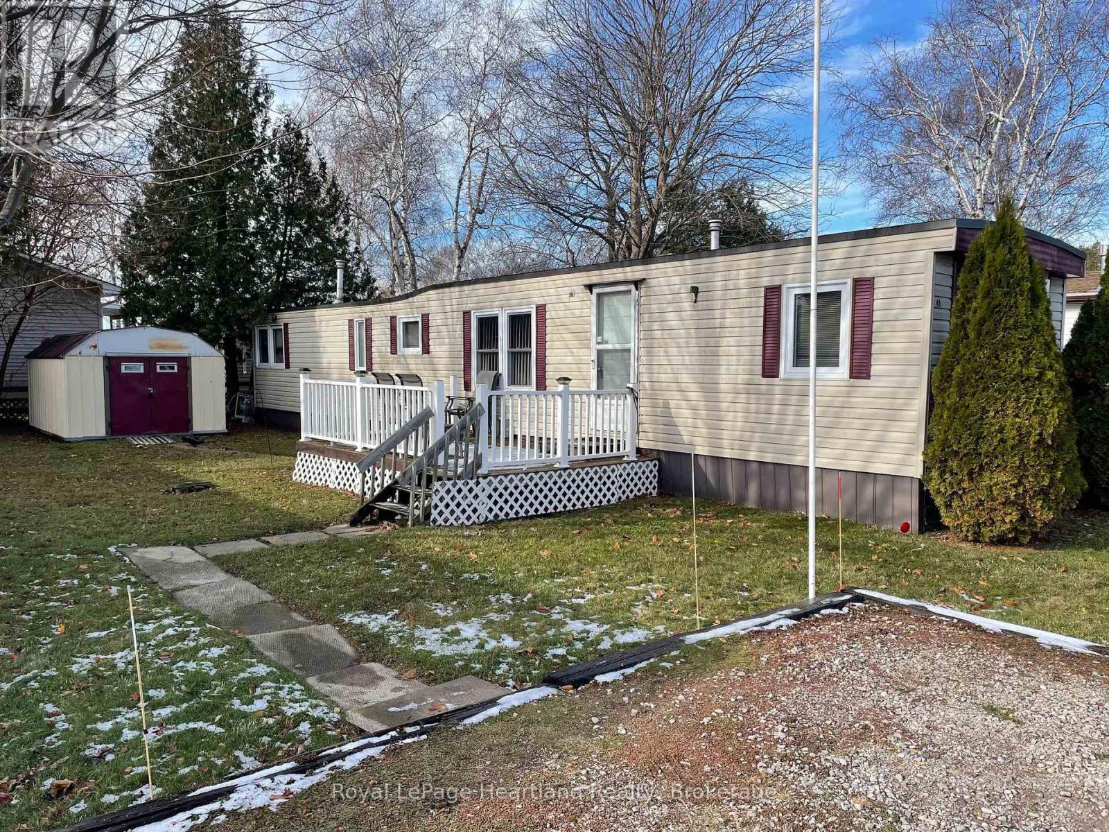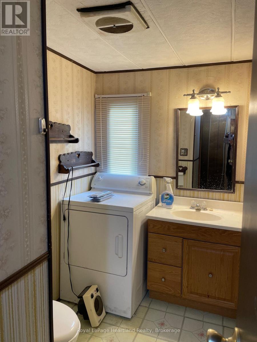 Affordable and ideal for handy persons, this 720-square-foot, 2-bedroom mobile features a 4-piece bathroom, a front dining room, and a living room. The home is heated solely by a gas fireplace, with a rented hot water tank and newer siding, roof, and windows. Appliances included in the sale are a fridge, freezer, washer and dryer. The kitchen has no stove or dishwasher. Additional features include a deck off the side entrance door and a shed for off-season storage. Located in Meneset on the Lake, an attractive 55+ land-lease community offering a private sandy beach, active clubhouse, nearby trails, and close proximity to the beautiful Town of Goderich; this home is perfect for anyone seeking a project in a highly sought-after location, with monthly costs including a $675.00 land lease, $32.08 lot taxes, $13.74 structure taxes, and $75.00 for water and sewer, totaling $795.82 per month. (id:64974)