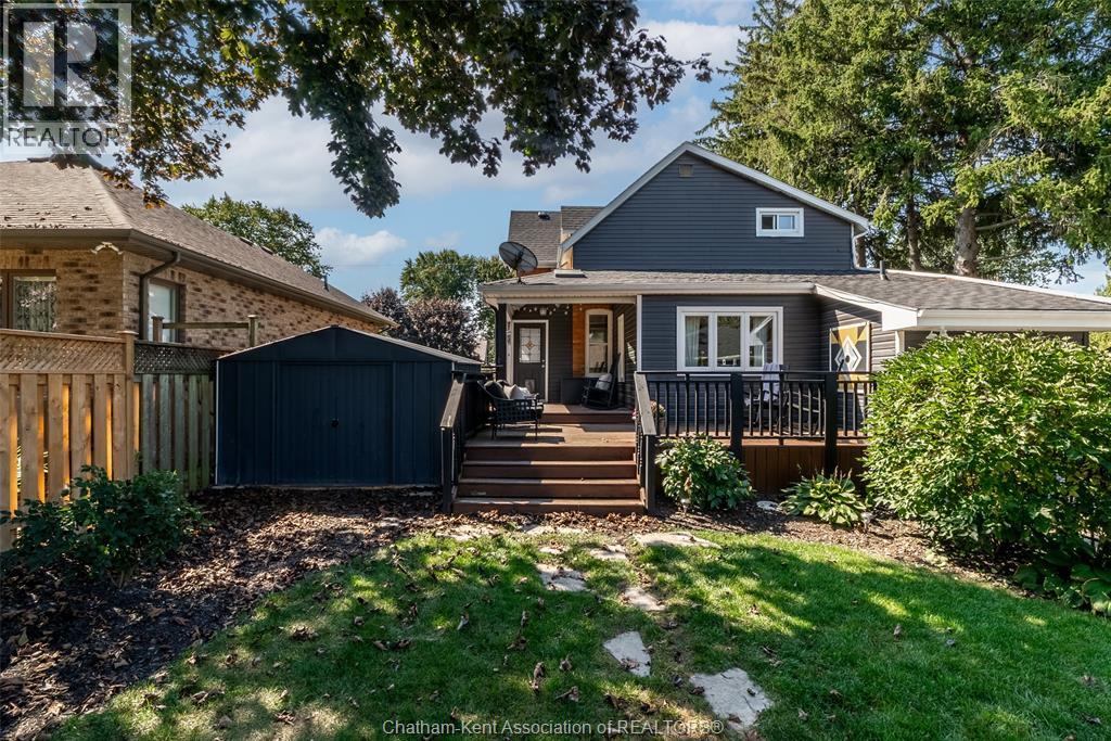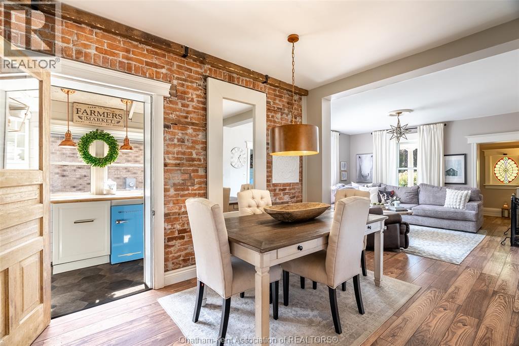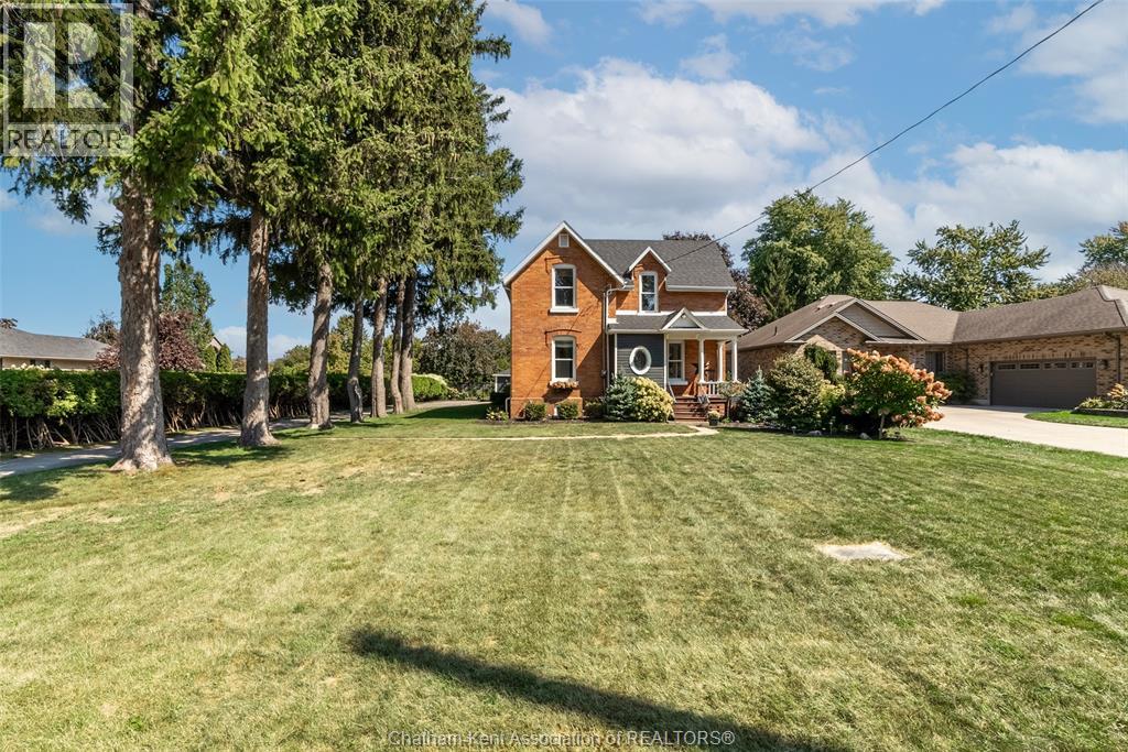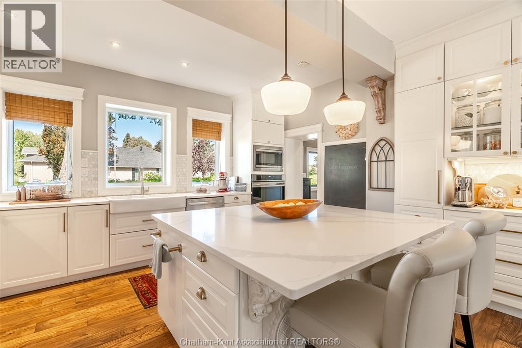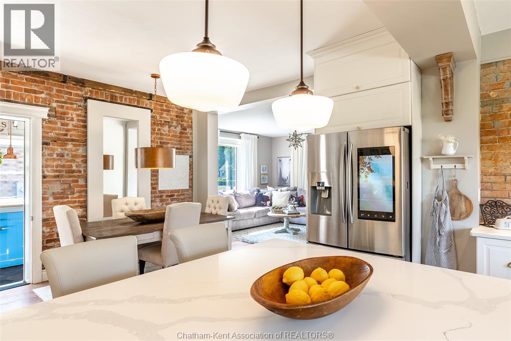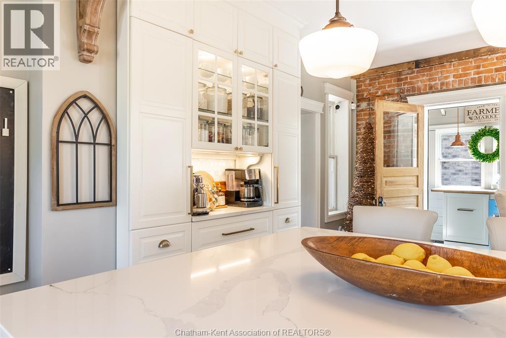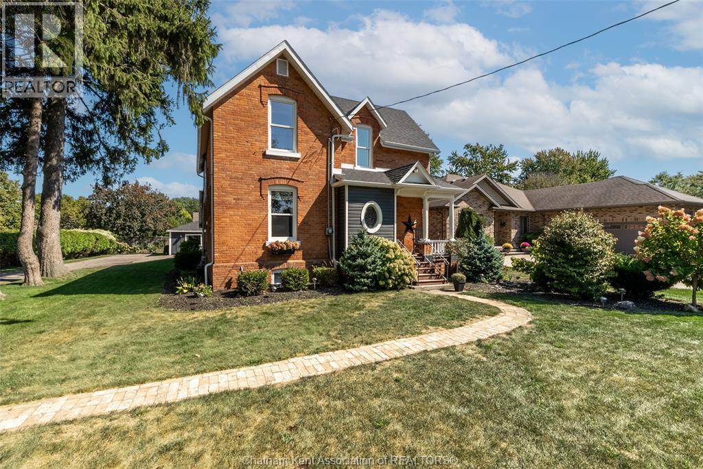 Showcasing timeless Victorian charm with thoughtful modern updates, this beautifully renovated 4-bedroom, 1.5-bath home is ideally situated on one of Chatham’s most prestigious streets. Set on a generous corner lot with a tree-lined driveway, the property offers exceptional curb appeal and a warm, welcoming presence. At the heart of the home, the kitchen serves as the central gathering space, featuring quartz countertops, a tiled backsplash, an oversized island, coffee bar, and glass-front cabinetry—perfectly balancing style and functionality. Surrounding this inviting space, the main floor offers a cozy family room, a versatile bedroom, a charming office/library, a convenient 2-piece bath with room to expand to a full bath, and a bright laundry area that opens to a welcoming deck with both sun and shade, while the back entrance provides seamless access to a functional basement mudroom below or the main living space above. Exposed brick throughout the home adds warmth, texture, and timeless character, highlighting its Victorian heritage while complementing the modern updates. Upstairs, three spacious bedrooms are complemented by a luxurious spa-inspired 5-piece bath with a soaker tub and separate shower. The basement offers abundant storage along with practical space for hobbies or tools. Natural light fills the home and extends outdoors to a fenced yard, garden shed, and covered front porch. The converted garage provides a flexible space ideal for additional living, a home office, home gym, or studio, and can easily be restored to a double-car garage. With its perfect blend of character, updates, and versatile living options, this Victorian gem truly has it all. (id:64974)