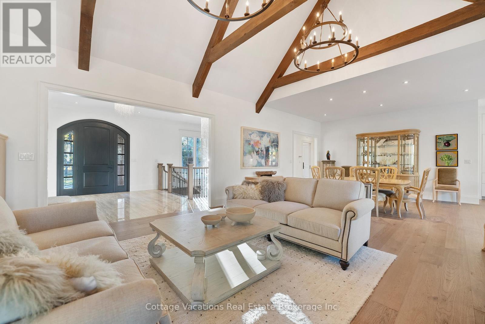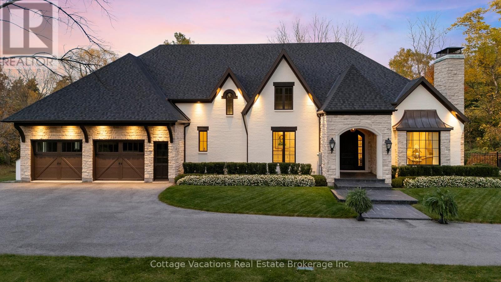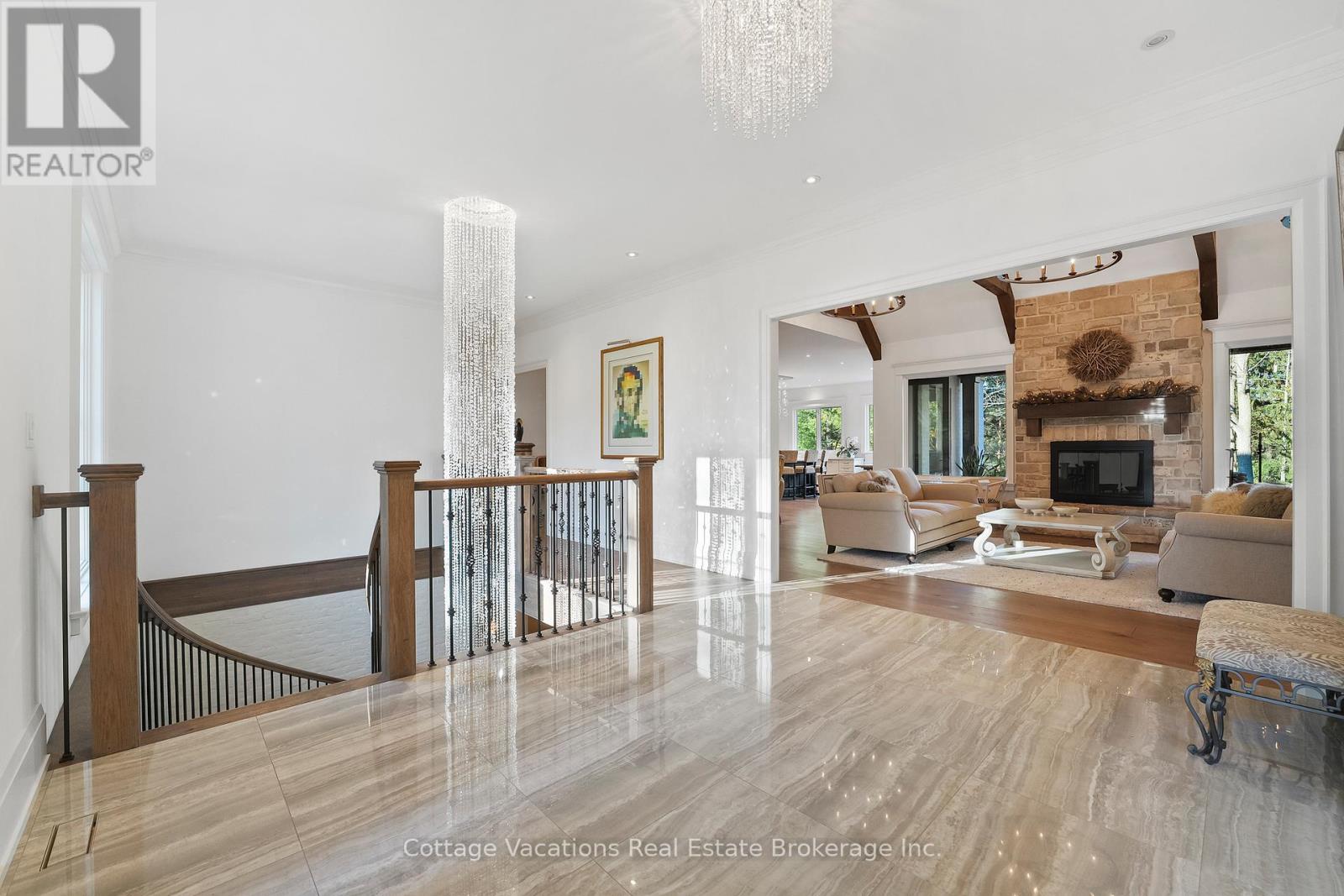 Experience Refined Living In This Exquisite Estate Nestled In The Heart Of Historic Niagara On-The-Lake. Set On Nearly Three Acres Of Lush, Wooded Grounds, This Custom-Built Home Embraces A Modern French Country Aesthetic And Offers Unparalleled Privacy Just Moments From The Lake. Stroll To Nearby Boutiques, Acclaimed Restaurants, Theatres, And Golf Courses, And Enjoy The Vibrant Lifestyle That Makes This Community So Sought-After. Step Through An Impressive Stone Entryway Into A Grand Foyer Illuminated By Sparkling Crystal Chandeliers, Immediately Setting A Tone Of Sophistication. The Formal Living Room Invites Cozy Gatherings Around A Beautiful Cast Stone Gas Fireplace, While The Expansive Great Room Captivates With Vaulted Ceilings, Exposed Beams, And Abundant Natural Light Streaming Through Oversized Windows. A Charming Sunroom Offers A Peaceful Sanctuary For Morning Coffee, And The Upper Deck Complete With A Gas Fireplace Creates A Perfect Backdrop For Intimate Evenings Under The Stars. The Gourmet Kitchen Is Designed To Inspire Culinary Creativity, Featuring Granite Countertops, Premium Appliances Including A Sub-Zero Refrigerator And Wolf Induction Cooktop, And A Generous Walk-In Pantry. The Main-Level Primary Suite Provides A Serene Retreat With Spacious Walk-In Closets And A Spa-Inspired Ensuite Adorned With Luxurious Finishes. The Lower Level Reveals An Entertainers Paradise With A Family Lounge, Direct Access To A Pool Deck, Sauna, Hot Tub, And A Temperature-Controlled Wine Cellar. Four Additional Ensuite Bedrooms Ensure Comfort And Privacy For Family And Guests Alike. Impeccably Landscaped Gardens Surround The Estate, Offering A Stunning Outdoor Setting Ideal For Entertaining Or Quiet Relaxation. This Extraordinary Home Seamlessly Blends Timeless Elegance With Modern Comforts, Making It Truly One Of A Kind In Niagara-On-The-Lake (id:64974)