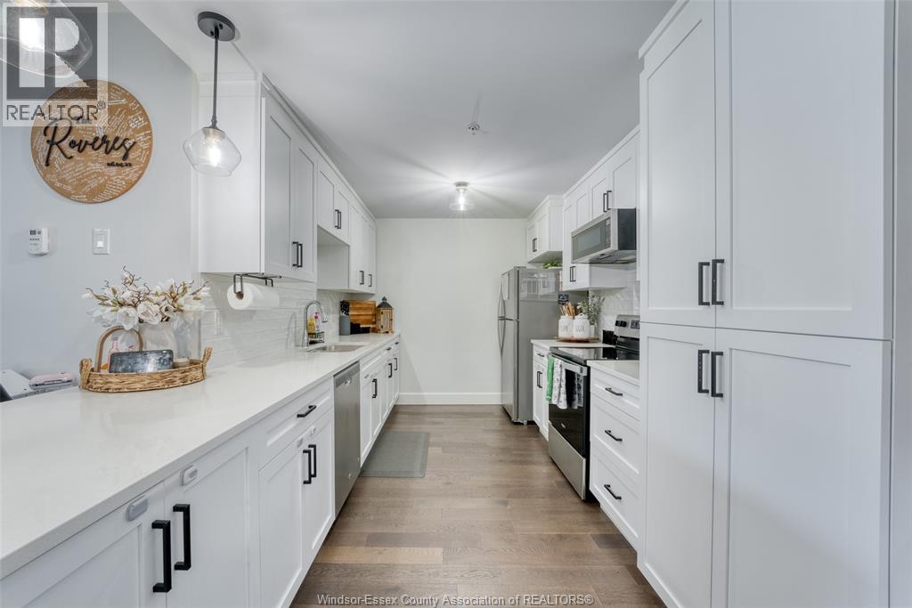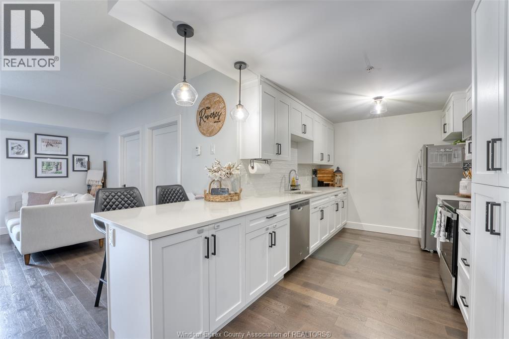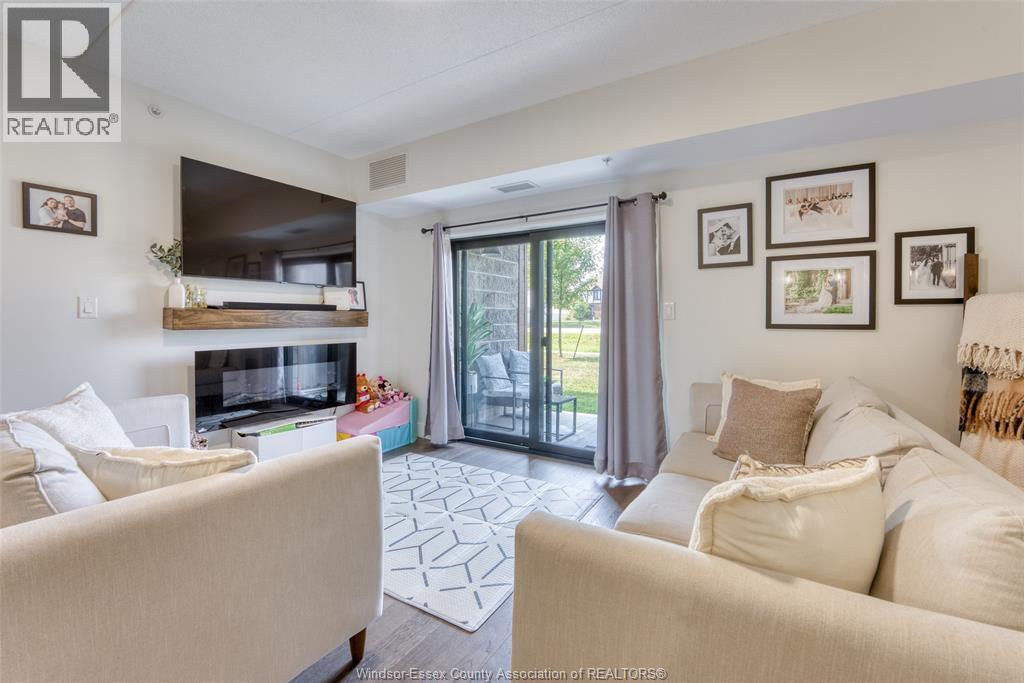 Welcome to effortless living in this beautifully designed, barrier-free 2-bedroom, 2-bathroom ground-floor suite, nestled in a quiet, well-maintained concrete building, with secure entry, that offers both peace of mind and long-term durability. Step inside to discover a spacious, open-concept kitchen featuring sleek quartz countertops, premium soft-close cabinetry, and stainless steel appliances. Enhance your morning routine with the bonus built-in coffee bar. The primary bedroom is a private retreat, complete with a walk-in closet and a bright ensuite bathroom boasting a fully tiled shower and extra built-in storage -ideal for keeping everything neat and organized. Both bathrooms are thoughtfully designed with accessibility and style in mind. Enjoy hardwood flooring throughout the main living areas, with tile in the bathrooms and in-suite laundry room—blending durability with modern design. Every inch of this home has been crafted for comfort, accessibility, and easy living. Bonus: secure storage space on 1st floor. Located in a desirable, walkable neighborhood, you're just minutes from St. Clair College, and the newly developing Shoppes at Heritage. Commuting is a breeze with quick access to Hwy 401, Hwy 3, and the Expressway. Whether you're a first-time buyer, downsizing, investing, or simply looking for a stylish, accessible home with zero compromise—this suite checks every box. (id:64974)