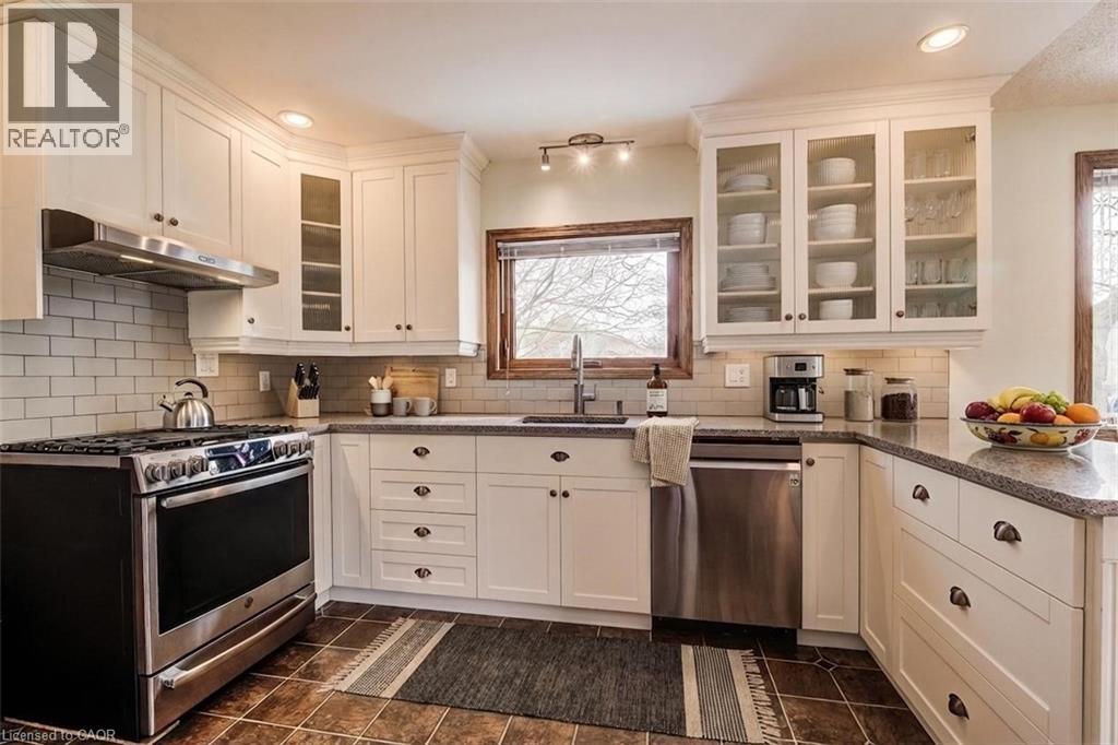Welcome to 458 Winston Blvd. This Executive-style Hespeler bungalow offers over 3,000 sq ft of finished living space, set on a large private lot and featuring a double car garage. From the moment you enter, you’re welcomed by wide hallways finished with engineered hardwood, creating an immediate sense of space and quality. The main floor features a spacious separate living room and a dedicated formal dining room, along with 3 generously sized bedrooms and 2 full bathrooms, including a generous primary suite with its own ensuite. Bright, oversized rooms and large windows throughout provide an abundance of natural light. The fully renovated kitchen showcases custom cabinetry and stainless steel appliances, quartz countertop and includes a bright kitchen dinette with views of the rear yard. The kitchen opens into a welcoming living room with a cozy gas fireplace and large bay windows—perfect for everyday living and entertaining. The finished basement adds exceptional versatility with a dedicated office space, a full spa-style bathroom with sauna, and plenty of additional living area. Step outside to enjoy the expansive yard complete with a deck featuring a durable composite surface, a separate shed, and ample space for a workshop. Triple-pane, top-of-the-line windows throughout the home add comfort and efficiency. Additional features include a secondary electrical panel and central vacuum, Windows 2014, 35 year shingled roof 2005, Furnace and A/C 2014. A rare opportunity to own a spacious, well-appointed bungalow with premium features inside and out. (id:64974)