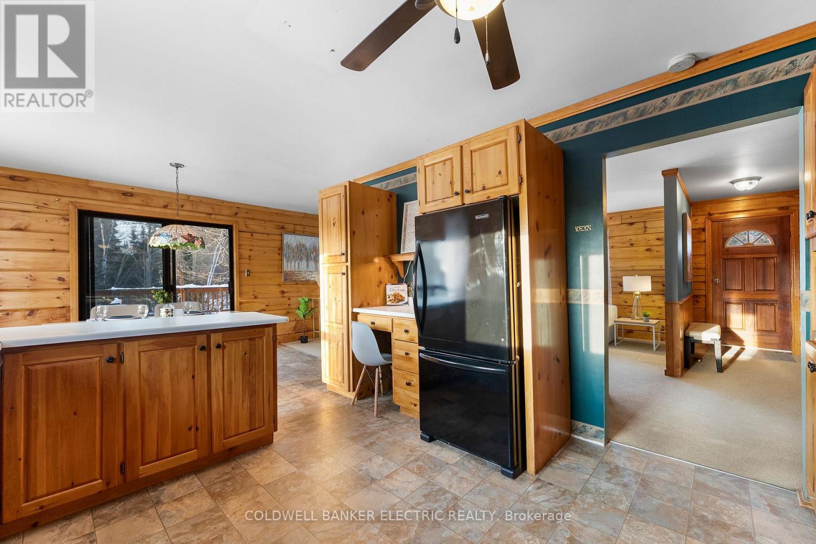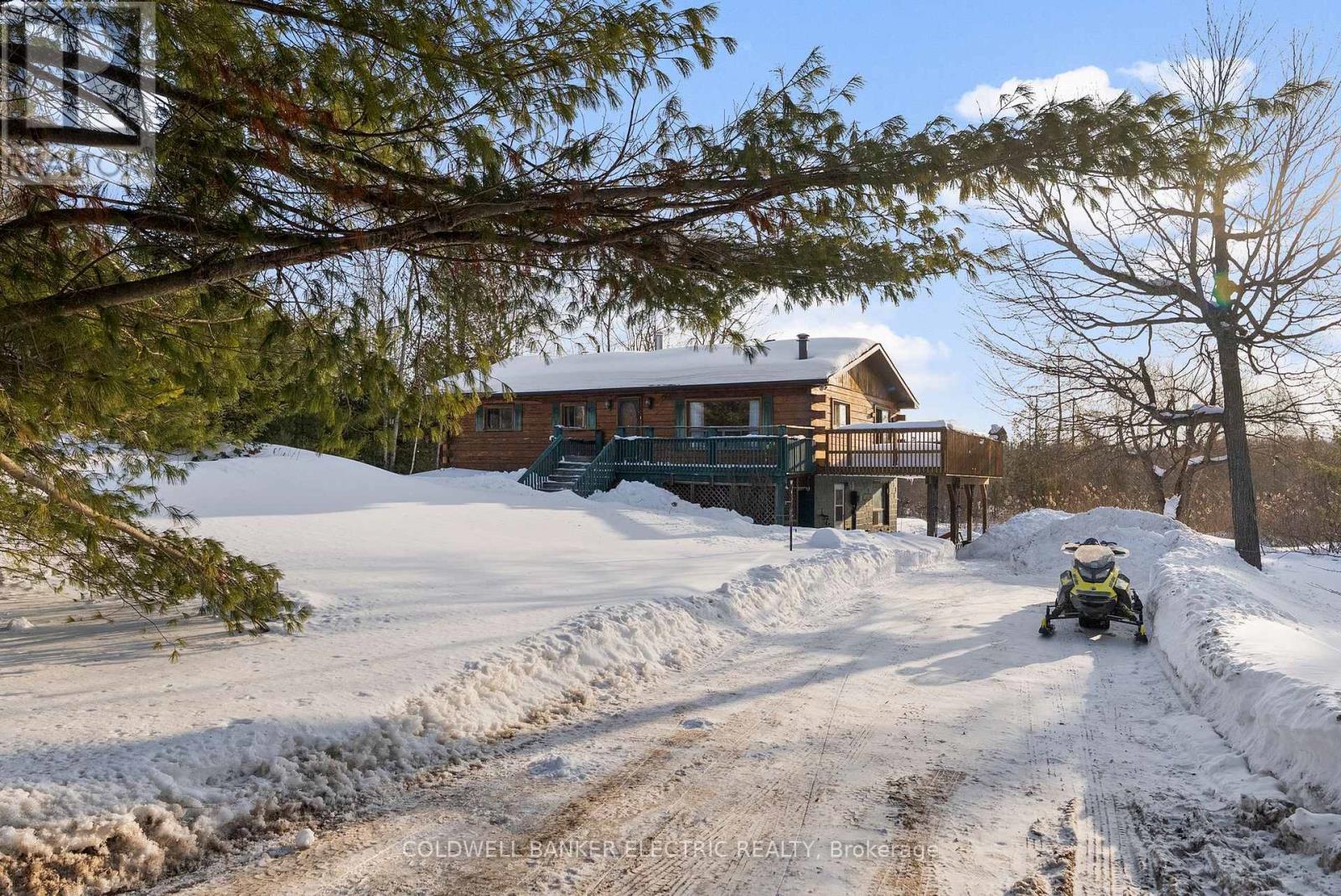 Country living with direct trail access! This 4-bedroom, 2-bath home offers rustic charm and year-round recreation, with snowmobile trail access in the backyard and ATV trail access along the front of the property. The bright main level features a spacious living room with wood accents and a cozy stone fireplace, a functional kitchen with ample cabinetry, and a dining area with walkout to the deck overlooking the scenic, treed lot. The finished lower level offers a large recreation space with walkout access, plus additional storage and utility areas. Enjoy your own private pond, a beautiful willow tree adding character to the landscape, and two sheds for extra storage. With space to roam and adventure at your doorstep, this property is ideal as a full-time residence or recreational retreat. (id:64974)