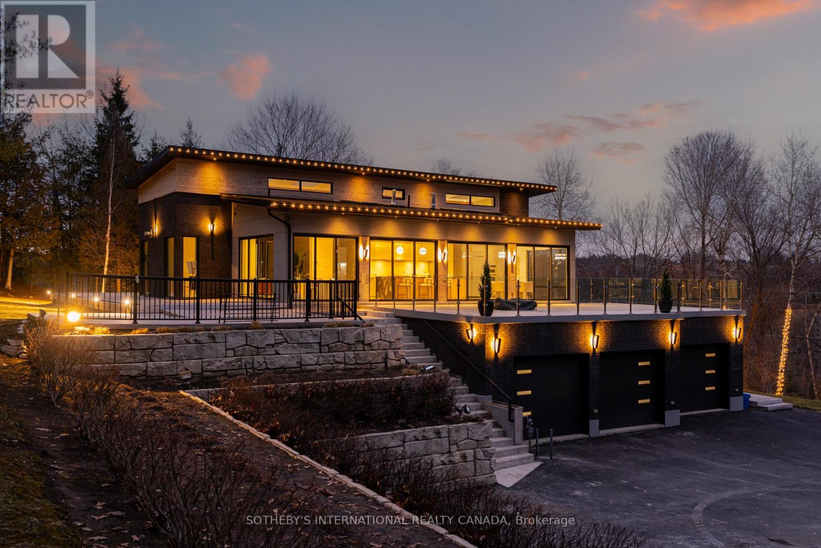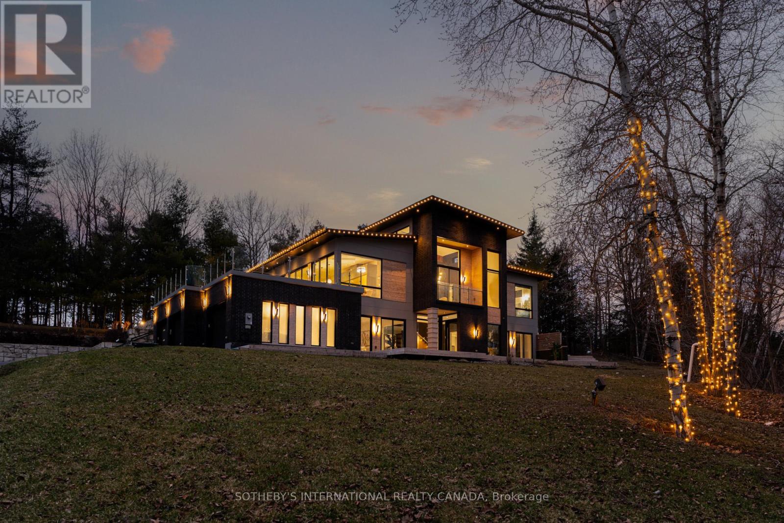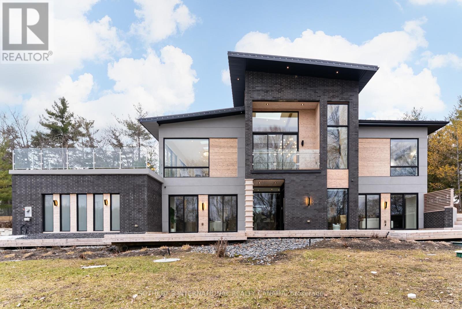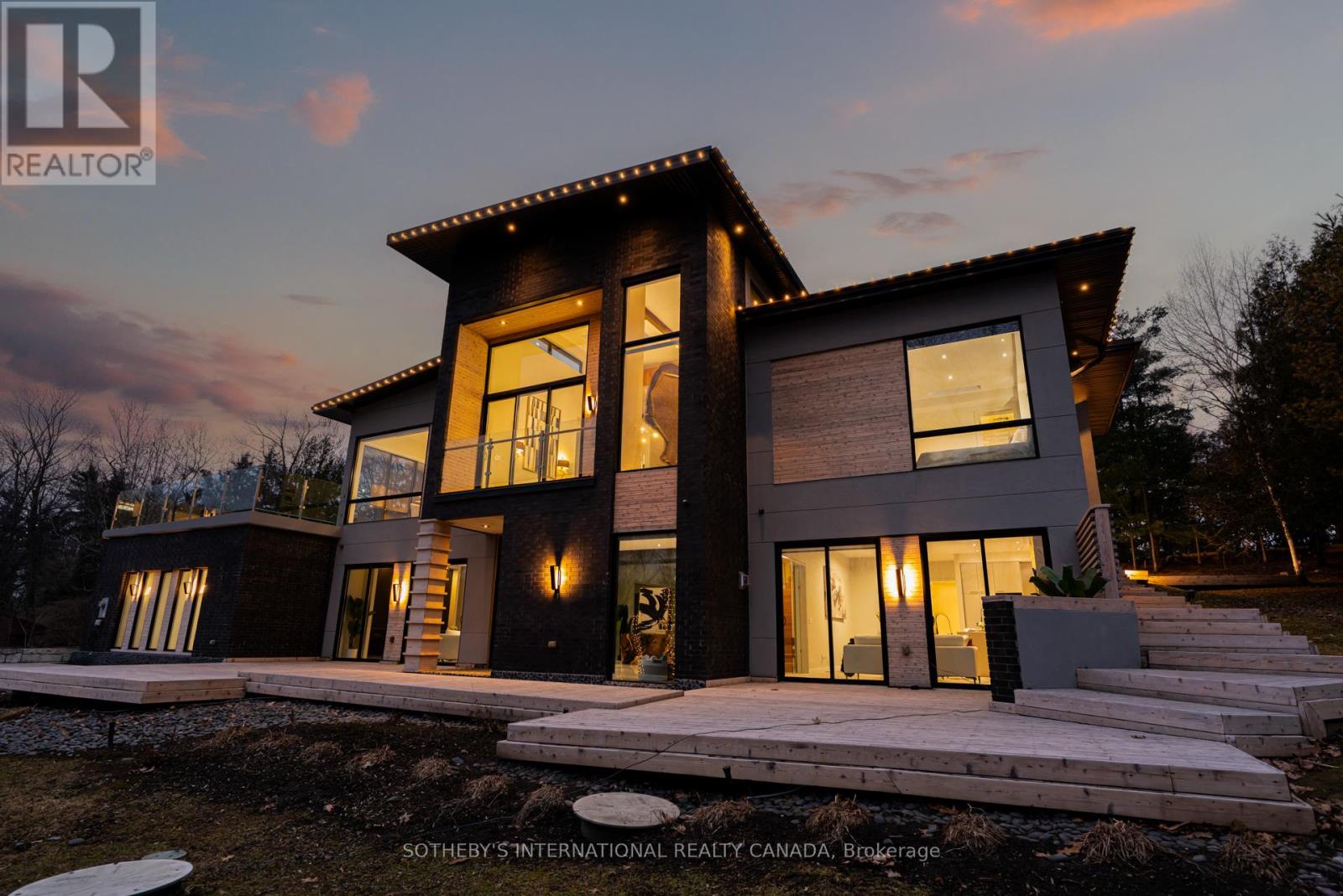 Set on an exceptional 1-acre estate lot surrounded by mature trees. Offering approximately 5300 sq. ft of refined living space, this custom-built residence delivers the ultimate in modern luxury, premium finishes, and versatility. A true highlight and one of the most sought-after luxury features of 2026 is the home's exceptional multi-generational living design. The ground level offers 10' ceilings and two impressive condo-sized suites, each complete with a full kitchen, living room, bedroom, bathroom, in-suite laundry and a dedicated terrace with sliding doors. In addition, a separate studio suite with its own kitchen and bathroom provides a flexible third space, ideal for extended family, guests, live-in staff, or a private executive office. The home is defined by the unique upside-down floor plan to maximize the surrounding views. Offering dramatic 10'-16' ceilings complemented by expansive floor-to-ceiling windows that flood the interior with natural light. A seamless indoor-outdoor flow anchors the principal living spaces, ideal for both everyday living and elevated entertaining. Outdoor living is equally impressive, with a spectacular 970 sq. ft infinity cedar deck overlooking the serene landscape, as well as a rare 915 sq. ft rooftop terrace, perfect for entertaining or unwinding in total privacy. Ideally located just minutes to top-tier schools, golf courses, fine dining, and major commuter routes, this is a rare offering that combines privacy, prestige, and forward-thinking design, perfectly suited for today's luxury buyer. (id:64974)