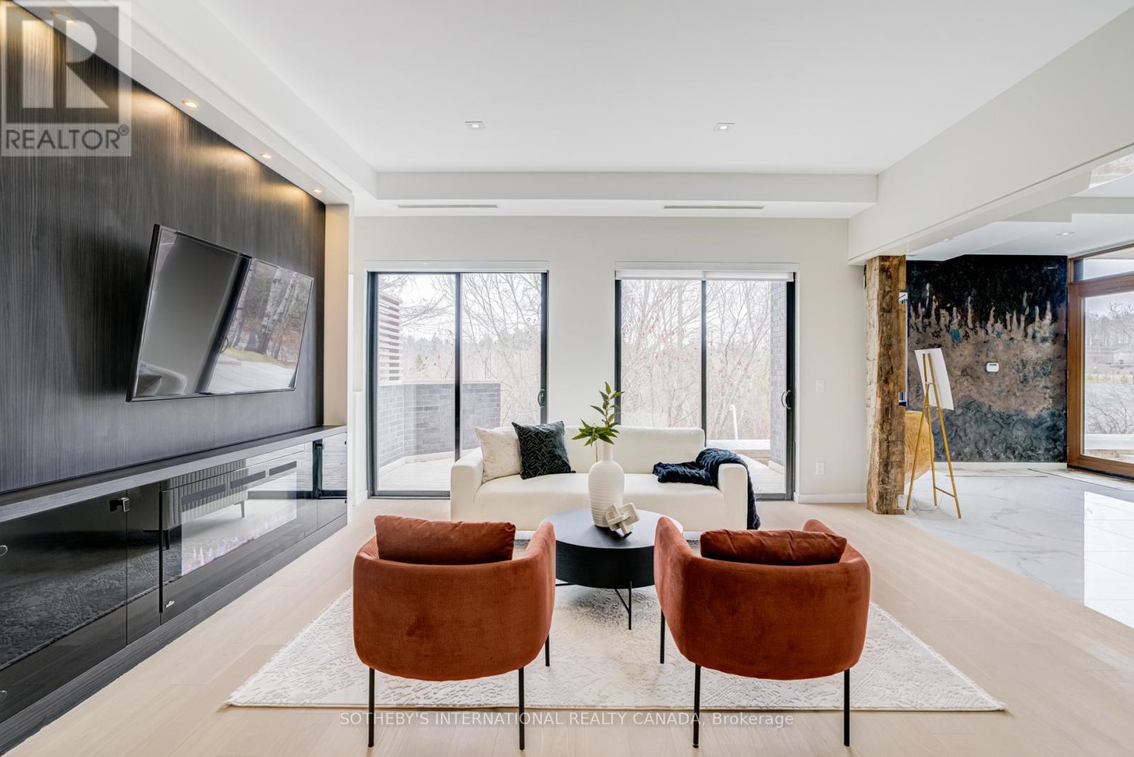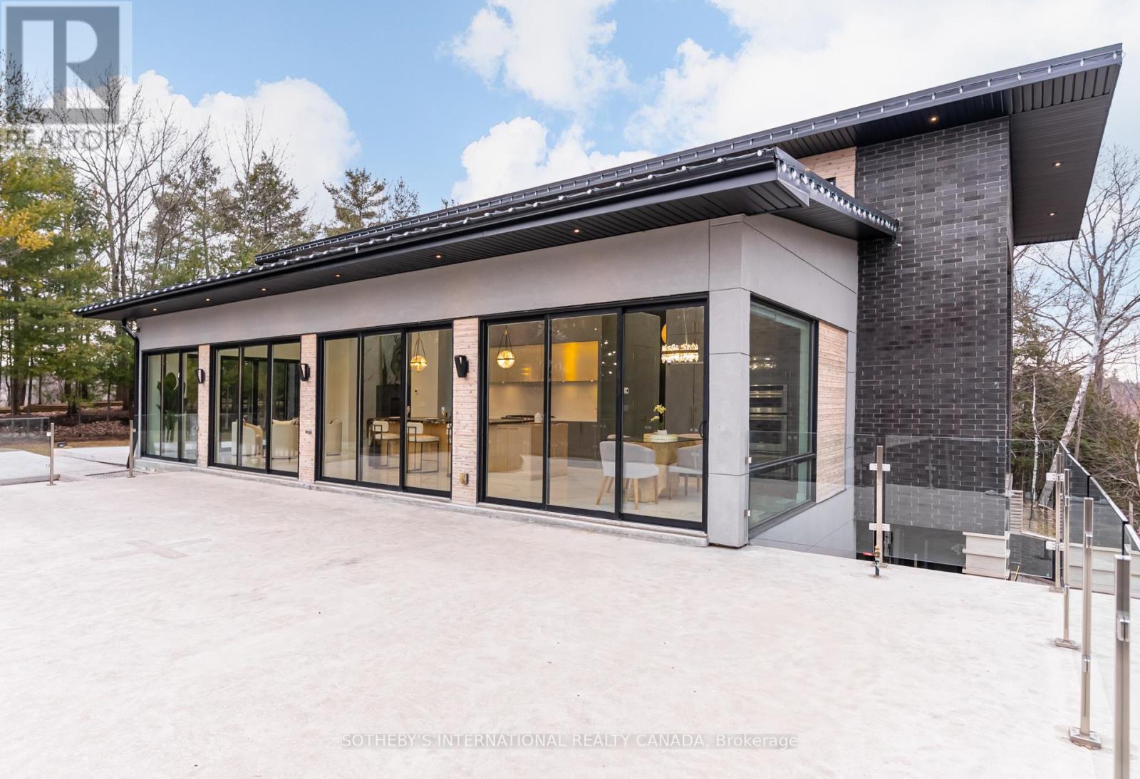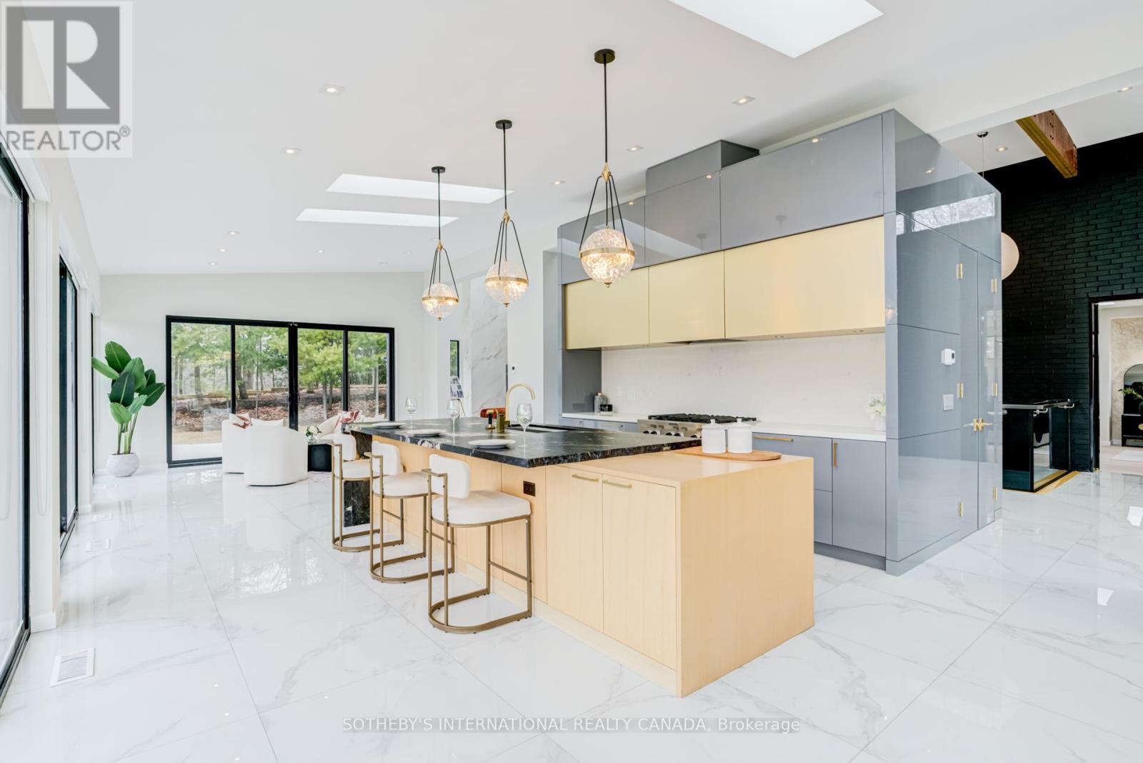 Set on an exceptional 1-acre estate lot surrounded by mature trees. Offering approximately 5300 sq. ft of refined living space, this custom-built residence delivers the ultimate in modern luxury, premium finishes, and versatility. A true highlight and one of the most sought-after luxury features of 2026 is the home's exceptional multi-generational living design. The ground level offers 10' ceilings and two impressive condo-sized suites, each complete with a full kitchen, living room, bedroom, bathroom, in-suite laundry and a dedicated terrace with sliding doors. In addition, a separate studio suite with its own kitchen and bathroom provides a flexible third space, ideal for extended family, guests, live-in staff, or a private executive office. The home is defined by the unique upside-down floor plan to maximize the surrounding views. Offering dramatic 10'-16' ceilings complemented by expansive floor-to-ceiling windows that flood the interior with natural light. A seamless indoor-outdoor flow anchors the principal living spaces, ideal for both everyday living and elevated entertaining. Outdoor living is equally impressive, with a spectacular 970 sq. ft infinity cedar deck overlooking the serene landscape, as well as a rare 915 sq. ft rooftop terrace, perfect for entertaining or unwinding in total privacy. Ideally located just minutes to top-tier schools, golf courses, fine dining, and major commuter routes, this is a rare offering that combines privacy, prestige, and forward-thinking design, perfectly suited for today's luxury buyer. (id:64974)