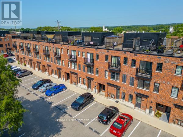 Live in style in the heart of Aldershot Village! This bright, modern, spacious, 3 bedroom, 2.5 bathroom townhome is within walking distance of several highlights in the neighbourhood including: Lasalle Park, Burlington Bay, the GO Station, and The RGB. Upon entering the home you will find an inviting entryway with a large closet, modern decor style and hardwood staircase that leads to an equally impressive main level living area. The open concept kitchen is truly a delight, showcasing a breakfast bar with granite counters, a tile backsplash, stainless steel appliances, modern fixtures and a huge, functional pantry! Surrounding the kitchen you will find a generous dining space accented by large south facing windows that flood the space with natural light. On the other side of the kitchen is the living room which also features large windows and enough space to host many visitors comfortably. Completing the main level is a convenient powder room and utility closet. Upstairs you will find a primary bedroom suite with a private ensuite bath, walk in closet and tons of natural light pouring through the patio doors that open to the juliette balcony. On this level you will also find two additional bedrooms (both with windows, but no closets), a 4 pc main bathroom, linen closet and handy, stacked laundry in the hall. But the unexpected surprise of the home is on the 4th level, a cheerful office space leading to a massive rooftop patio! This sunny, fully enclosed space (with a lake view in certain seasons) offers the perfect setting for a morning coffee, summer bbqs, or evening cocktails under the stars. While there is an owned parking spot and lots of visitor spaces, this property offers you the opportunity to ditch your car, use public transit, & bike or walk to local schools, shops, restaurants, and other amenities. With added perks like daily access to garbage disposal and seasonal window washing, you will love this low maintenance urban lifestyle nestled in nature. (id:64974)