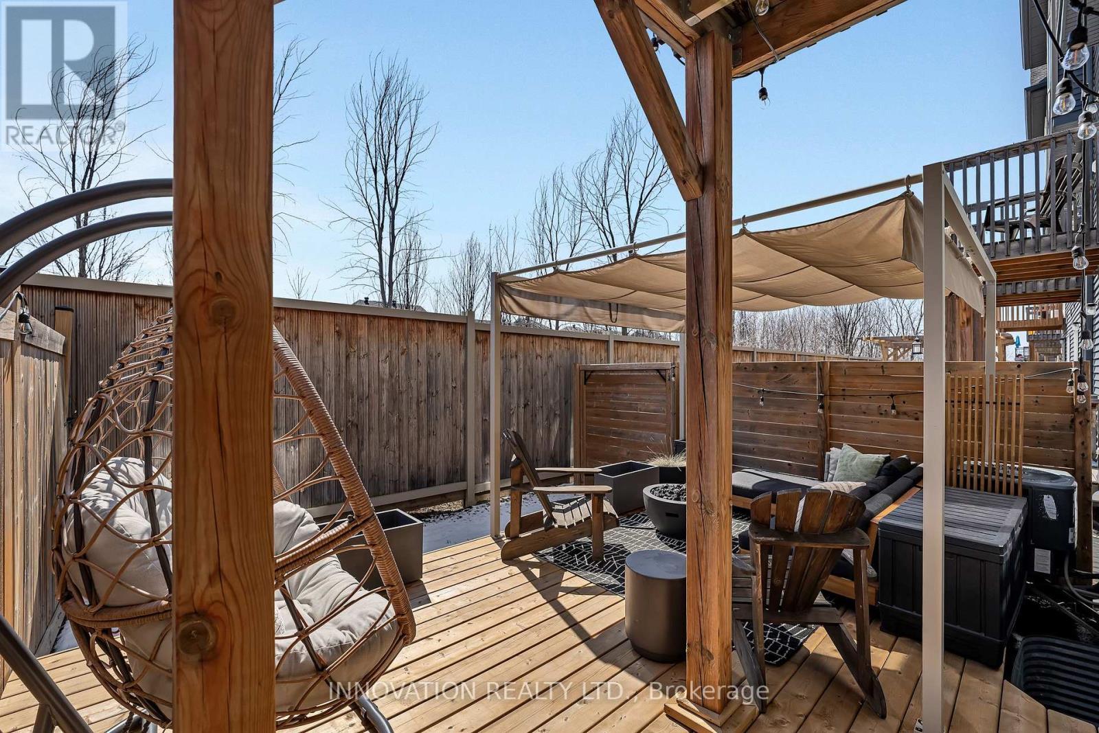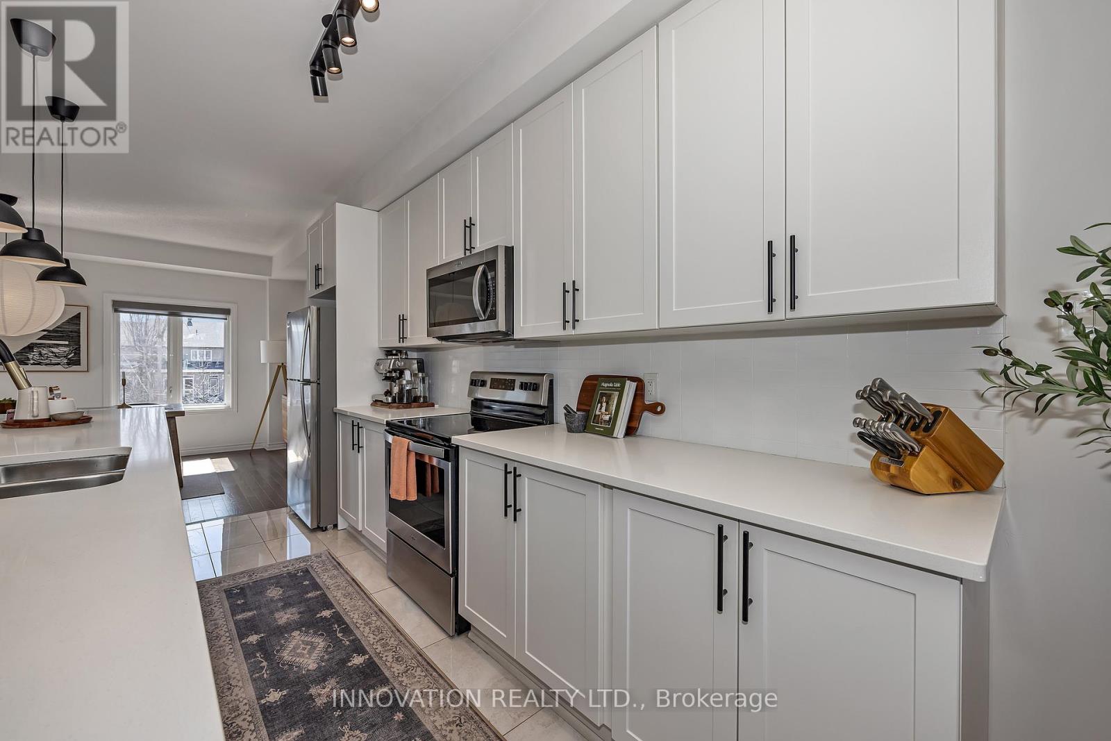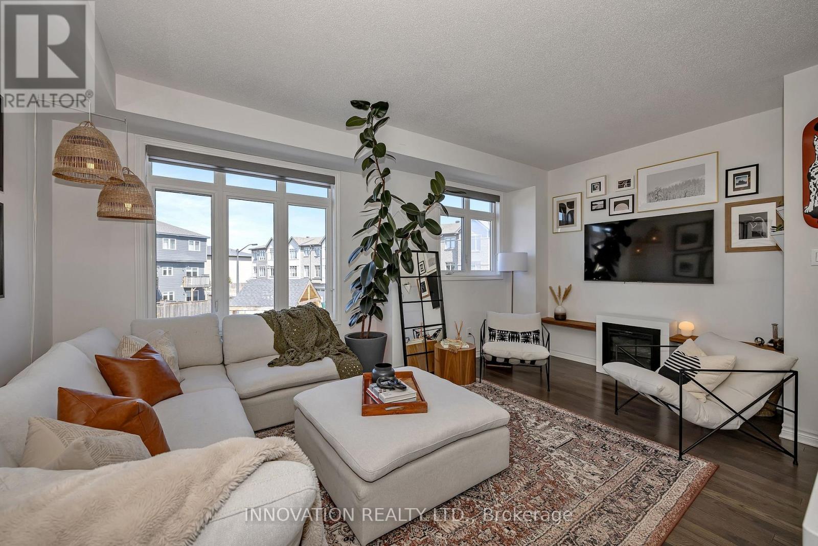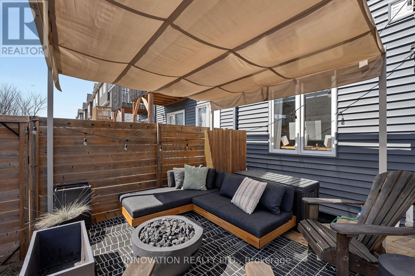 Welcome to this striking, design-forward three-storey townhome, built in 2019 and meticulously upgraded to impress. Offering 3 Bedrooms and 3 Bathrooms, this residence delivers a bold blend of modern style and refined comfort. The entry level sets the tone with a sleek tiled foyer leading into a versatile, sun-filled space-perfect as a home office or lounge. Rich hardwood floors elevate the room, which opens seamlessly to a private backyard retreat featuring a new '25 deck and elegant gazebo-your own urban escape. The 2nd level is nothing short of showstopping. A bright, open-concept layout showcases a chef-inspired Kitchen anchored by an sprawling Breakfast bar with seating for 6-8, quartz countertops, stainless steel appliances, made for entertaining in style. Hardwood floors run throughout, complemented by custom built-in dining cabinetry and a sophisticated electric fireplace that defines the living space. Step out onto the balcony and unwind with rare, unobstructed views of a mature, tree-lined ravine that is serene, private, and simply stunning. Upstairs, the 3rd level offers 3 generously sized Bedrooms, including a luxurious Primary Bedroom retreat complete with dual walk-in closets and a beautifully finished 3 pc ensuite Bath. Additional Bedrooms provide flexibility for family, guests, or a polished home office. The unfinished Basement offers a blank canvas - ideal for a media lounge or fitness studio. Ideally located close to schools, shopping, and everyday amenities, this home also features a private road with ample visitor parking plus bonus electric car charger in garage! A rare opportunity to own a turnkey, style-driven home in an exceptional setting-where modern living meets natural beauty. 24 hour irrevocable on all Offers (id:64974)