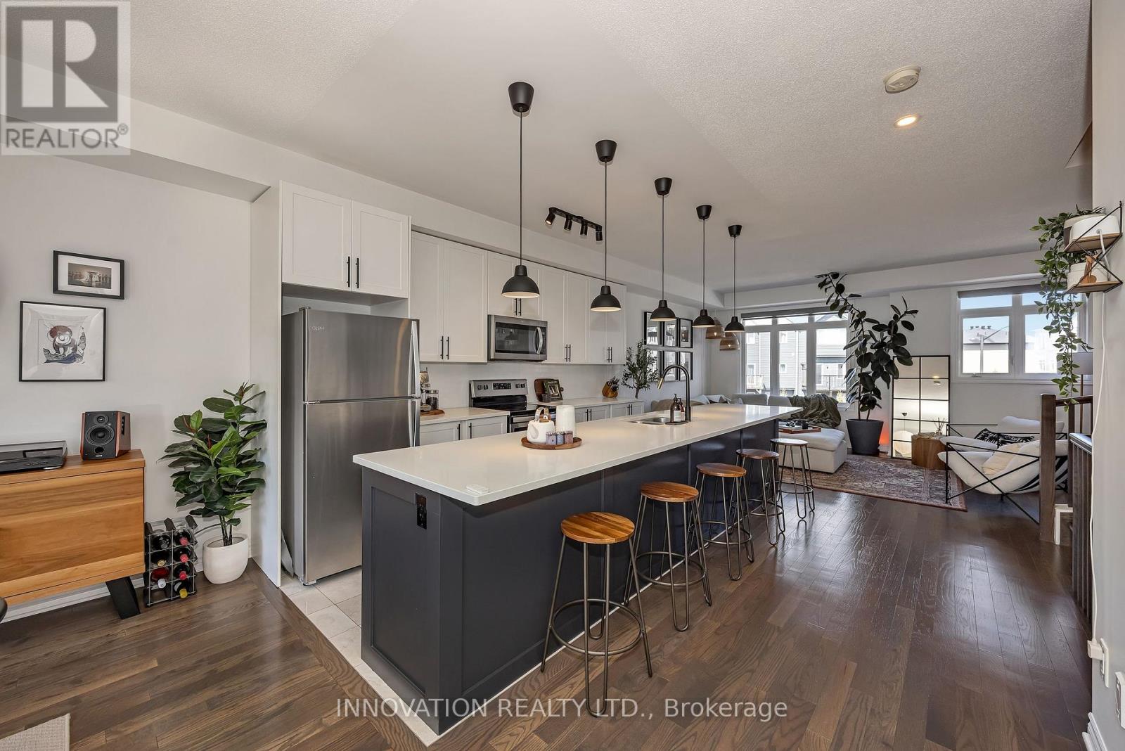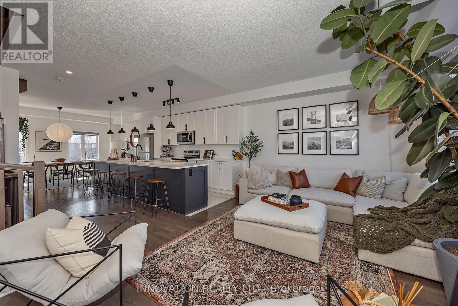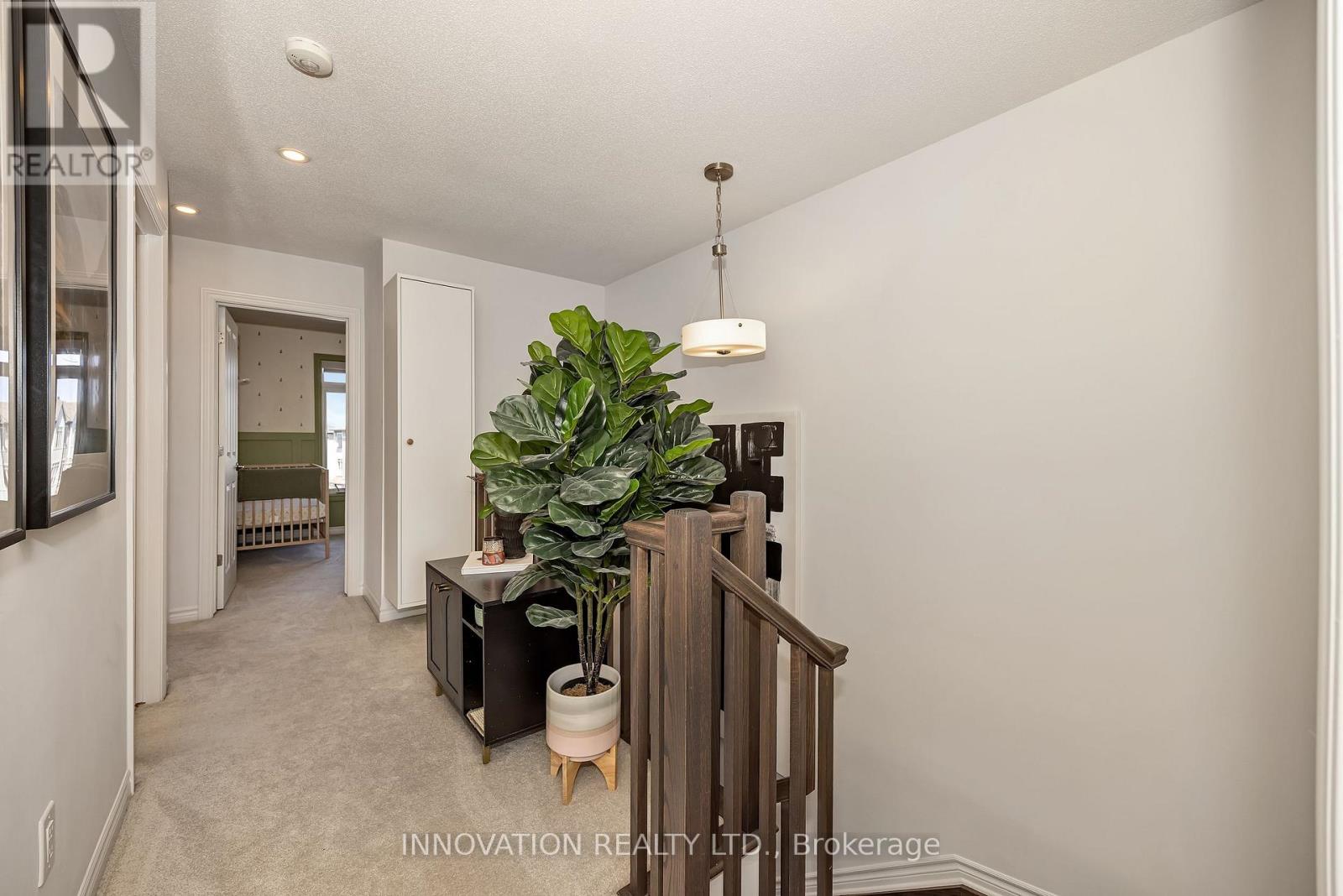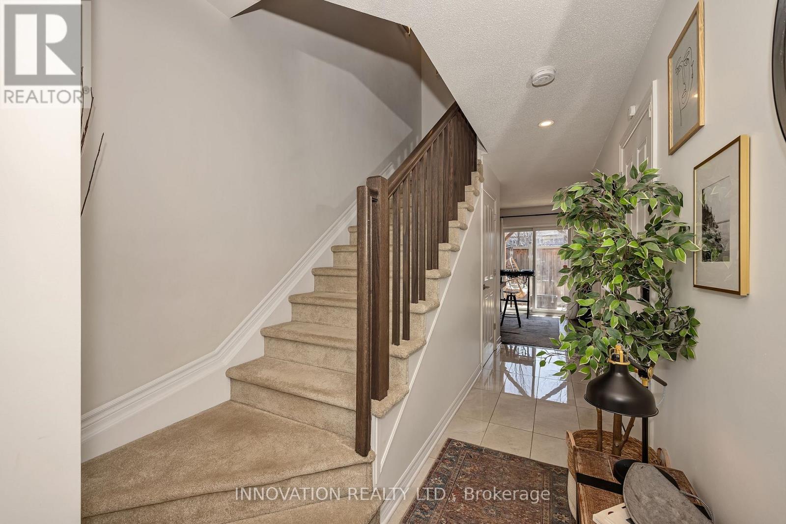 Welcome to this striking, design-forward three-storey townhome, built in 2019 and meticulously upgraded to impress. Offering 3 Bedrooms and 3 Bathrooms, this residence delivers a bold blend of modern style and refined comfort. The entry level sets the tone with a sleek tiled foyer leading into a versatile, sun-filled space-perfect as a home office or lounge. Rich hardwood floors elevate the room, which opens seamlessly to a private backyard retreat featuring a new '25 deck and elegant gazebo-your own urban escape. The 2nd level is nothing short of showstopping. A bright, open-concept layout showcases a chef-inspired Kitchen anchored by an sprawling Breakfast bar with seating for 6-8, quartz countertops, stainless steel appliances, made for entertaining in style. Hardwood floors run throughout, complemented by custom built-in dining cabinetry and a sophisticated electric fireplace that defines the living space. Step out onto the balcony and unwind with rare, unobstructed views of a mature, tree-lined ravine that is serene, private, and simply stunning. Upstairs, the 3rd level offers 3 generously sized Bedrooms, including a luxurious Primary Bedroom retreat complete with dual walk-in closets and a beautifully finished 3 pc ensuite Bath. Additional Bedrooms provide flexibility for family, guests, or a polished home office. The unfinished Basement offers a blank canvas - ideal for a media lounge or fitness studio. Ideally located close to schools, shopping, and everyday amenities, this home also features a private road with ample visitor parking plus bonus electric car charger in garage! A rare opportunity to own a turnkey, style-driven home in an exceptional setting-where modern living meets natural beauty. 24 hour irrevocable on all Offers (id:64974)