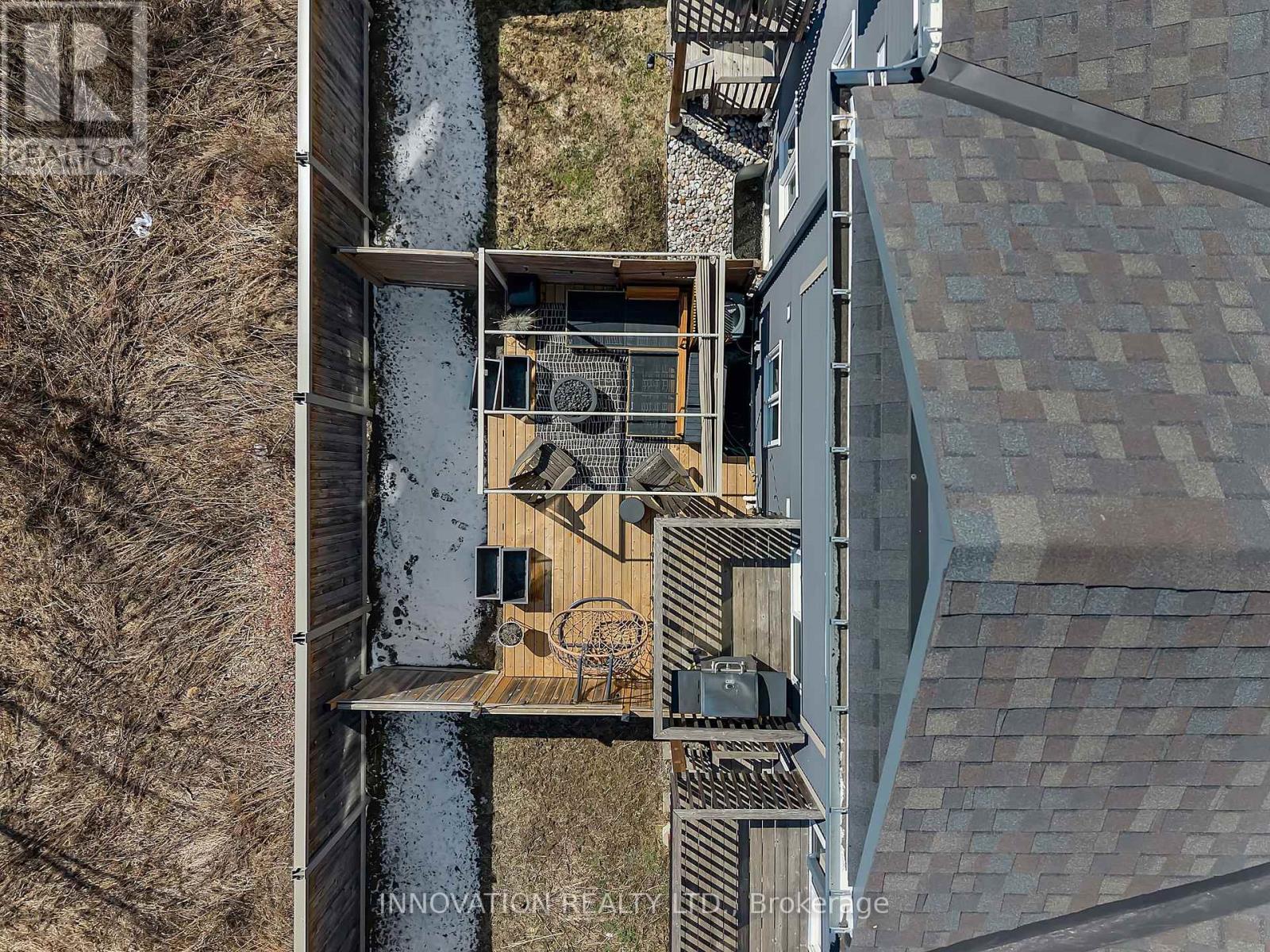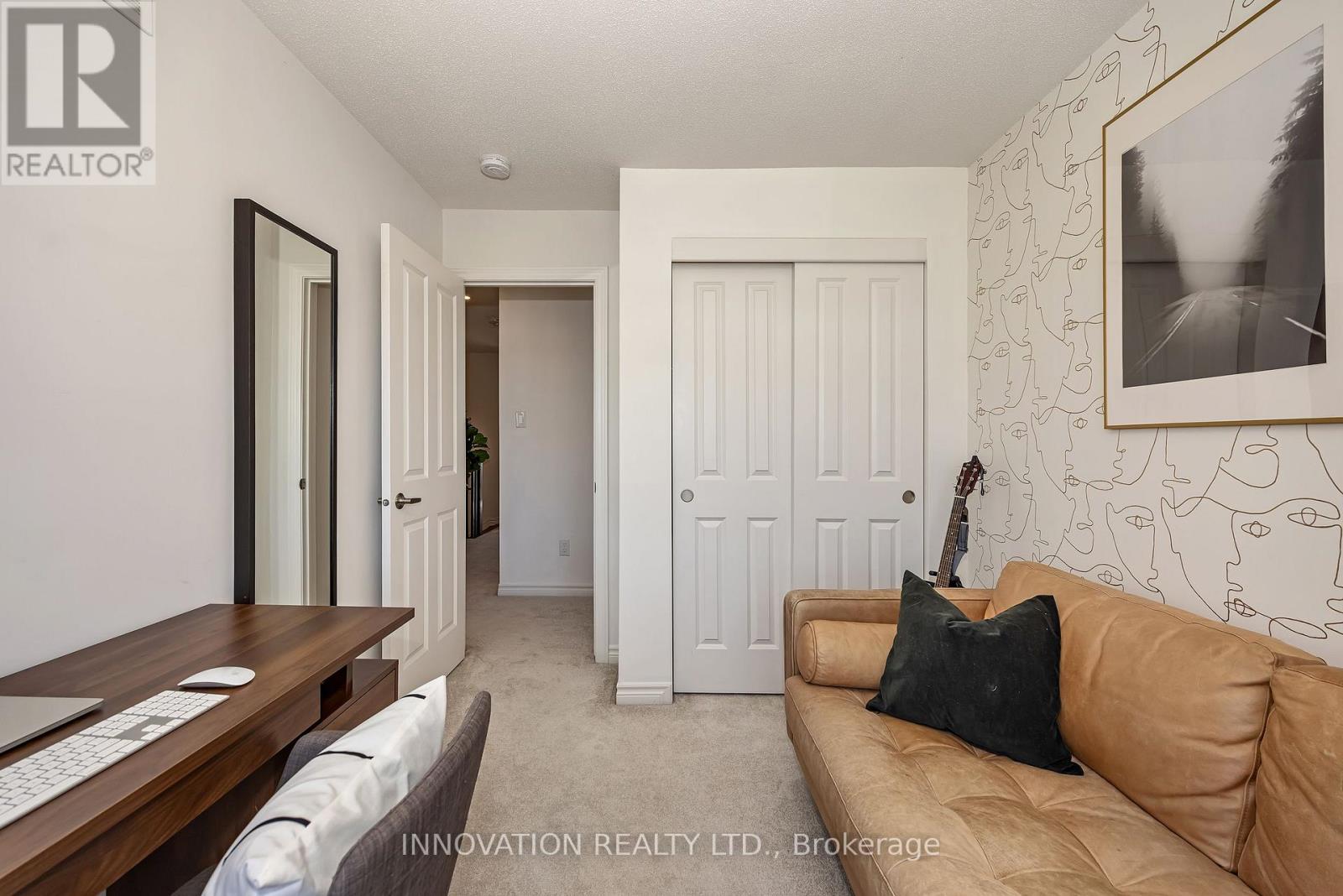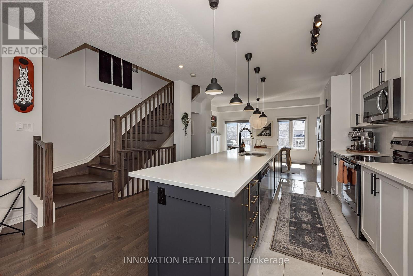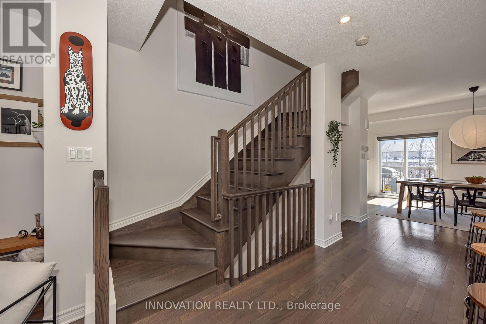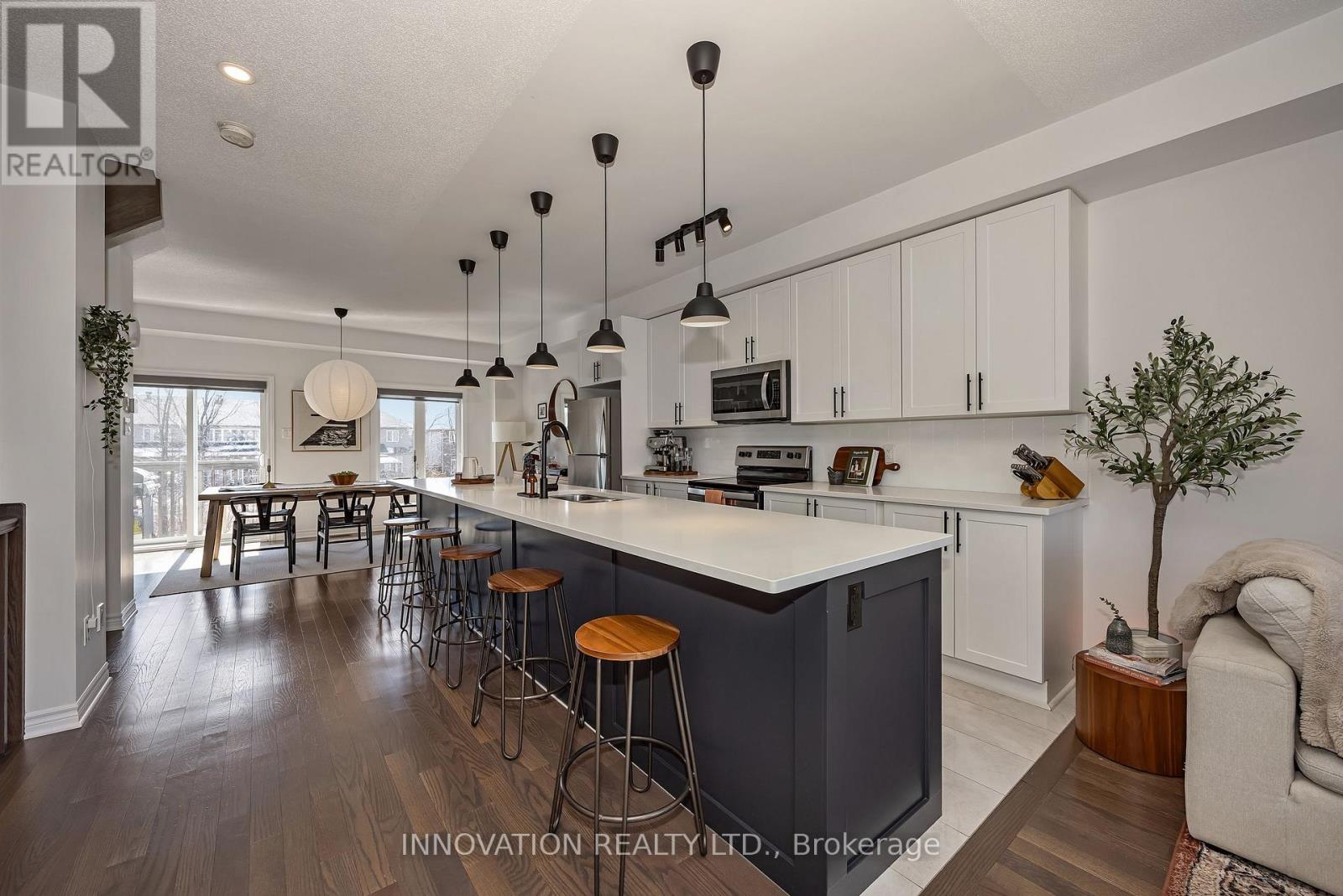 Welcome to this striking, design-forward three-storey townhome, built in 2019 and meticulously upgraded to impress. Offering 3 Bedrooms and 3 Bathrooms, this residence delivers a bold blend of modern style and refined comfort. The entry level sets the tone with a sleek tiled foyer leading into a versatile, sun-filled space-perfect as a home office or lounge. Rich hardwood floors elevate the room, which opens seamlessly to a private backyard retreat featuring a new '25 deck and elegant gazebo-your own urban escape. The 2nd level is nothing short of showstopping. A bright, open-concept layout showcases a chef-inspired Kitchen anchored by an sprawling Breakfast bar with seating for 6-8, quartz countertops, stainless steel appliances, made for entertaining in style. Hardwood floors run throughout, complemented by custom built-in dining cabinetry and a sophisticated electric fireplace that defines the living space. Step out onto the balcony and unwind with rare, unobstructed views of a mature, tree-lined ravine that is serene, private, and simply stunning. Upstairs, the 3rd level offers 3 generously sized Bedrooms, including a luxurious Primary Bedroom retreat complete with dual walk-in closets and a beautifully finished 3 pc ensuite Bath. Additional Bedrooms provide flexibility for family, guests, or a polished home office. The unfinished Basement offers a blank canvas - ideal for a media lounge or fitness studio. Ideally located close to schools, shopping, and everyday amenities, this home also features a private road with ample visitor parking plus bonus electric car charger in garage! A rare opportunity to own a turnkey, style-driven home in an exceptional setting-where modern living meets natural beauty. 24 hour irrevocable on all Offers (id:64974)