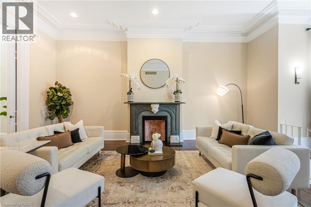 Own a piece of the city’s history in this stunning 1,700 sq. ft. condo, part of a beautifully maintained 1870s building with only 4 exclusive units. This main-floor suite is the only one with a private entrance and direct access to parking. Soaring 11-ft ceilings, tall windows, and walnut hardwood floors highlight the spacious living and dining rooms, complete with custom built-ins and fireplace. The gourmet kitchen boasts high-end cabinetry, granite counters, and stainless steel appliances. Both bedrooms feature updated ensuite baths, plus there’s in-suite laundry, ample storage, and two parking spaces. Nestled in a quiet downtown neighbourhood, steps to St. Joseph’s, Durand Park, GO Station, trails, and James St. S. shops and cafés. Modern updates meet timeless charm—an opportunity rarely offered. (id:64974)