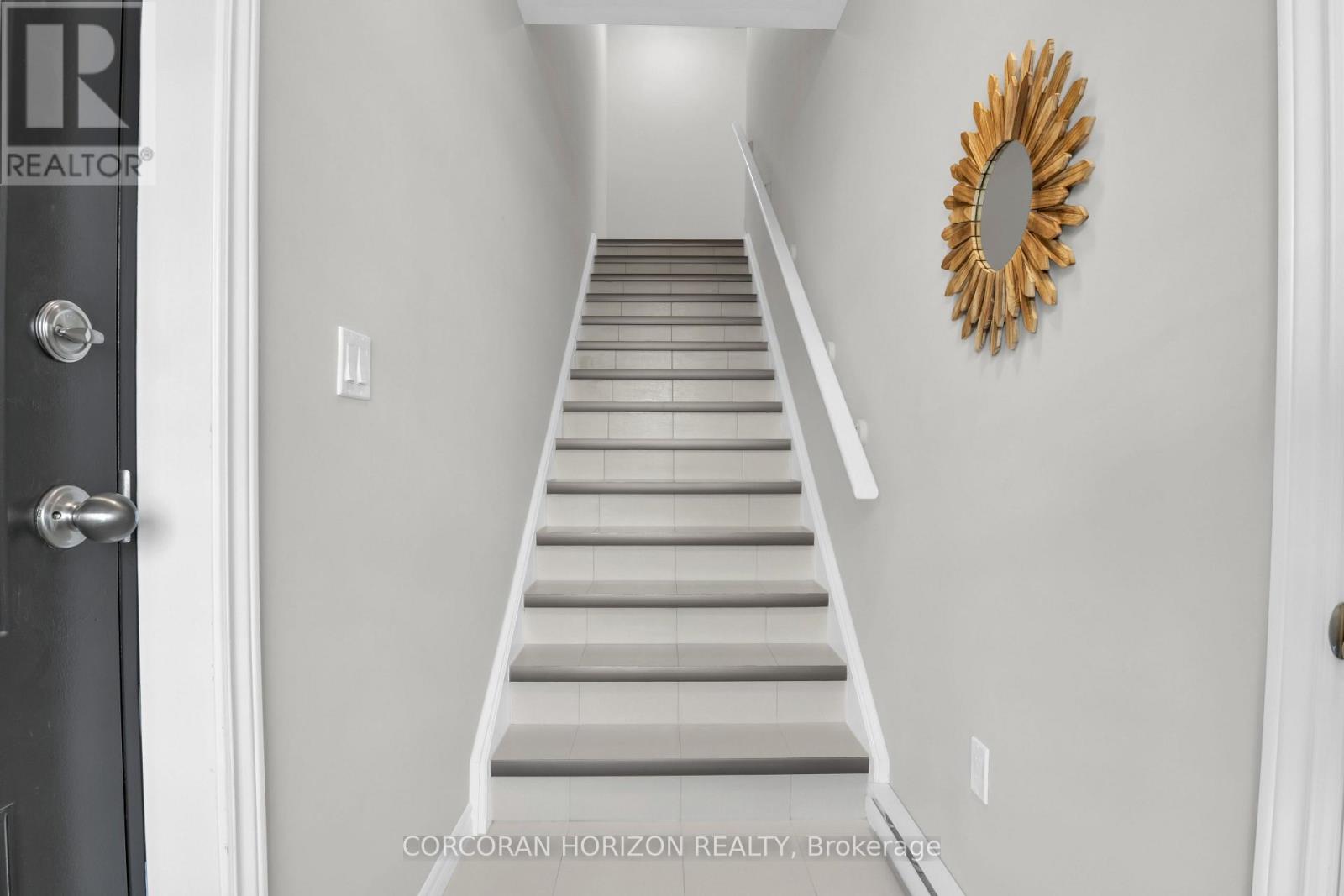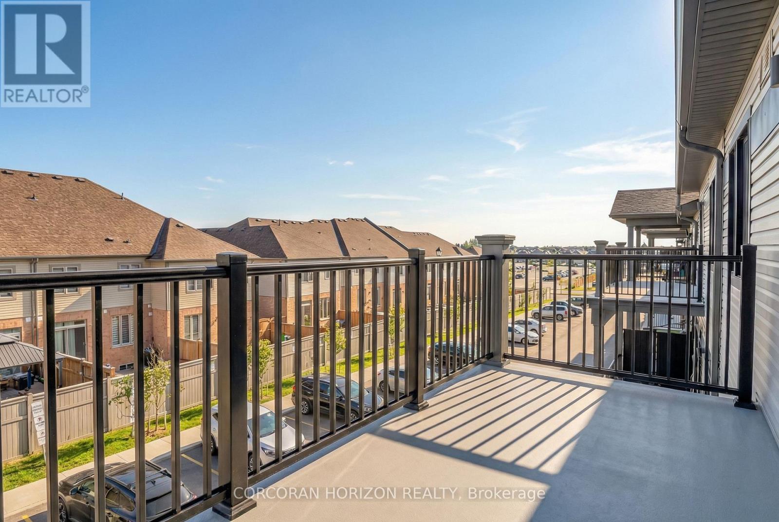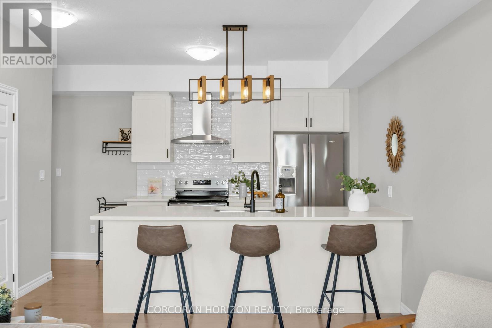 Welcome to 46 Oat Lane, a beautifully maintained two storey stacked townhouse in Kitchener's sought after Huron Park community. This 2 bedroom, 2.5 bathroom home has been thoughtfully cared for and shows in pristine condition, offering a warm and inviting space you will feel proud to call your own. The main living level features 9 ft ceilings, hardwood flooring, and large windows that fill the open concept layout with natural light. The kitchen, dining and living areas flow seamlessly together, creating a comfortable setting for both quiet evenings at home and time spent with family and friends. The kitchen is finished with upgraded stainless steel appliances, quartz countertops, and a peninsula with a built in sink and bar seating, making it as functional as it is welcoming. Sliding glass doors off the dining area lead to a private balcony, perfect for relaxing outdoors. A convenient powder room completes this level. Upstairs, two well sized bedrooms provide privacy and comfort. The primary bedroom includes a walk in closet, an upgraded ensuite, and its own private balcony, an ideal spot to start your day with a morning coffee. A four piece bathroom serves the second bedroom, and upper level laundry adds everyday ease. Surrounded by parks, trails, schools, shopping and cafes, this home offers low maintenance living in a friendly, well established neighbourhood that continues to grow in popularity. (id:64974)