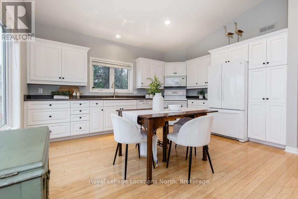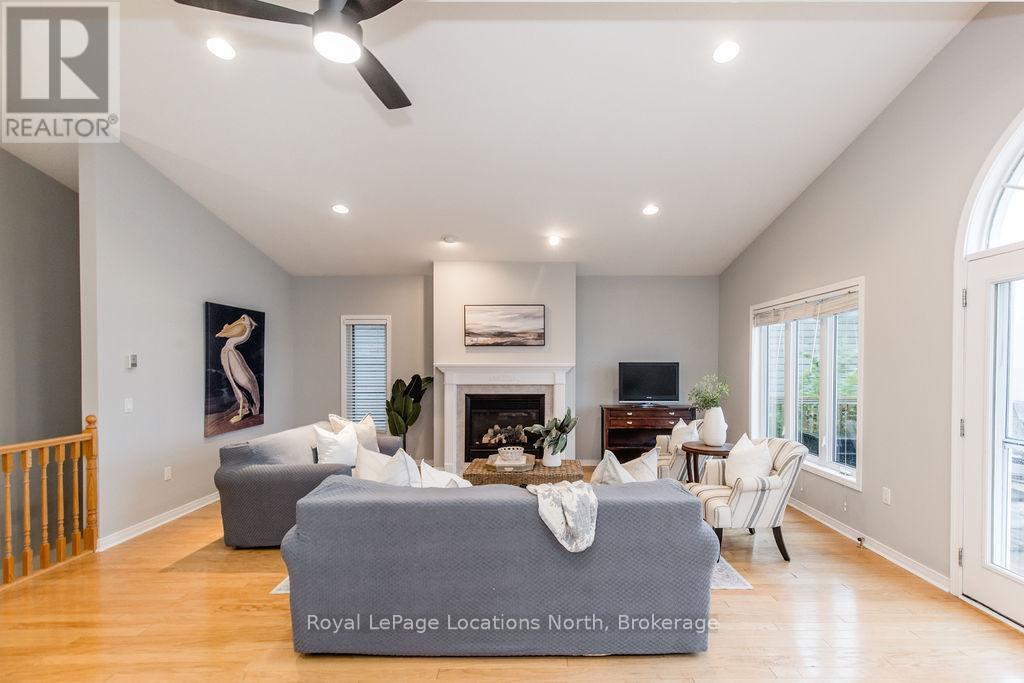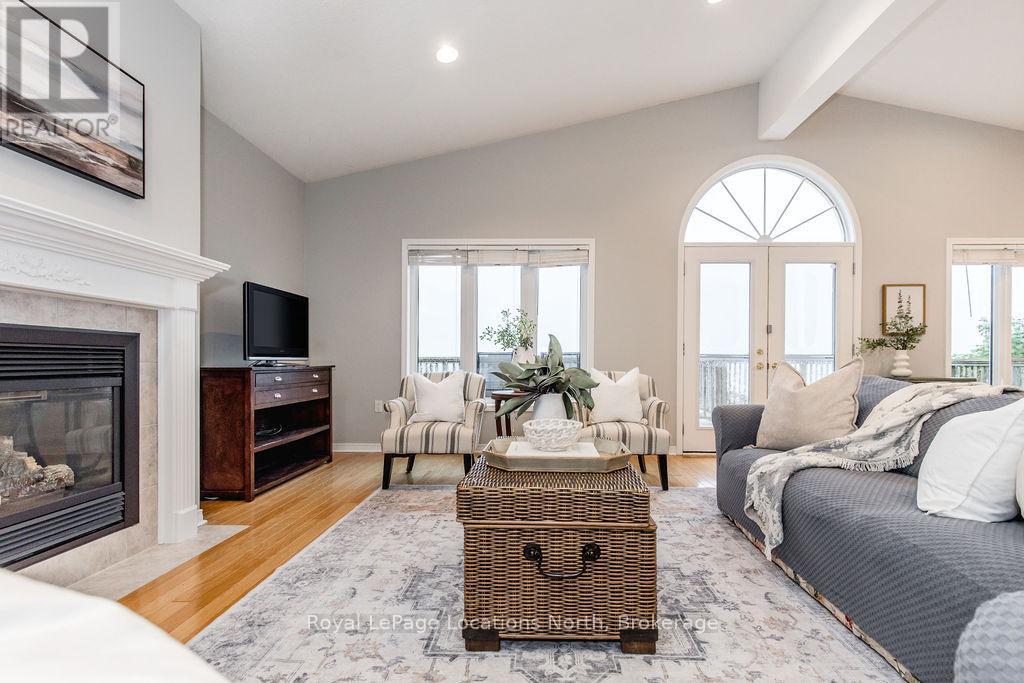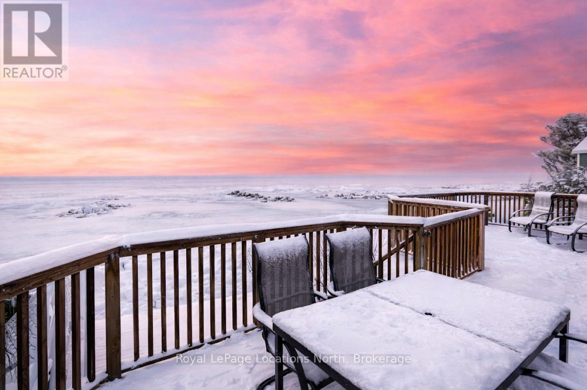 Welcome to a true Georgian Bay waterfront retreat, where unobstructed water views deliver unforgettable sunrises, sunsets, and year-round scenery. Built in 2002, this 4-bedroom, 3-bathroom bungalow was intentionally designed to maximize panoramic bay and Blue Mountain views from the main living areas. Perfectly positioned between Collingwood and Wasaga Beach, the location offers peaceful waterfront living with quick access to skiing, trails, dining, shopping, and four-season recreation.The covered front porch sets the tone - ideal for morning coffee or watching summer storms roll across the bay. Inside, the open-concept main floor is filled with natural light, vaulted ceilings, and a cozy gas fireplace anchoring the living space. The spacious kitchen offers generous counter space and storage, making it ideal for entertaining family and guests while enjoying water views.The main-floor primary suite provides a private retreat with a 4-piece ensuite, including a soaking tub, glass shower, and walk-in closet. The lower level features two additional bedrooms and a large rec room, creating flexibility for family living, guests, or cottage use.Outdoors, enjoy tiered decks, mature landscaping, and direct private waterfront access-perfect for swimming, kayaking, paddle boarding, or relaxing by the water. Whether used as a full-time residence or waterfront cottage, this home captures the essence of the Georgian Bay lifestyle: tranquil, active, and deeply connected to nature, with winter skiing and summer water sports at your doorstep. (id:64974)