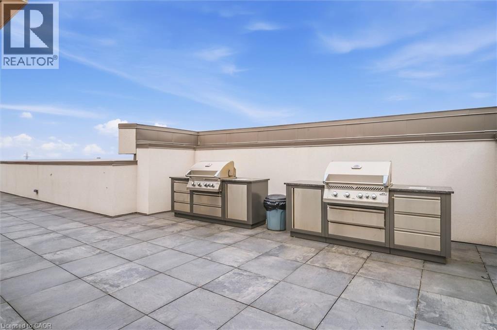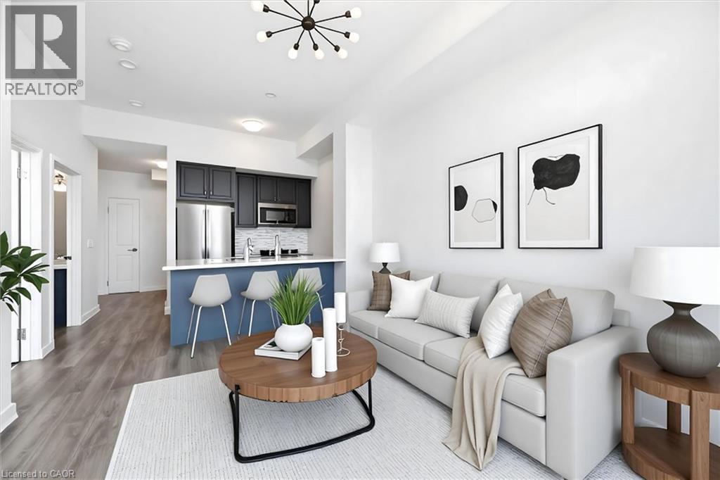 Experience elevated living in this stunning penthouse retreat perched on the top floor, offering 638 square feet of thoughtfully designed space. This 1 bedroom plus den residence impresses with soaring 10-ft ceilings and an abundance of natural light streaming through floor-to-ceiling windows. Step out to your private balcony and take in sweeping southwest panoramic views over the east end of Waterdown-the perfect backdrop for morning coffee or evening sunsets. The suite is loaded with quality upgrades, including custom navy cabinetry, gleaming white quartz countertops with an extended breakfast bar, upscale stainless steel appliances, a timeless subway tile backsplash, and top-of-the-line vinyl flooring that blends durability with contemporary style. Residents enjoy exceptional building amenities, including a rooftop terrace with BBQ, stylish party room, fully equipped gym, and convenient bicycle storage locker. Geothermal heating/cooling ensures energy efficiency and low utility costs year-round. Complete with 1 underground parking space and 1 storage locker, this residence offers comfort, convenience, and sophistication. This is more than a home-it's a lifestyle at the top, where modern design, smart efficiency, and breathtaking views come together seamlessly. (id:64974)
