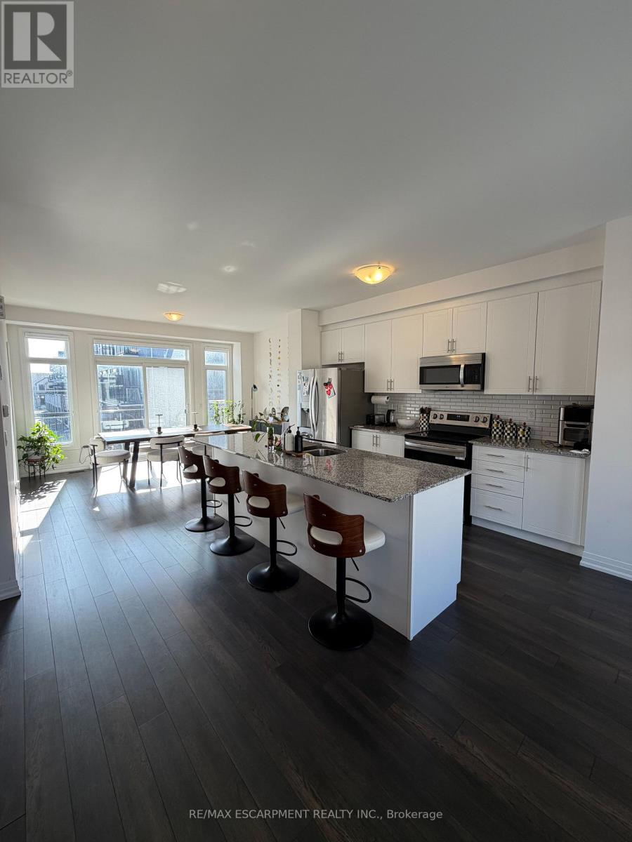 Welcome to a under 1 year new home in the highly desirable town of Mount Hope, Hamilton! This stunning three-story townhouse offers the epitome of modern living, boasting approximately 1900 sqft of meticulously designed space. Step inside to discover a haven of luxury and comfort. The main level greets you with an inviting ambiance, featuring sleek hardwood flooring, setting the tone for elegance throughout. Entertain with ease in the upgraded kitchen, where premium finishes abound. Revel in the beauty of granit countertops, complemented by MDF cabinets, a stylish faucet, and a spacious sink-perfect for culinary enthusiasts and gatherings alike. Enjoy seamless indoor-outdoor living with a beautiful balcony accessible from the living, kitchen, and dining areas. Whether you're savoring morning coffee or hosting soirées under the stars, this space offers a serene retreat for relaxation and connection. Convenience meets luxury with a two-car garage, providing ample parking and storage options. Plus, the proximity to Hamilton Airport ensures easy access to travel, making commuting a breeze for jet setters and commuters alike. Don't miss the opportunity to make this brand-new townhouse your own-a place where sophistication meets comfort, and every detail is crafted with care. (id:64974)