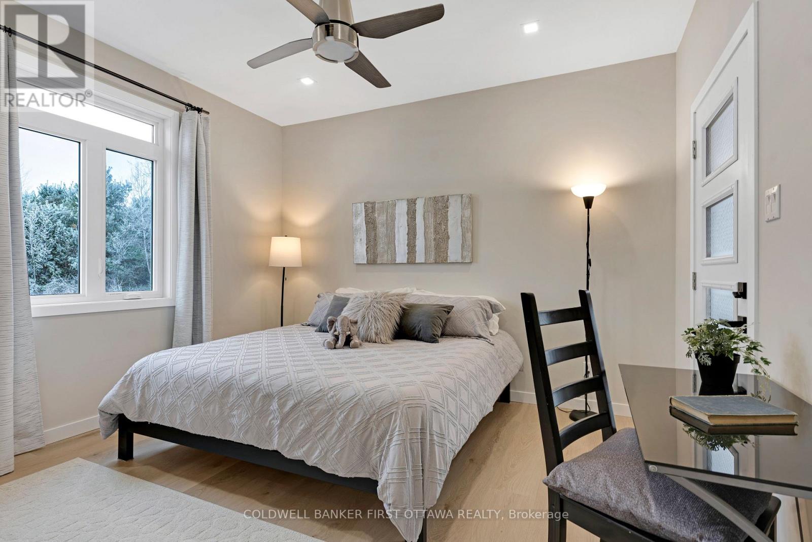 Outstanding. With smooth clean lines this 2022 home offers a sophisticated presence and, its unparalleled construction creates a wealth of efficiencies. The exterior steel siding is eye catching with its attractive slate-hued finish, accented by earthy warm cedar. The design elements blend flawlessly into 3 peaceful country acres. Step inside to the sleek foyer featuring white bright décor enhanced by double closet's charcoal glass panels; elegance added by the porcelain floor and glass chandelier. Flooring thru-out 3+1 bed, 2 full bath home is porcelain tile plus, luxury vinyl plank with cork cushioning for sound absorption - you will appreciate this with every step. Ceilings 9' high, light cascades inside thru big windows and living spaces insulated for sound separation from the bedrooms. Livingroom linear propane fireplace is surrounded by showcase porcelain wall. Impeccable gourmet kitchen most welcoming with Cambria quartz countertops, custom Deslaurier cabinetry, generous breakfast bar and premium Bosch appliances including two built-in ovens. Adjoining butler's pantry and sitting area. Primary suite calming retreat with two large closets and luxurious 5-pc ensuite porcelain floor, two-sink quartz vanity, rainhead glass shower with body-spray tower and deluxe soaker tub. Two more bedrooms and well-appointed 4-pc bathroom also with porcelain floor, quartz vanity, touchscreen mirror and rainhead shower with body-spray. Lower level 8' ceilings, R22 insulation and potential for in-law suite with rough-ins for kitchen and bathroom. From lower level, direct access to double attached garage with hookup for overhead propane heater. Adding to home's ultra-modern design and commitment to quality is superior steel roof with protective membrane & R60 insulation. Steel fascia has recessed soffit lighting. High energy-efficient Kohltech windows & propane furnace. Underground hydro line from road to home. On paved township road. Cell service & hi-speed. 10 mins Perth. (id:64974)