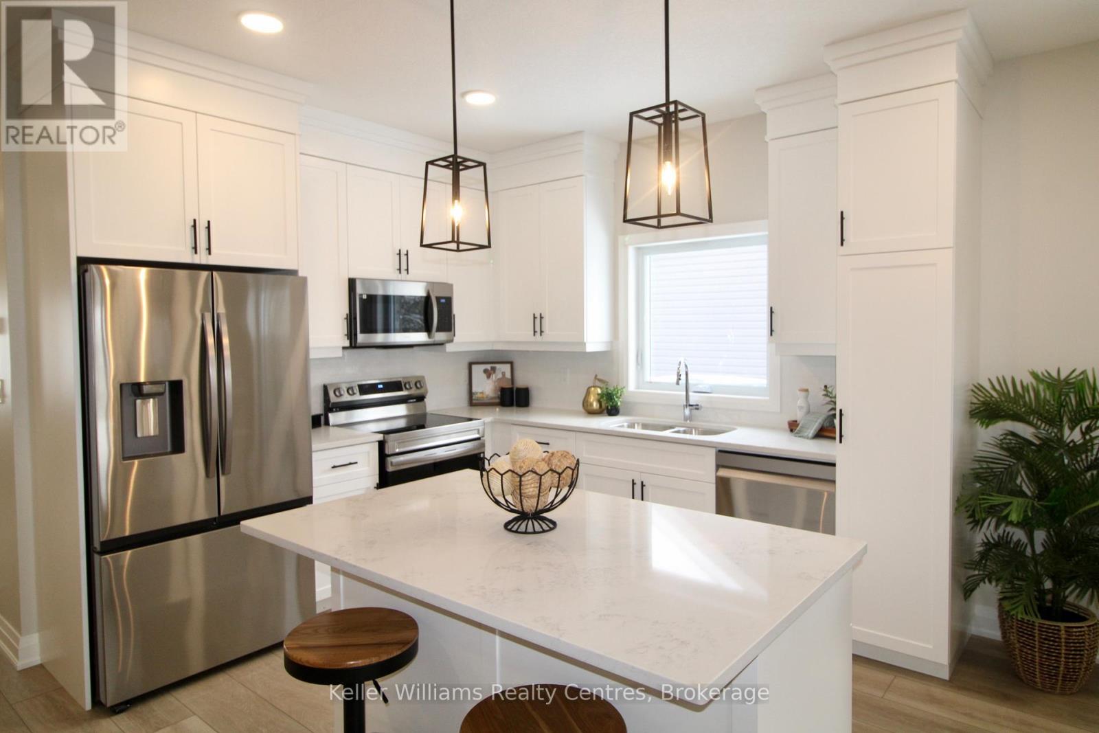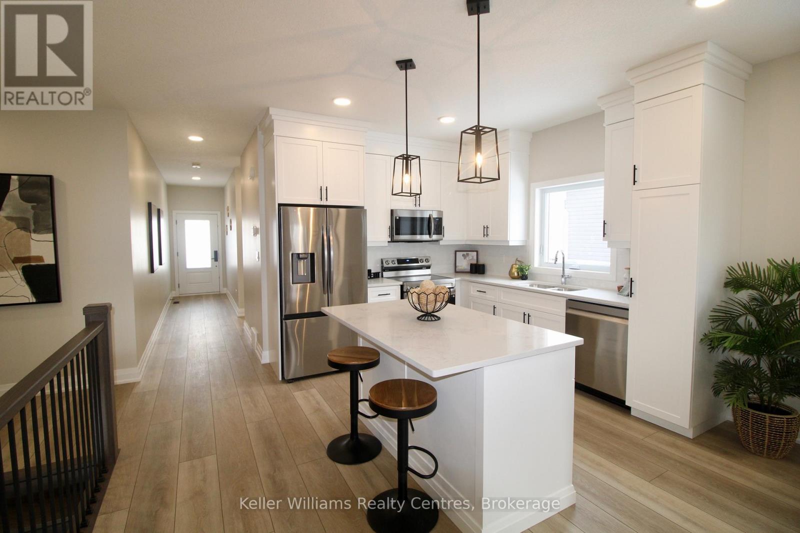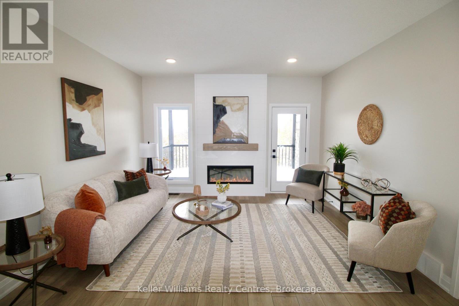 Brand new semi-detached bungalow with walkout basement by Candue Homes! Backing onto mature trees this home is thoughtfully designed, blending modern finishes with a peaceful natural setting. The bright, open living room features a stylish shiplap fireplace and a walkout to the covered back deck, creating a seamless indoor-outdoor connection with tranquil treed views. The kitchen is finished with quartz countertops, a tile backsplash, and all appliances included.The primary bedroom has a walk-in closet with custom organizers and a beautifully finished ensuite bathroom featuring double sinks and a custom tiled shower. Practical touches include main-level laundry and an attached garage. The lower level expands your living space with a spacious recreation room and walkout to the backyard with a concrete patio. On this level you'll also find a 3rd bedroom & bathroom, plus ample storage, making it a great space for hosting guests. Outside, the builder includes a paved drive, fully sodded lot, and a fence along the east side of the back yard for added privacy. Cedar trees will be planted along the inside of the retaining wall at the back. (id:64974)