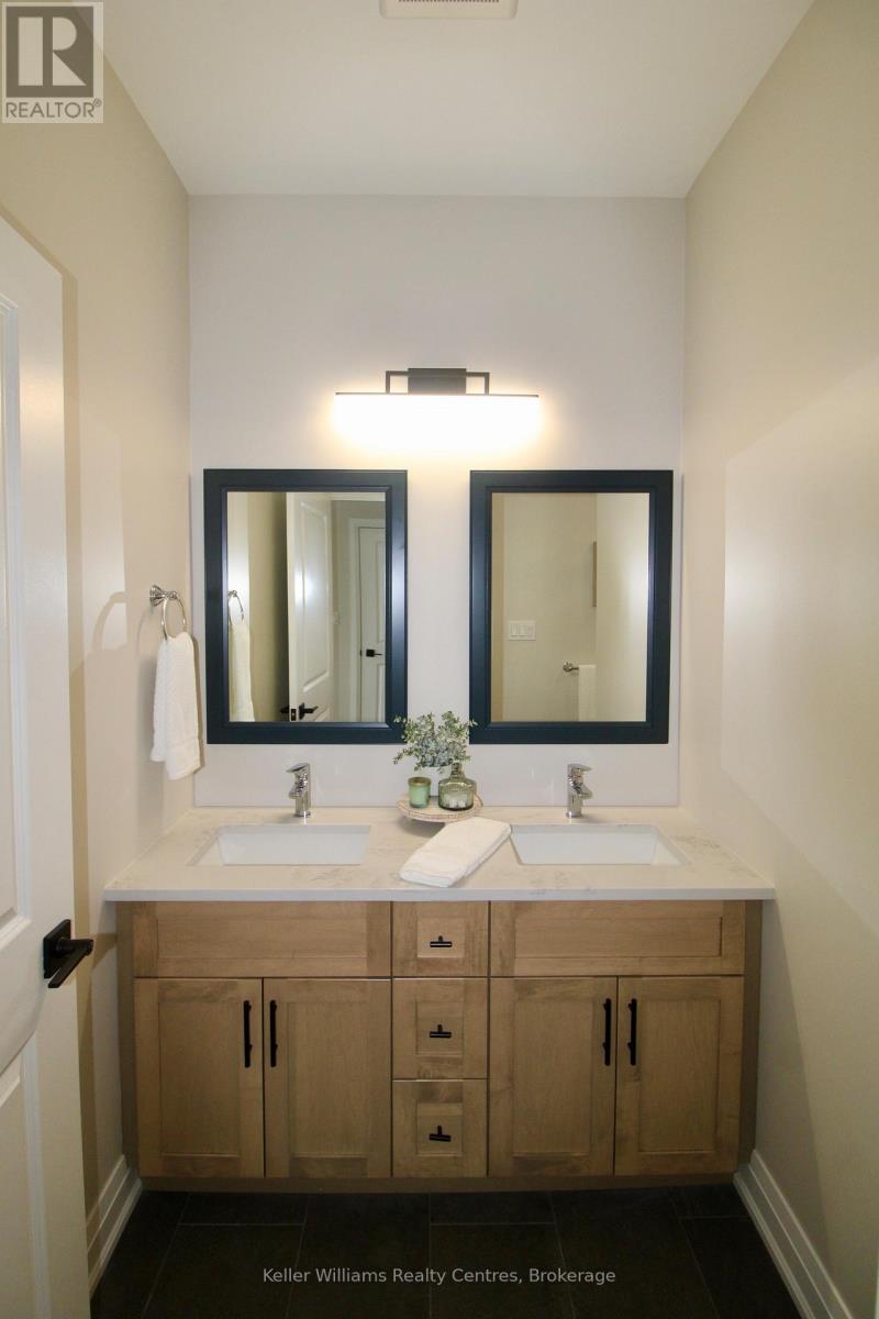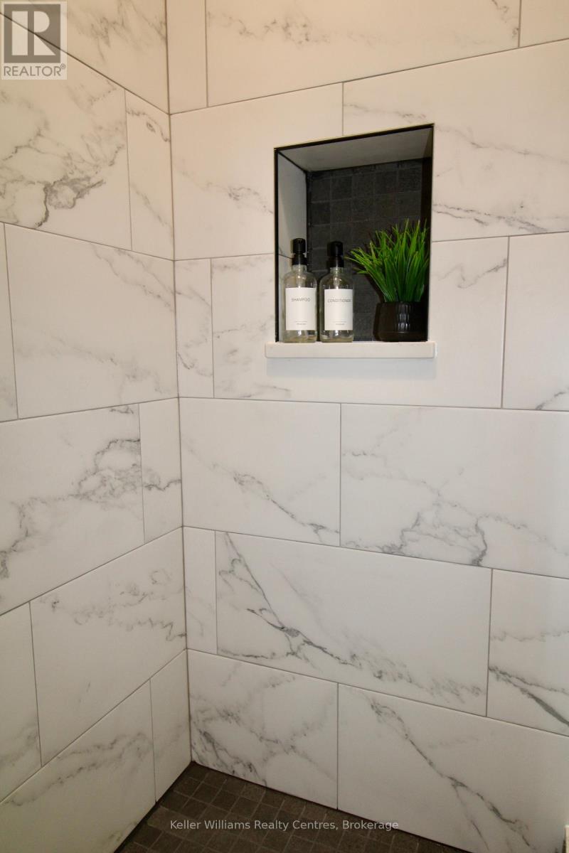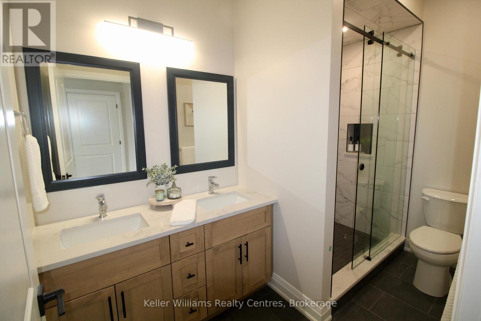 Brand new semi-detached bungalow with walkout basement by Candue Homes! Backing onto mature trees this home is thoughtfully designed, blending modern finishes with a peaceful natural setting. The bright, open living room features a stylish shiplap fireplace and a walkout to the covered back deck, creating a seamless indoor-outdoor connection with tranquil treed views. The kitchen is finished with quartz countertops, a tile backsplash, and all appliances included.The primary bedroom has a walk-in closet with custom organizers and a beautifully finished ensuite bathroom featuring double sinks and a custom tiled shower. Practical touches include main-level laundry and an attached garage. The lower level expands your living space with a spacious recreation room and walkout to the backyard with a concrete patio. On this level you'll also find a 3rd bedroom & bathroom, plus ample storage, making it a great space for hosting guests. Outside, the builder includes a paved drive, fully sodded lot, and a fence along the east side of the back yard for added privacy. Cedar trees will be planted along the inside of the retaining wall at the back. (id:64974)
