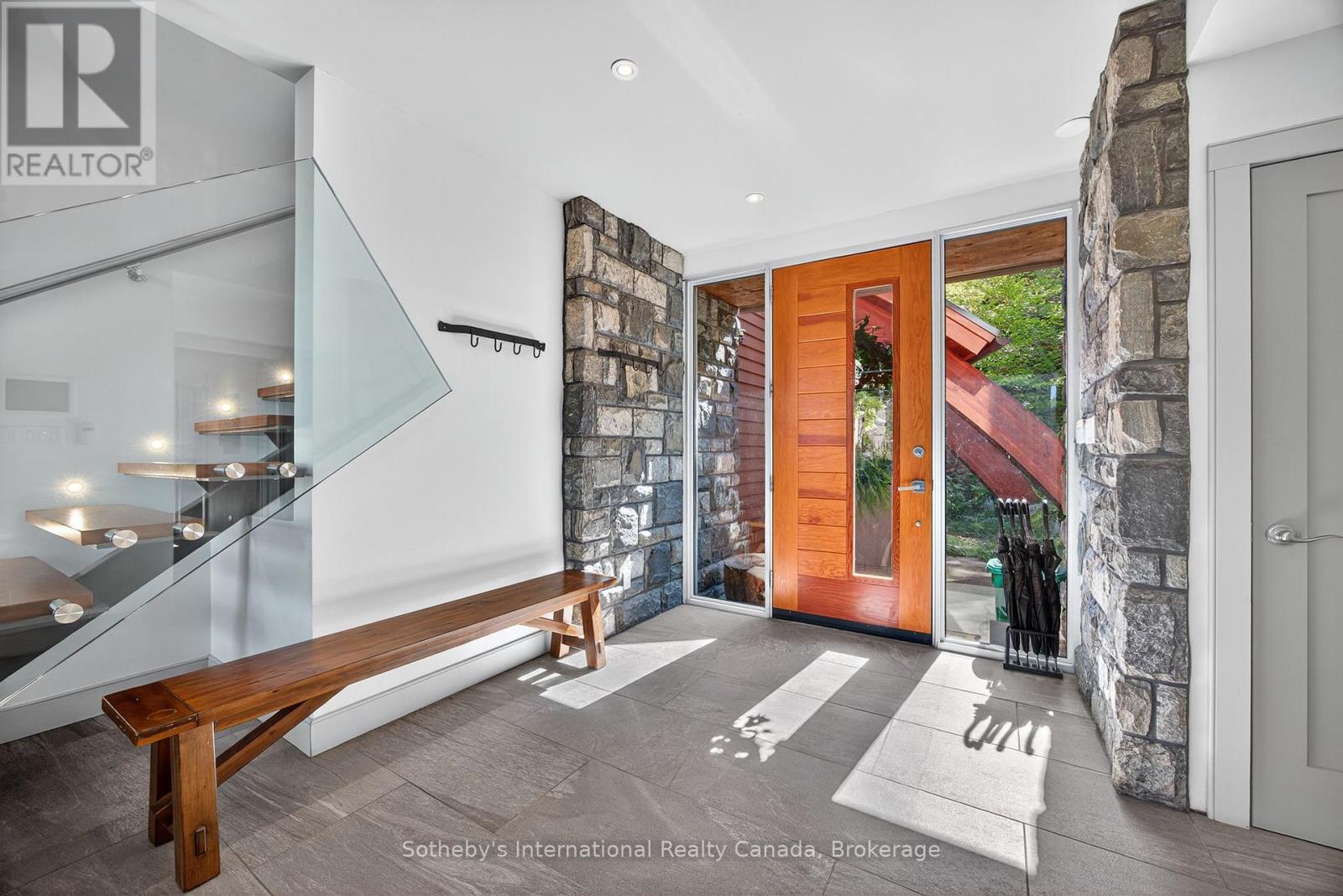 Welcome to "Serenity," an architect-designed, turn-key, four-season retreat on the crystal waters of Otter Lake. This extraordinary property rests on an 11.93-acre point with 1,771 ft of natural shoreline, offering unmatched privacy, breathtaking views, & a deep connection to Muskoka's rugged beauty, all just 10 mins from Huntsville's amenities. Approach via a winding granite lane that opens to the entrance courtyard, where the home's sweeping rooflines, hand-cut granite, & walls of glass reveal glimpses of the lake & Serenity Bay. Inside, the soaring 25-ft great room makes a dramatic impression with floor-to-ceiling windows, a granite Rumford fireplace, & a wall of glass that opens to the lakeside terrace. The open-concept chef's kitchen, dining room, & great room are designed for effortless entertaining. The kitchen showcases a 12-ft Brazilian granite island, gas cooktop, & stainless steel appliances. Host unforgettable dinners surrounded by nature, with sliding doors that extend the living space to a covered terrace, perfect for lakeside dining, sunrise coffee, or fireside evenings under the stars. A separate family room provides a cozy retreat, ideal for games, TV, or curling up with a book, with sliding doors that invite the outdoors in year-round. The primary wing is a private sanctuary featuring a Scandinavian wood stove, walk-through closet, motorized blinds, & a spa-like ensuite with pebble wall & rain shower. Two additional lake-view bedrooms & a stylish 4-pc bath complete the west wing. Upstairs, a loft offers a fourth bedroom with an ensuite, overlooks the great room with sweeping lake views, & includes space for ping-pong or yoga. A cedar path leads to the shoreline, offering multiple seating areas, a steel fire pit set on the rock, a dock for swimming, diving, or tranquil paddles. Hear the call of the loon as it drifts across mirror-like waters, capturing the essence of a true Muskoka escape on this motor-free lake. (id:64974)