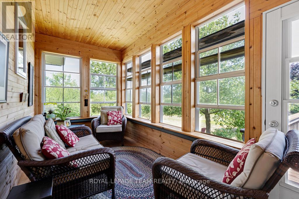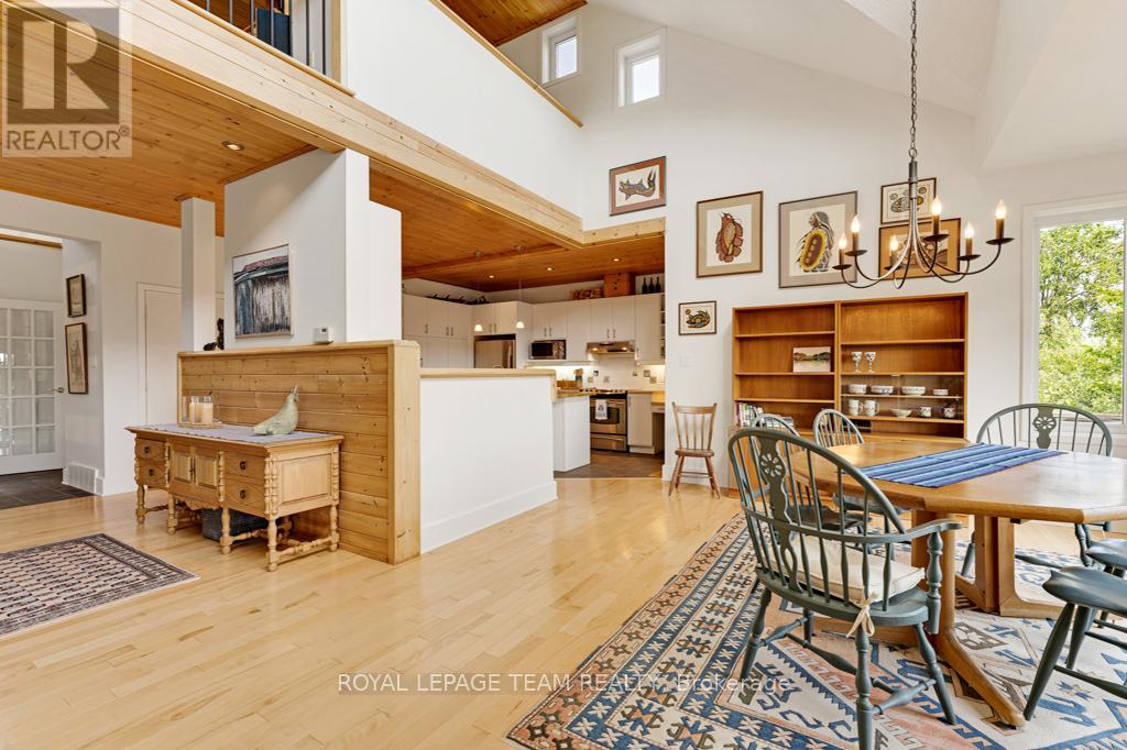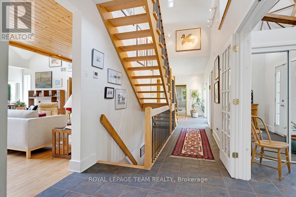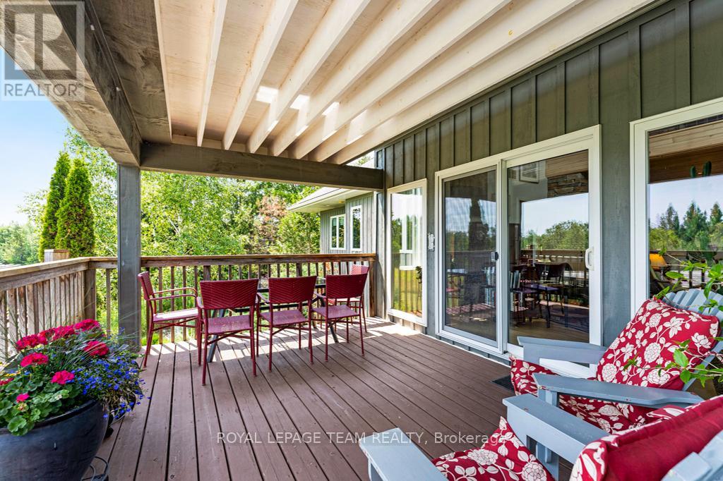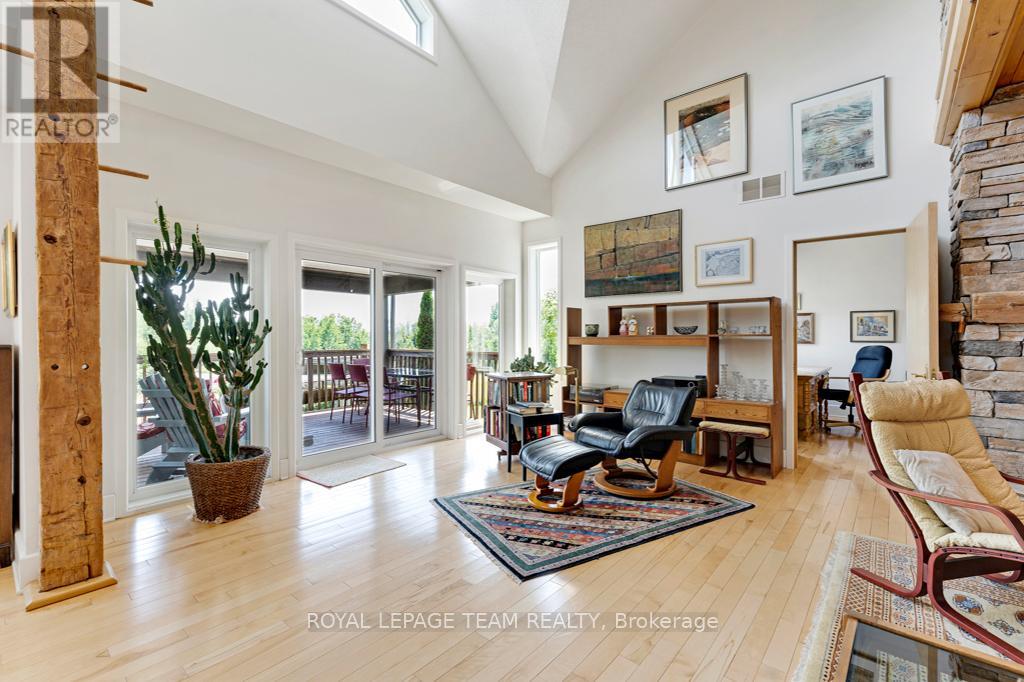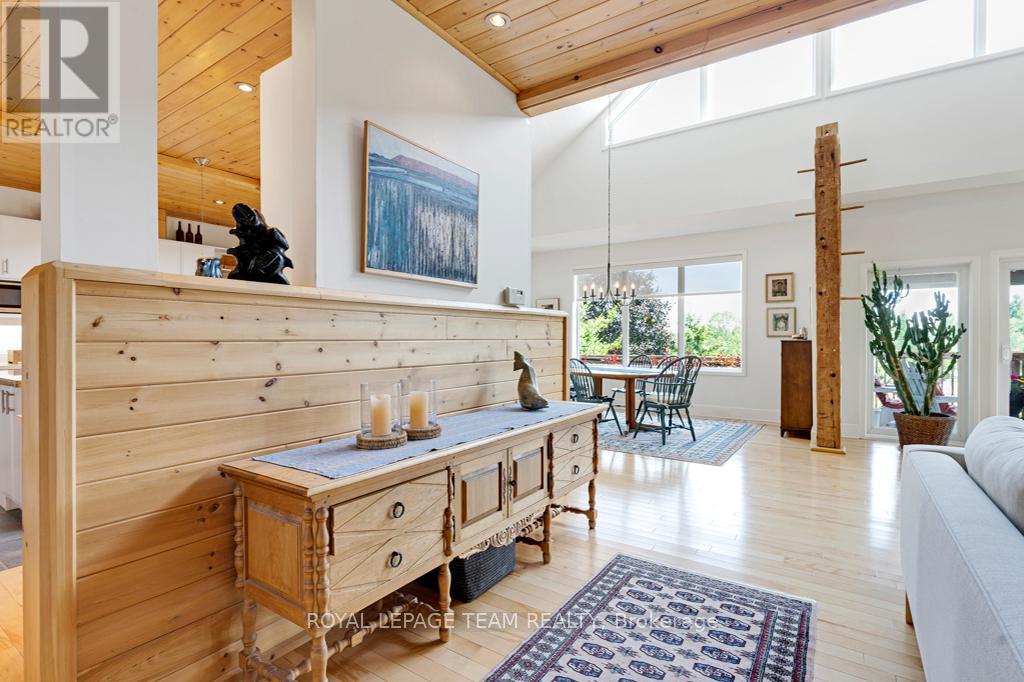 Your Private Riverside Retreat - A Four-Season Waterfront Sanctuary - Welcome to this exceptional architect-designed home offering total privacy and approximately 950 ft of waterfront along the UNESCO Rideau Canal. Set on 12+ peaceful acres just minutes from Merrickville and only 40 minutes to Ottawa, this private riverside retreat blends luxury, functionality, and year-round enjoyment in a truly unforgettable setting. Soaring ceilings, sun-filled spaces, and a dramatic two-story stone fireplace anchor the open-concept living area, creating a warm yet impressive focal point. The gleaming white kitchen is both elegant and practical-perfect for entertaining or everyday living with views of the surrounding landscape. The main level features spacious principal and guest bedrooms, each with its own ensuite, plus a bright loft overlooking the river and rolling fields beyond. The finished walkout lower level is designed for comfort and recreation, complete with heated floors, a wood stove, a large rec area, an additional bedroom, a powder room, sauna, and a convenient shower room just steps from the saltwater pool-ideal after a swim, skate, or day on the trails.curated perennial gardens, blooming apple trees, and vibrant seasonal colour surround the home. Relax on the dock, fish the Rideau, kayak at sunrise, or enjoy winter skiing and skating before warming up in the sauna. True four-season living in a peaceful natural setting. Additional highlights include copper plumbing, a wide poured concrete foundation, exceptional insulation, architectural plans, extra-wide halls for accessibility, a 3-season sunroom, a detached drive-through garage, custom copper eavestroughs, roughed-in central vac, an emergency generator, ample storage, and plugs for holiday lighting. A rare opportunity embracing your dream lifestyle-this private riverside retreat offers tranquility in nature just minutes from Merrickville, close to Hwy 416, and in easy reach of Ottawa. (id:64974)
