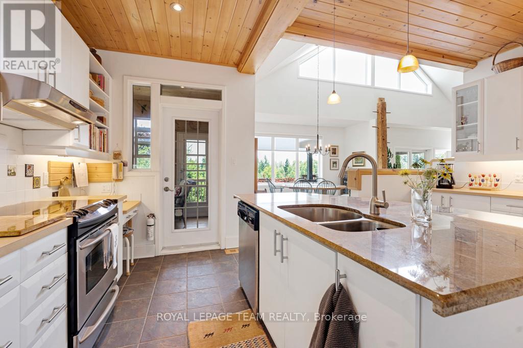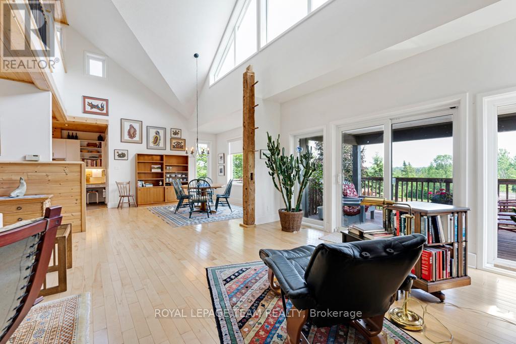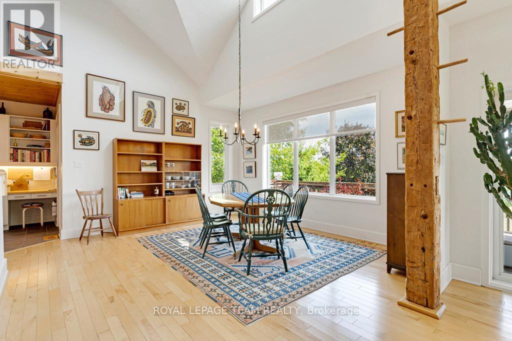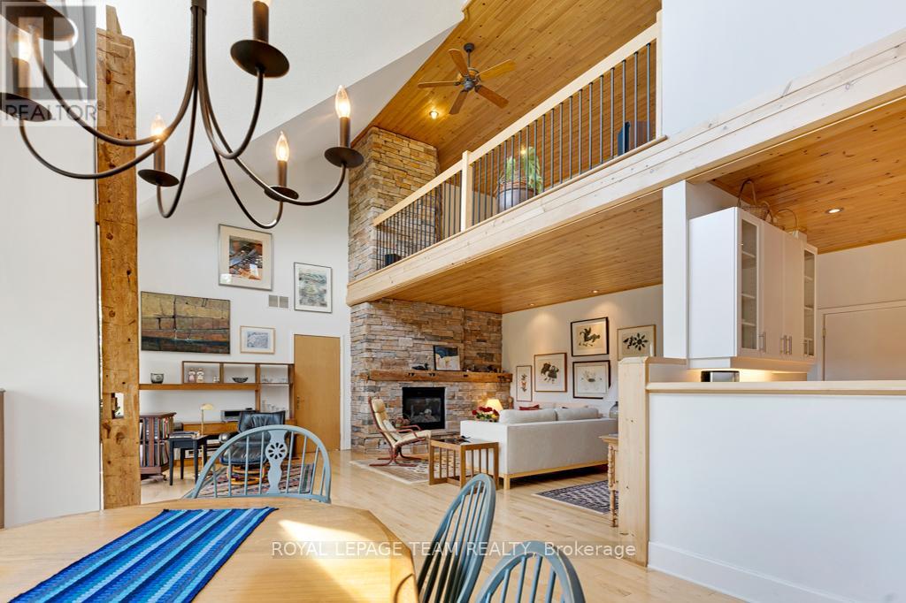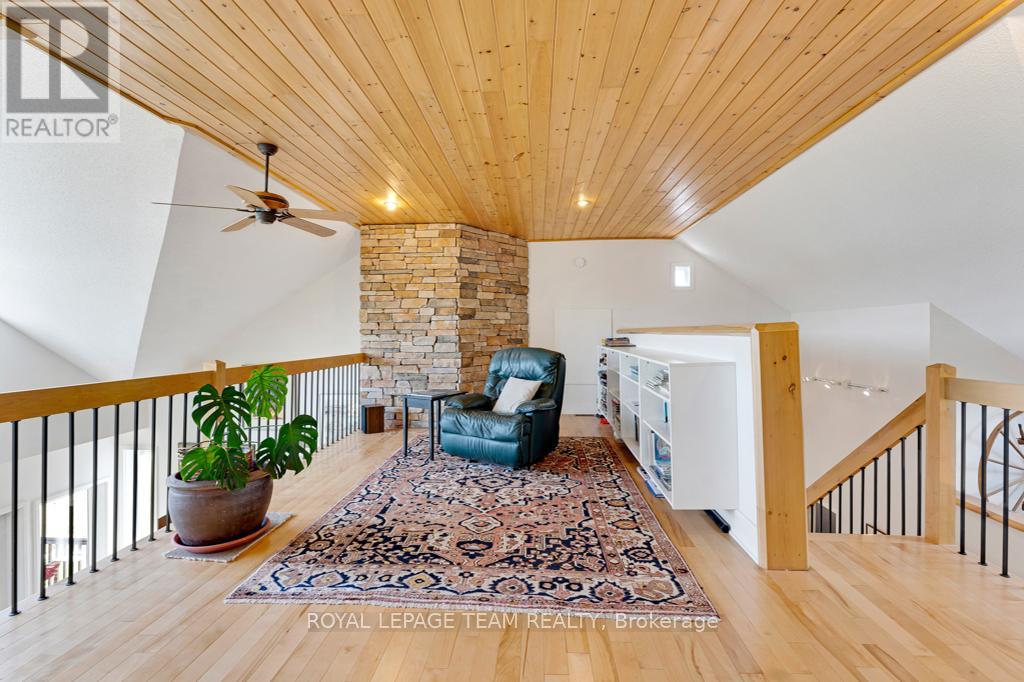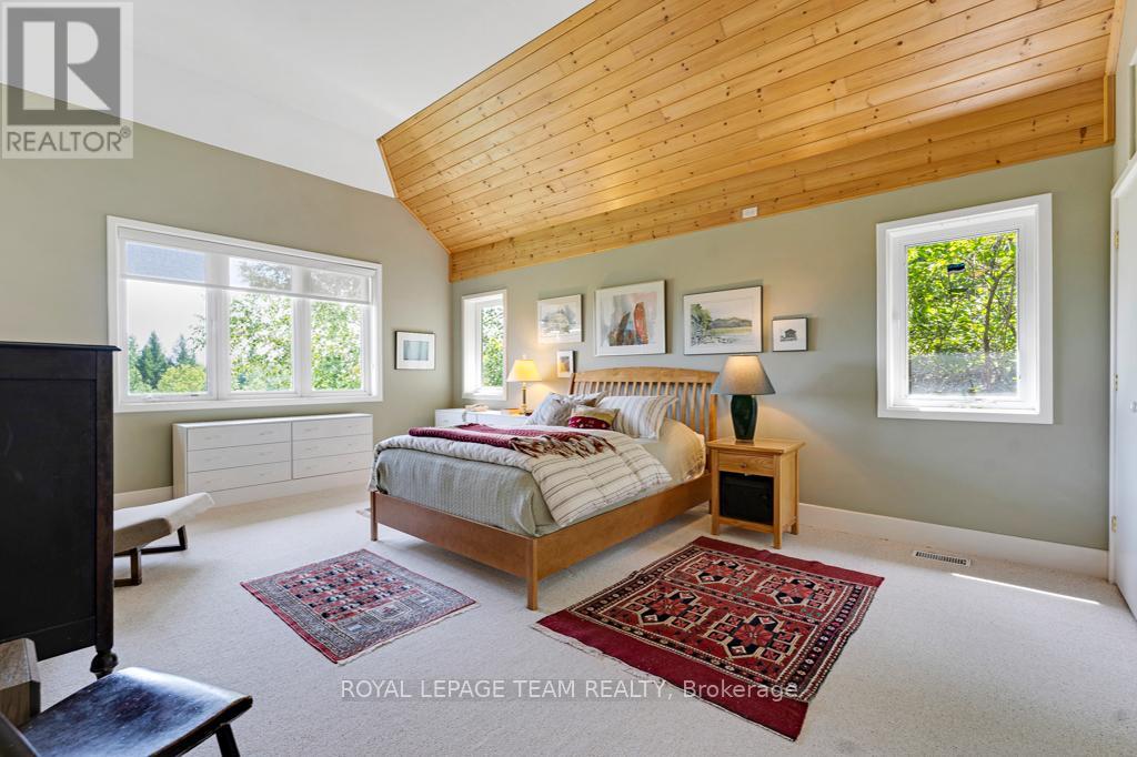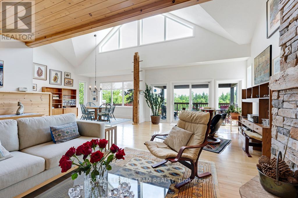 Your Private Riverside Retreat - A Four-Season Waterfront Sanctuary - Welcome to this exceptional architect-designed home offering total privacy and approximately 950 ft of waterfront along the UNESCO Rideau Canal. Set on 12+ peaceful acres just minutes from Merrickville and only 40 minutes to Ottawa, this private riverside retreat blends luxury, functionality, and year-round enjoyment in a truly unforgettable setting. Soaring ceilings, sun-filled spaces, and a dramatic two-story stone fireplace anchor the open-concept living area, creating a warm yet impressive focal point. The gleaming white kitchen is both elegant and practical-perfect for entertaining or everyday living with views of the surrounding landscape. The main level features spacious principal and guest bedrooms, each with its own ensuite, plus a bright loft overlooking the river and rolling fields beyond. The finished walkout lower level is designed for comfort and recreation, complete with heated floors, a wood stove, a large rec area, an additional bedroom, a powder room, sauna, and a convenient shower room just steps from the saltwater pool-ideal after a swim, skate, or day on the trails.curated perennial gardens, blooming apple trees, and vibrant seasonal colour surround the home. Relax on the dock, fish the Rideau, kayak at sunrise, or enjoy winter skiing and skating before warming up in the sauna. True four-season living in a peaceful natural setting. Additional highlights include copper plumbing, a wide poured concrete foundation, exceptional insulation, architectural plans, extra-wide halls for accessibility, a 3-season sunroom, a detached drive-through garage, custom copper eavestroughs, roughed-in central vac, an emergency generator, ample storage, and plugs for holiday lighting. A rare opportunity embracing your dream lifestyle-this private riverside retreat offers tranquility in nature just minutes from Merrickville, close to Hwy 416, and in easy reach of Ottawa. (id:64974)